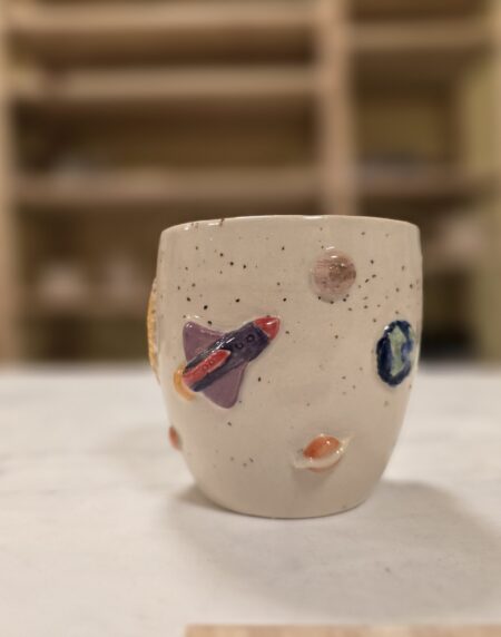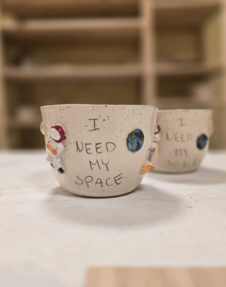 Håndlavet stentøjskop med rumtema og teksten “I need my space”. Dekoreret med planeter, astronauter og små kosmiske detaljer. Rummer ca. 3,5 dl – perfekt til kaffe, te eller kakao. Tåler opvaskemaskine og mikroovn.