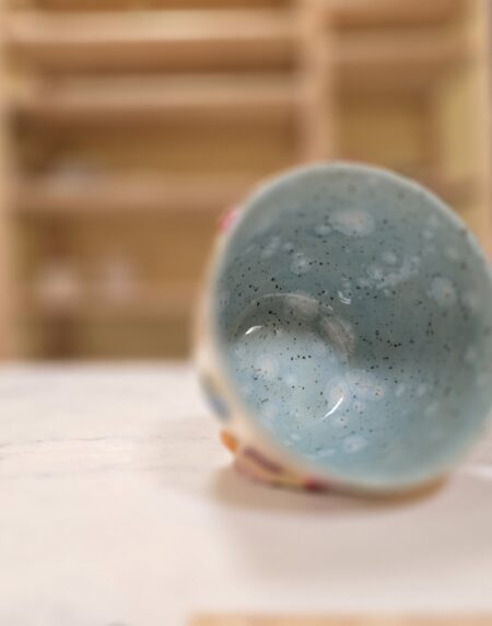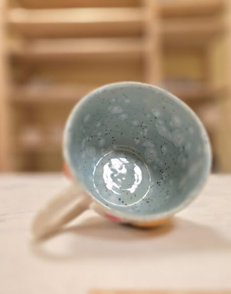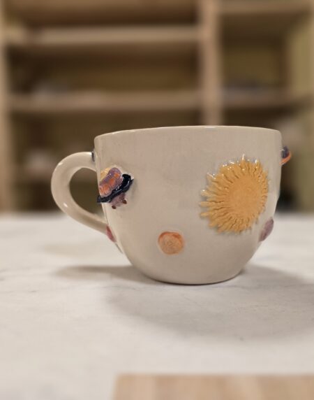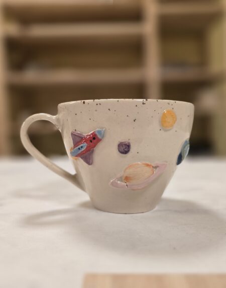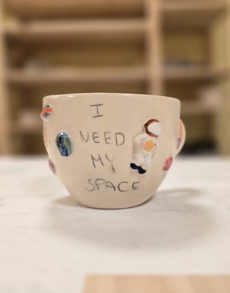Håndlavet keramikkop med planeter, raket, sol og teksten “I Need My Space”. Koppen rummer ca. 3,5 dl og er perfekt til kaffe, te eller en god stor latte. En humoristisk og farverig kop med masser af personlighed.