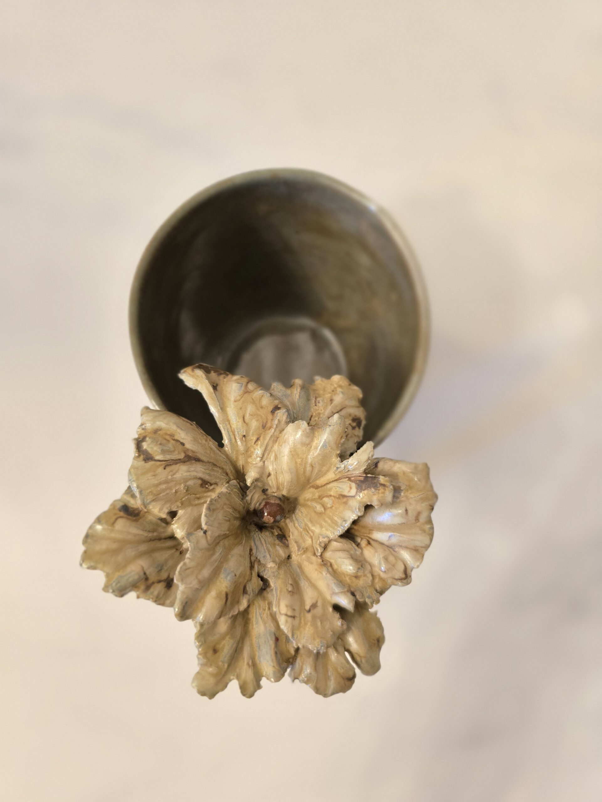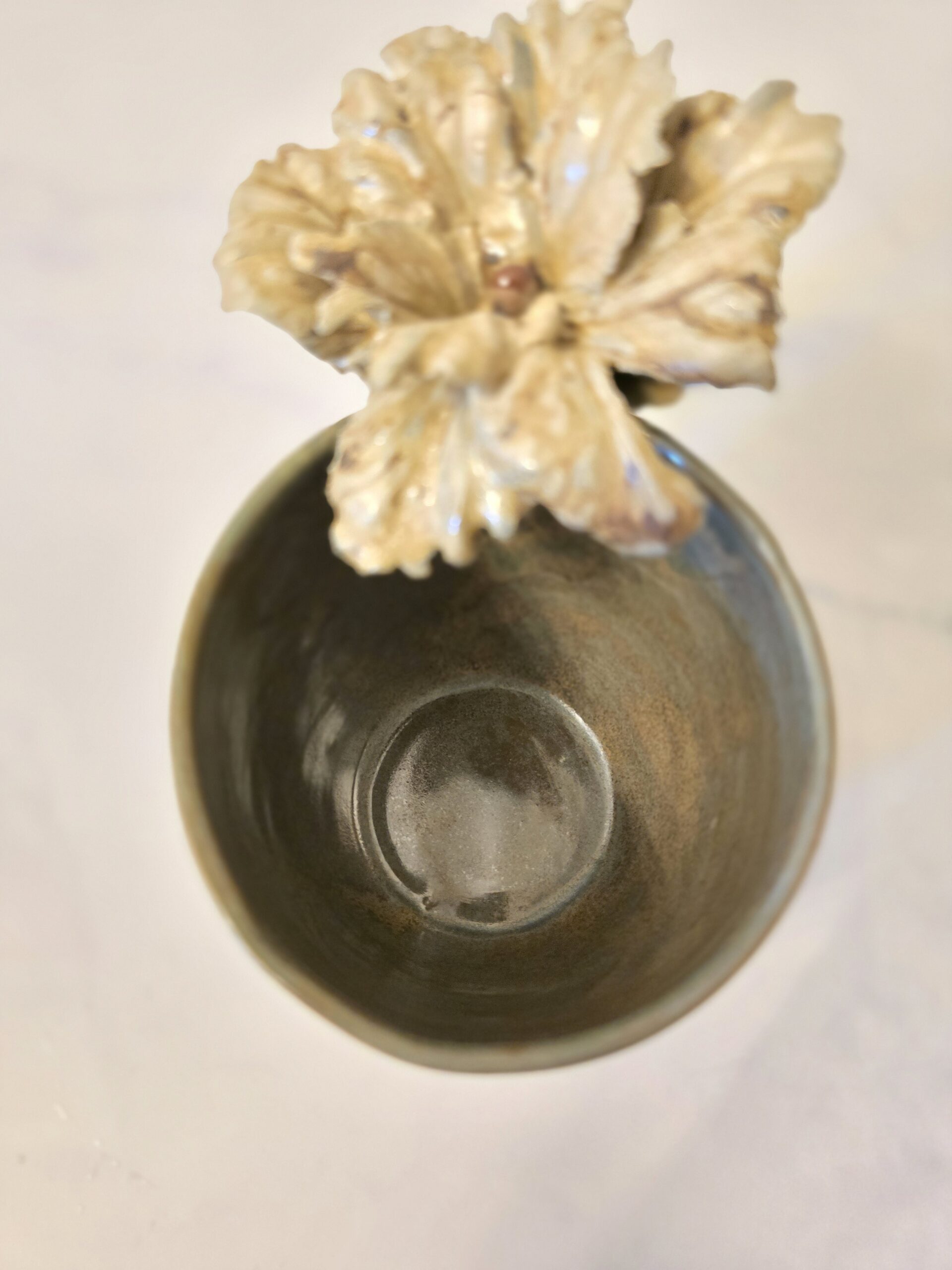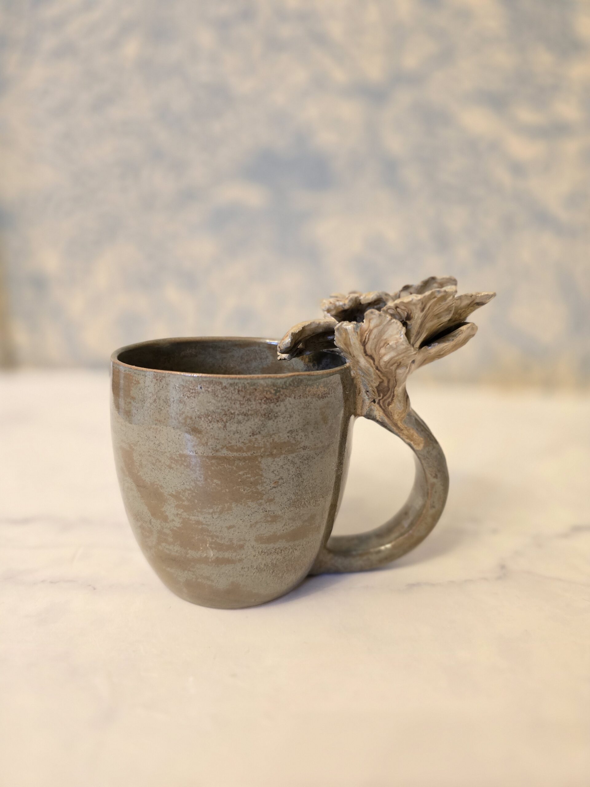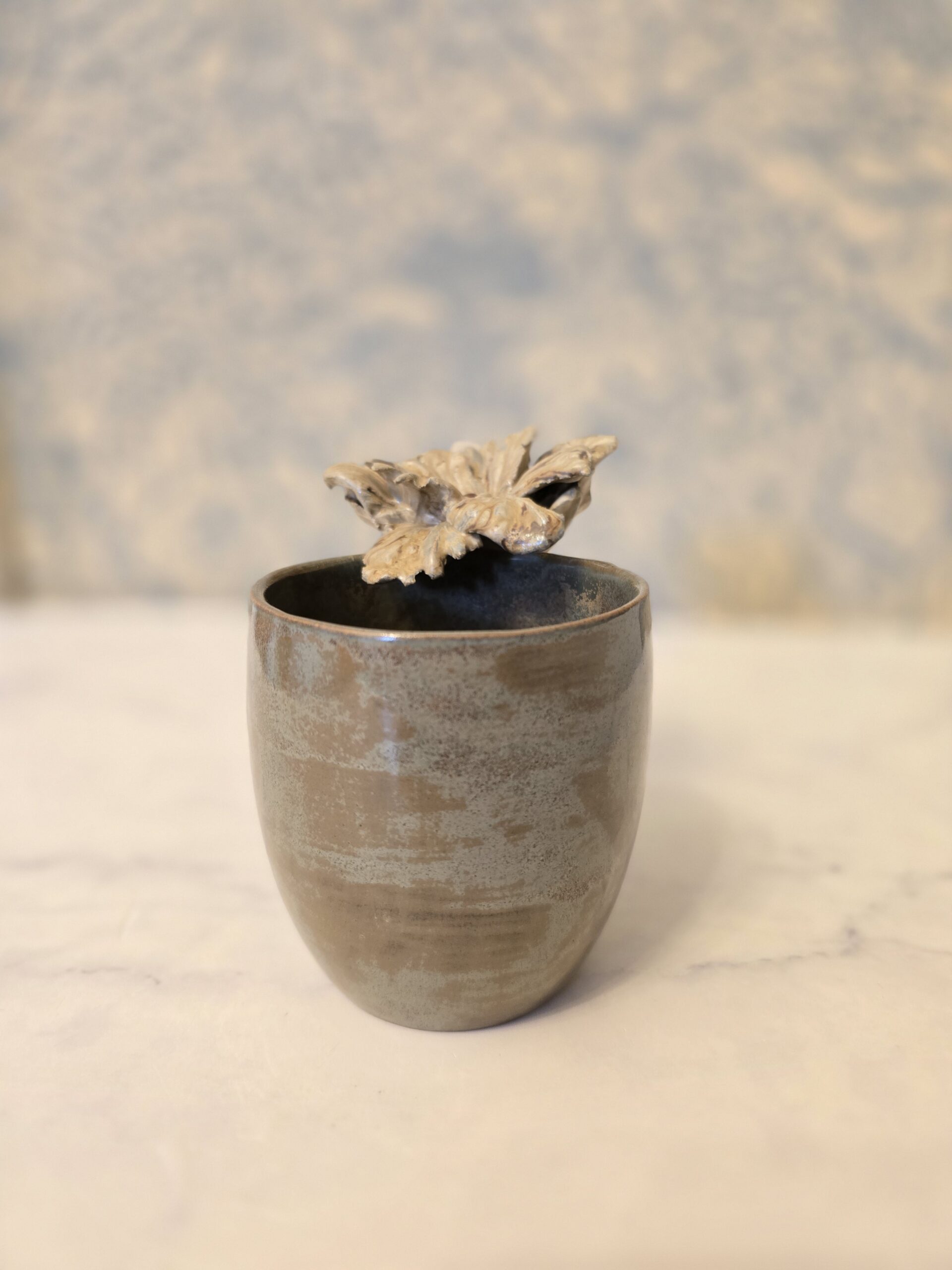 Denne unikke kop rummer ca. 3 dl og har en 3D-blomst som dekoration, hvilket giver et elegant og kunstnerisk udtryk.