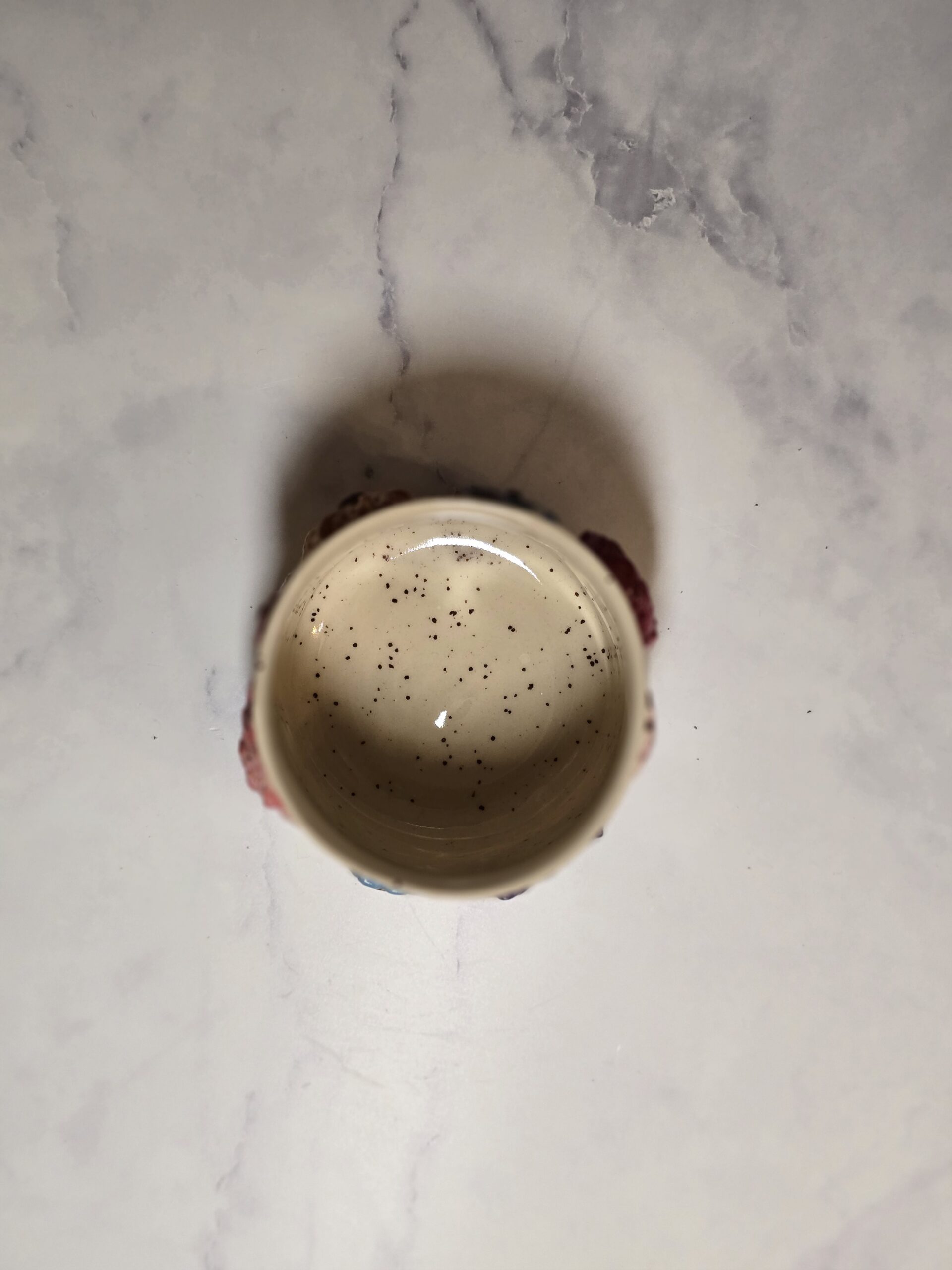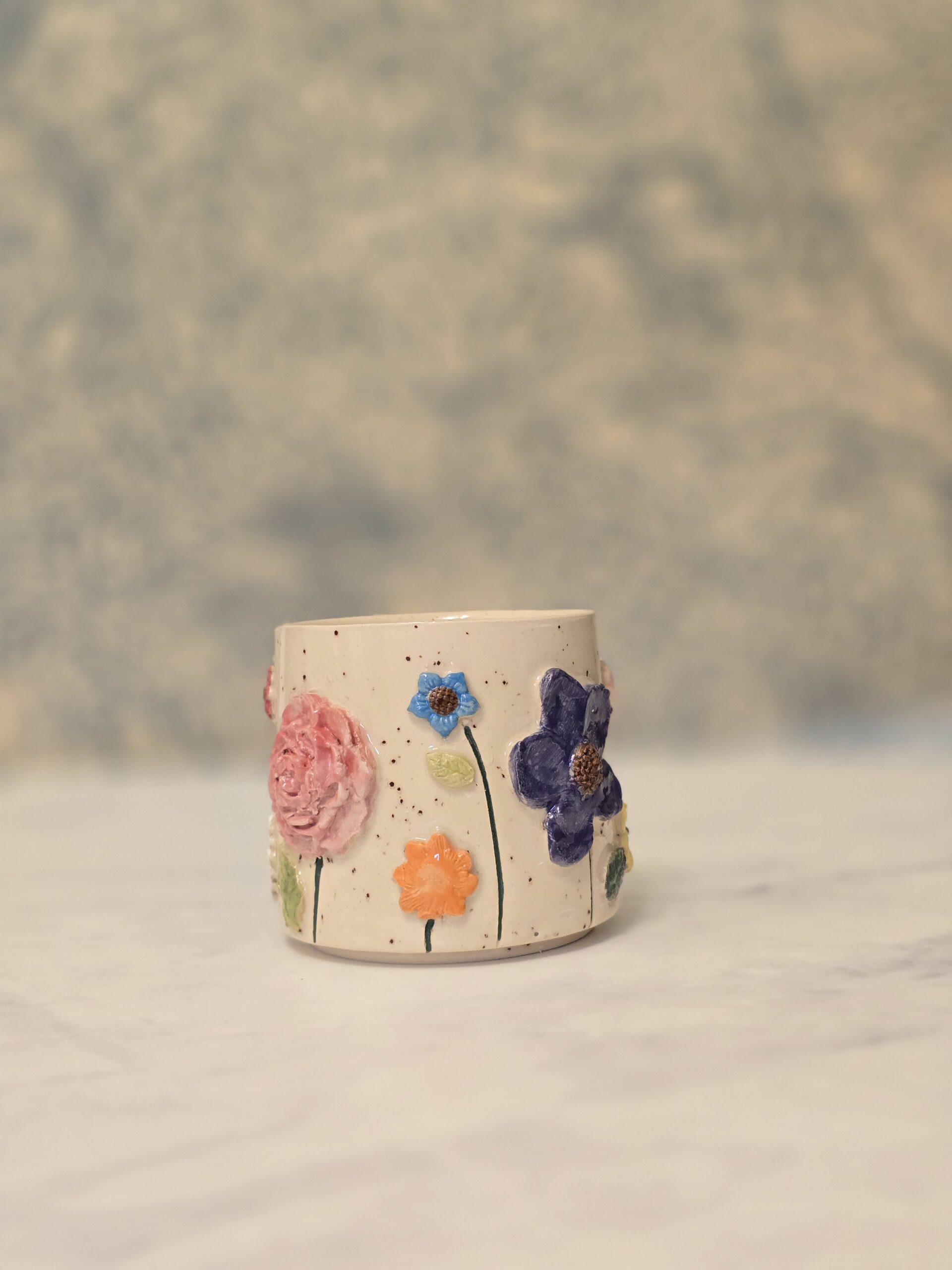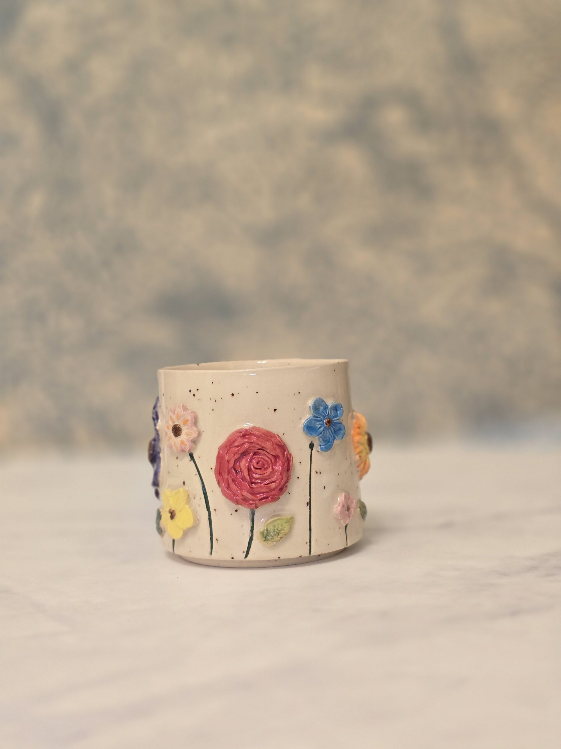 Koppen er dekoreret med farverige blomster, der tilføjer liv og charme. Den kan bruges til kaffe, te eller endda som en lille skål til snacks.