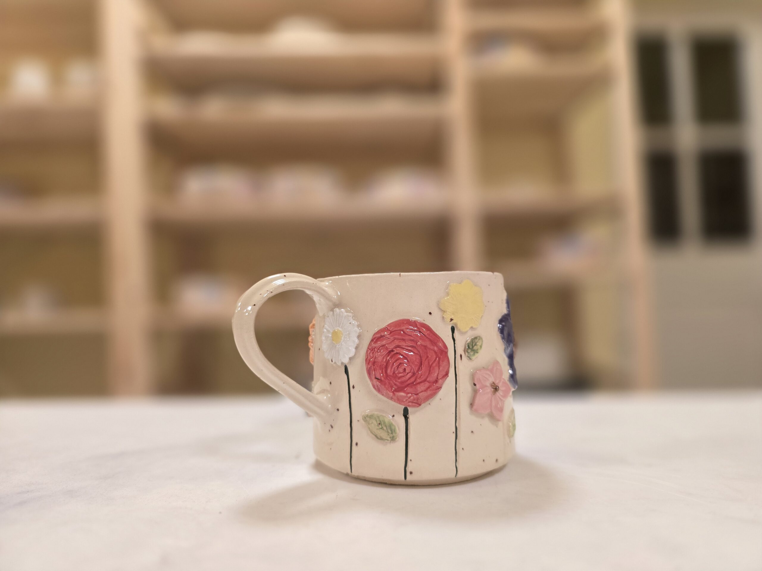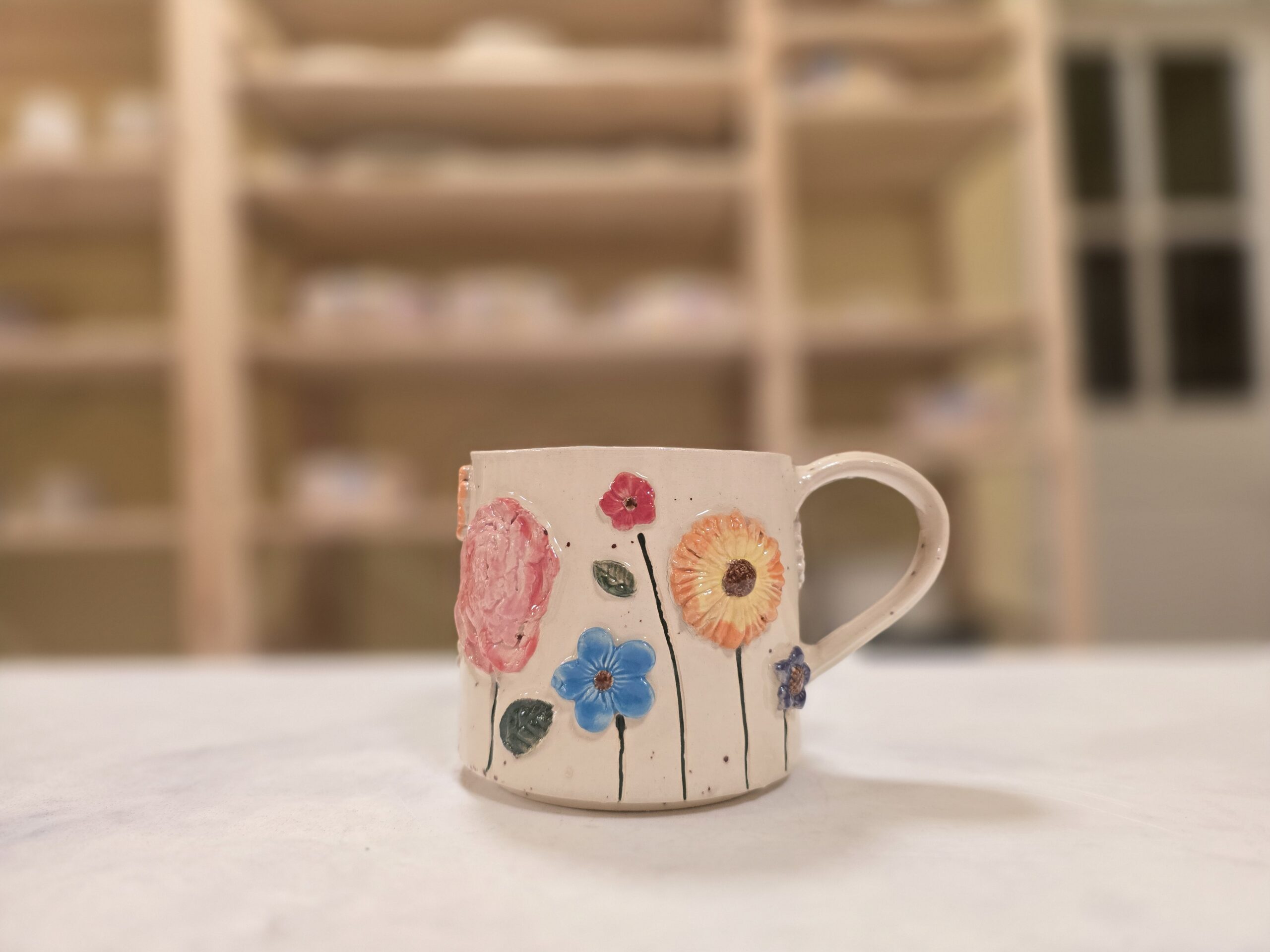 Denne farverige kop rummer ca. 3 dl og er perfekt til at nyde din yndlingsdrik. Udsmykket med smukke blomster og unikke lavapletter, samt en praktisk hank, tilføjer den liv og farve til dit bord.