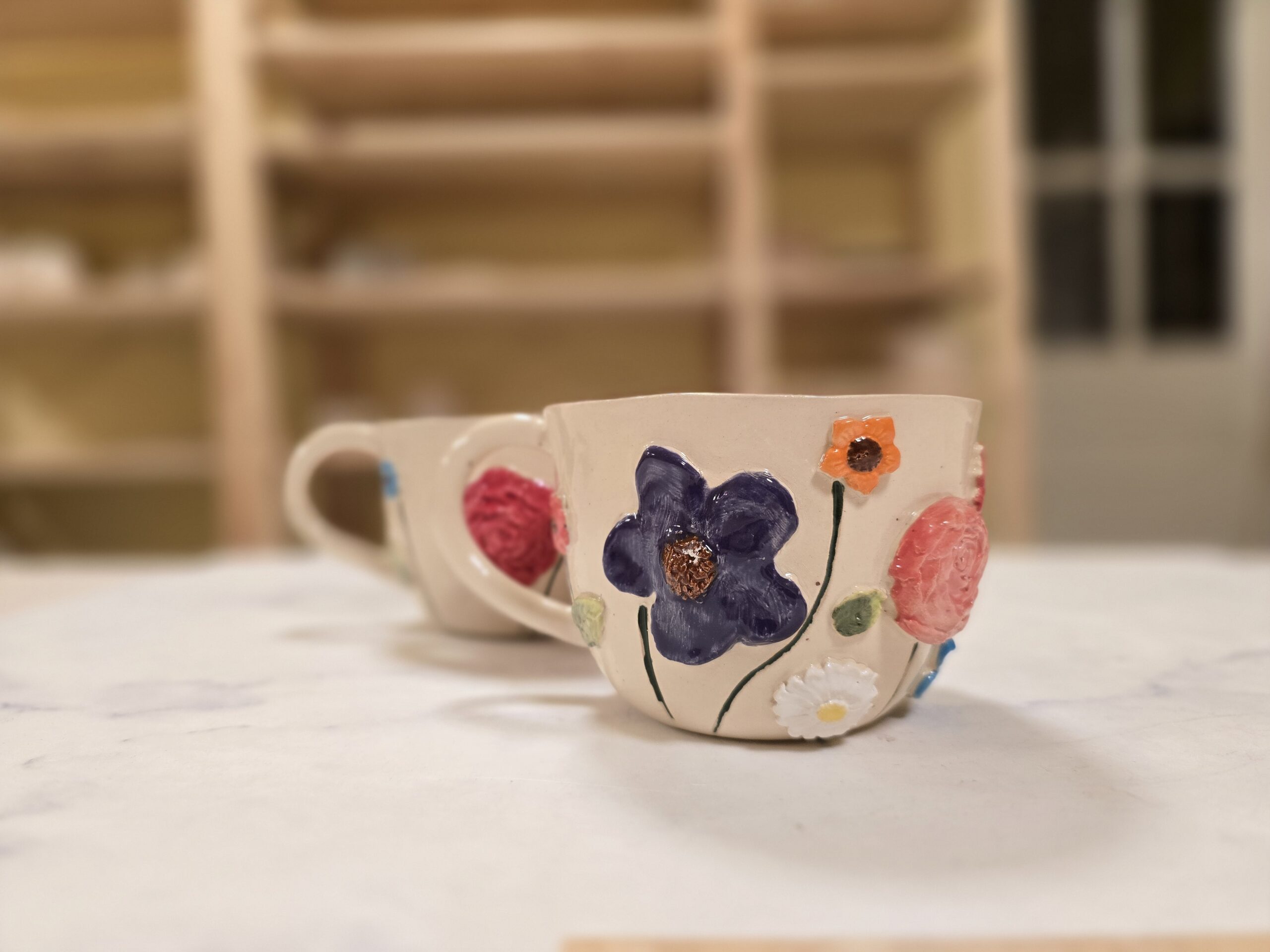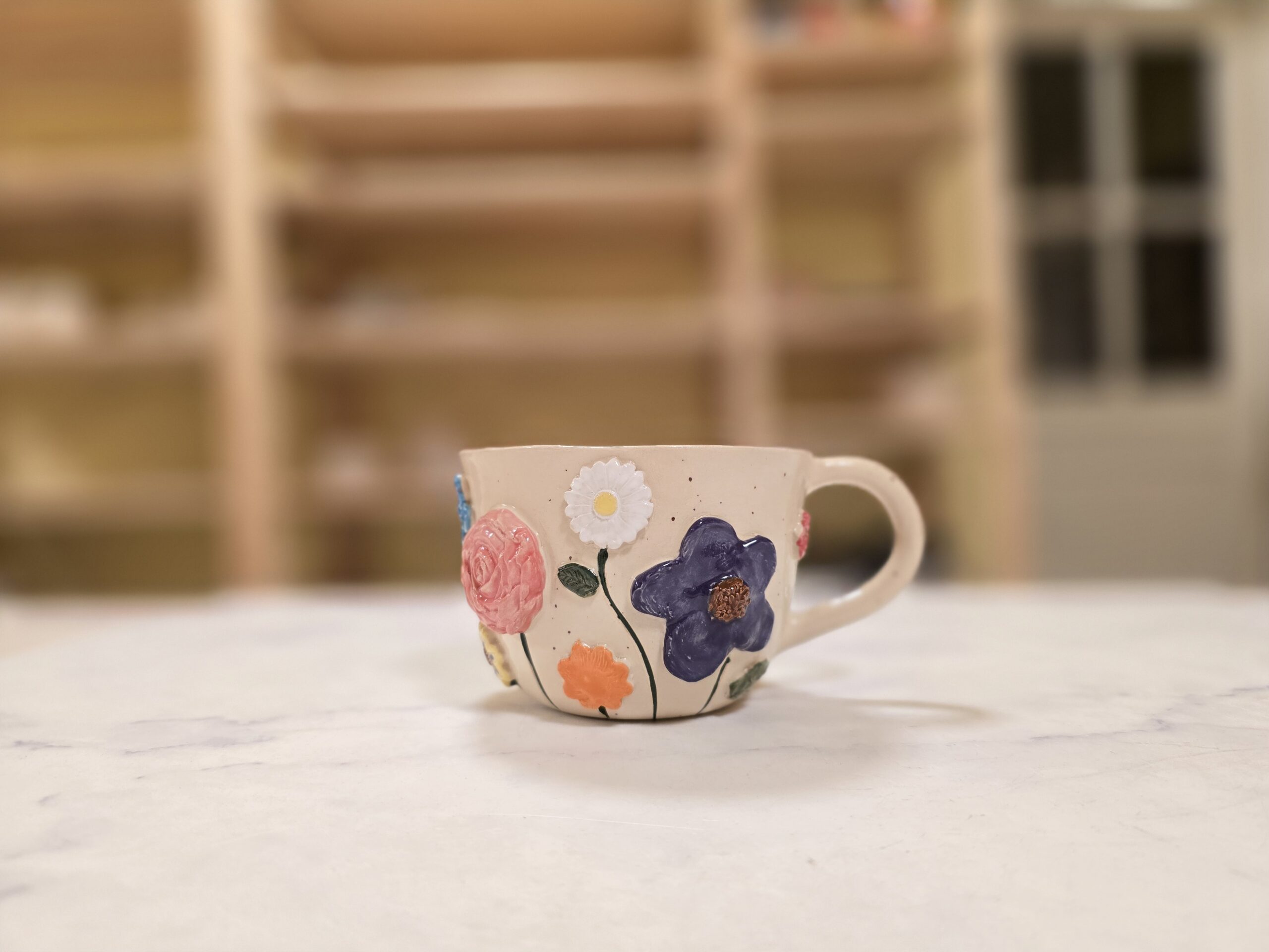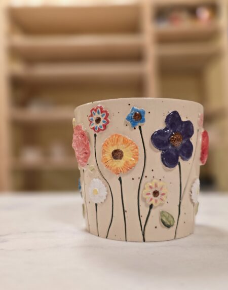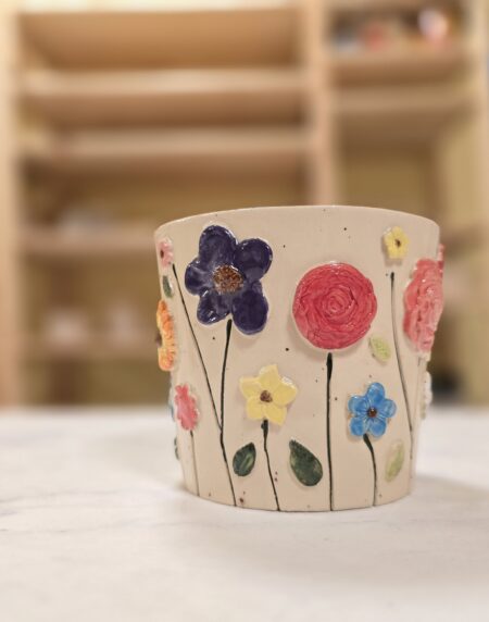 Denne håndlavede keramikkop rummer ca. 3,5 dl og er drejet i stentøj med en blød, organisk form. Rundt om koppen blomstrer håndmodellerede blomster i forskellige farver og former – fra dyb rosa og blå til solgul og hvid. Hver blomst er modelleret og påført i hånden, hvilket gør hver kop helt unik.