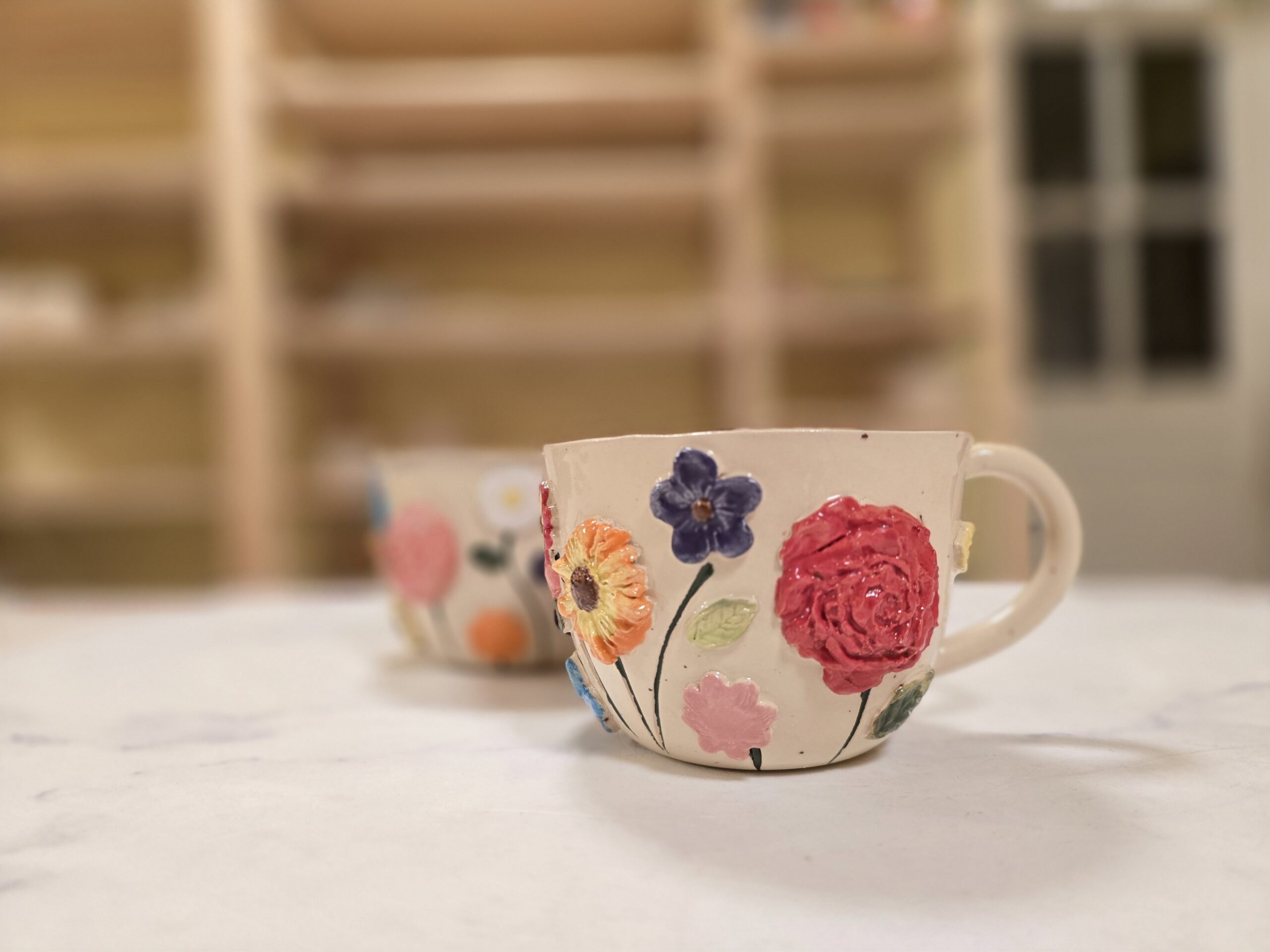 Den cremefarvede bund giver ro, mens blomsterne skaber liv og bevægelse. Det er en kop, der føles både legende og stærk på samme tid.