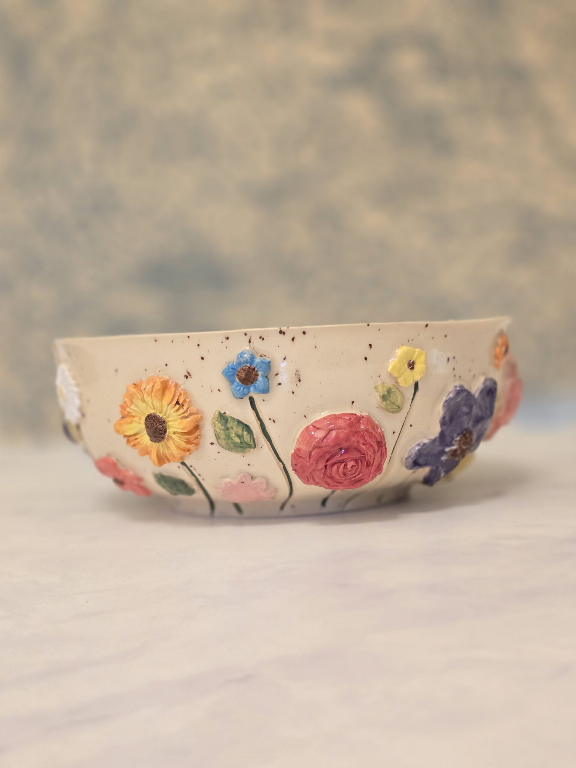 Denne smukke skål har en unik blomsterdekoration og en neutral farve med små sorte prikker. Den er ideel til servering af salater, snacks eller som en dekorativ genstand i hjemmet.