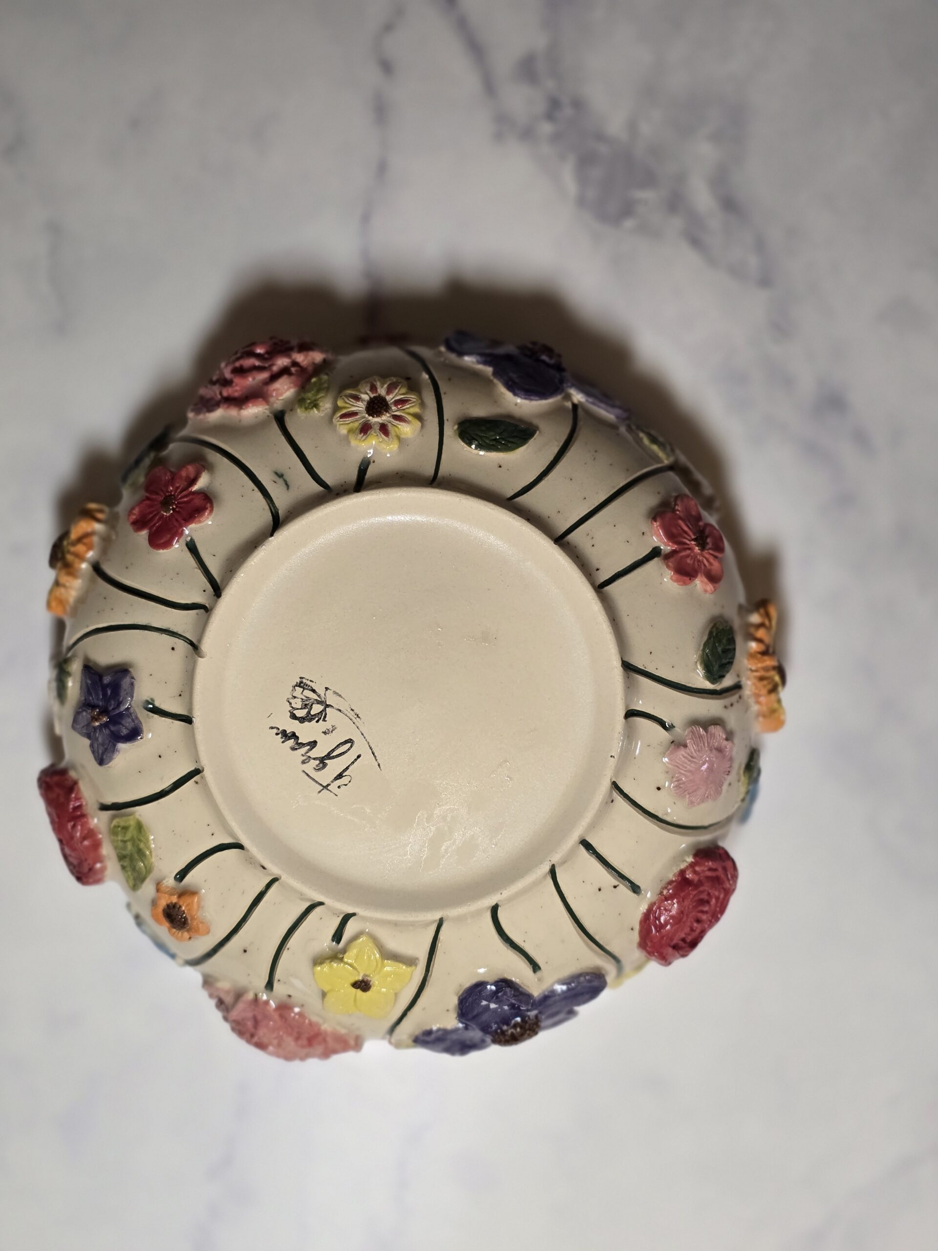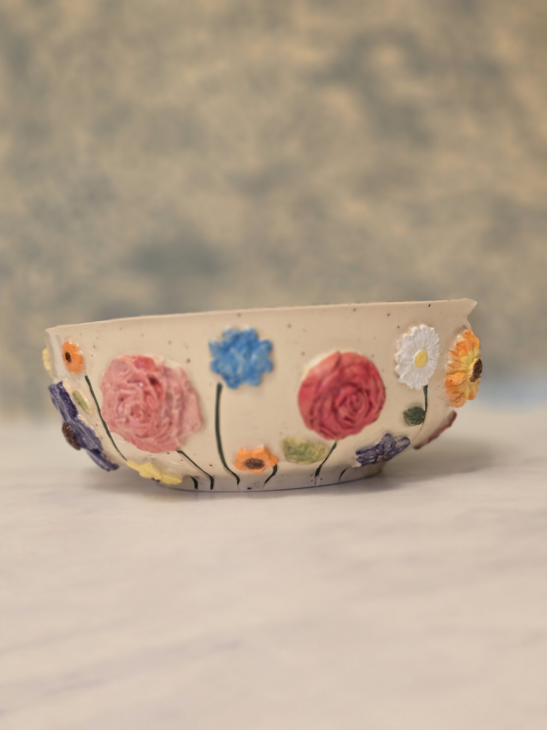 Oplev denne charmerende skål, der kombinerer funktionalitet med et kunstnerisk udtryk. Den har en elegant form og er dekoreret med farverige blomster, herunder solsikker, roser og små blomster, der tilføjer liv og farve til ethvert bord.