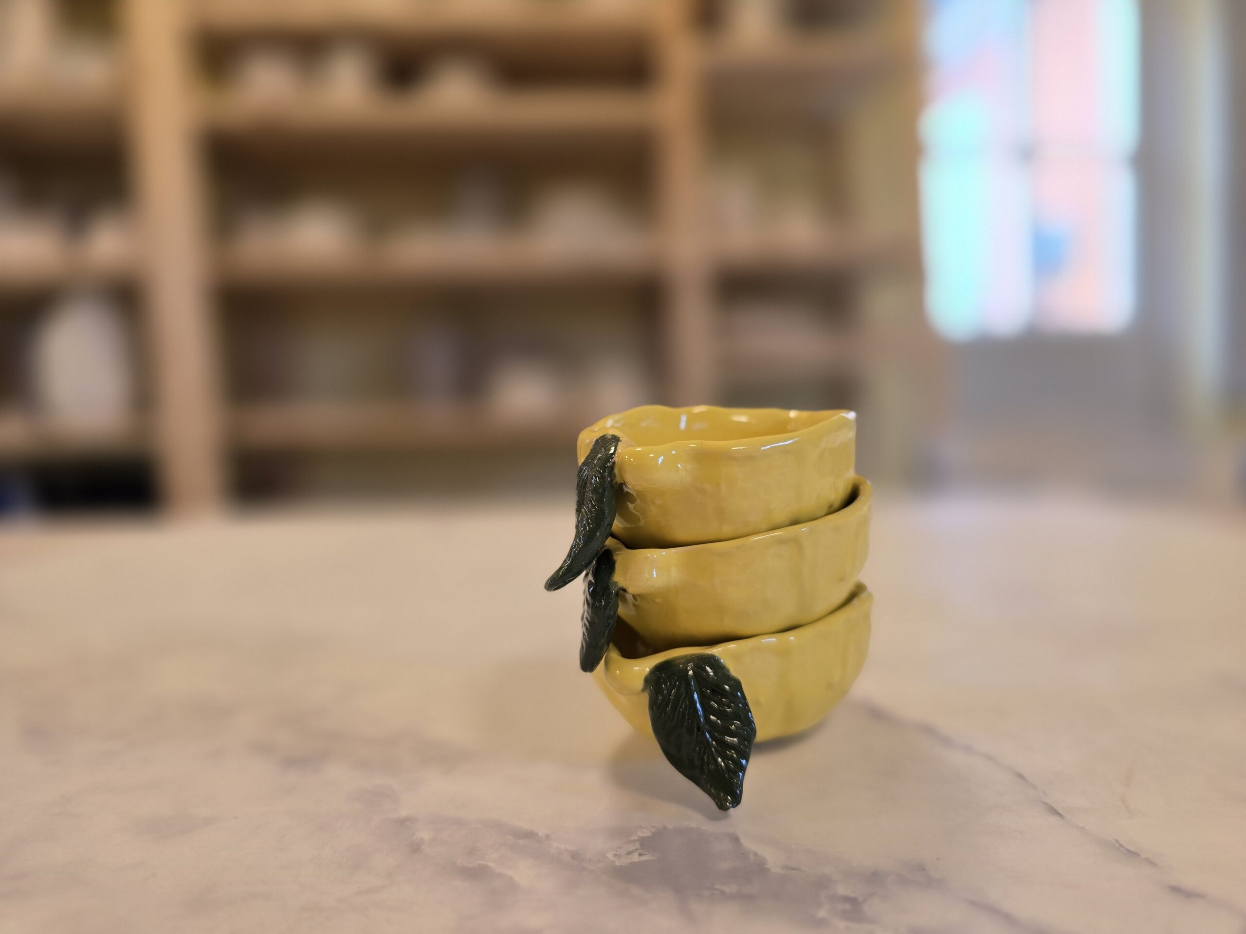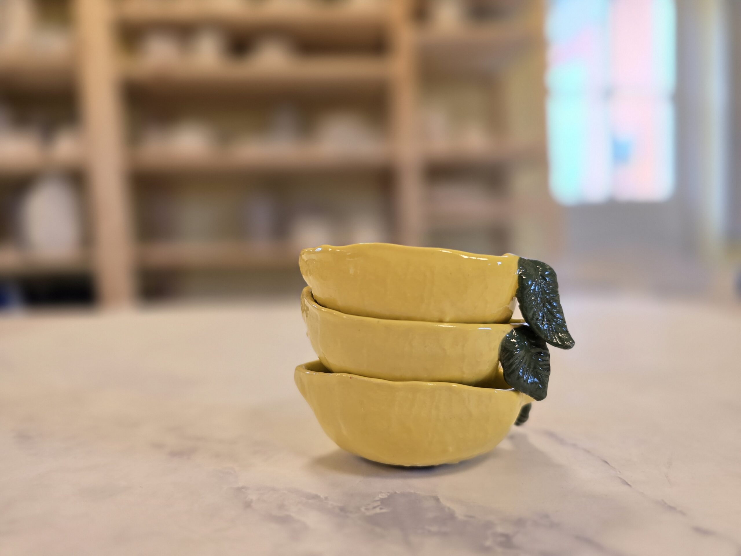 Denne lille citronskål er både funktionel og dekorativ – formet som en citron med en varm, gul glasur og fine grønne blad-detaljer, der giver den et frisk og legende udtryk.