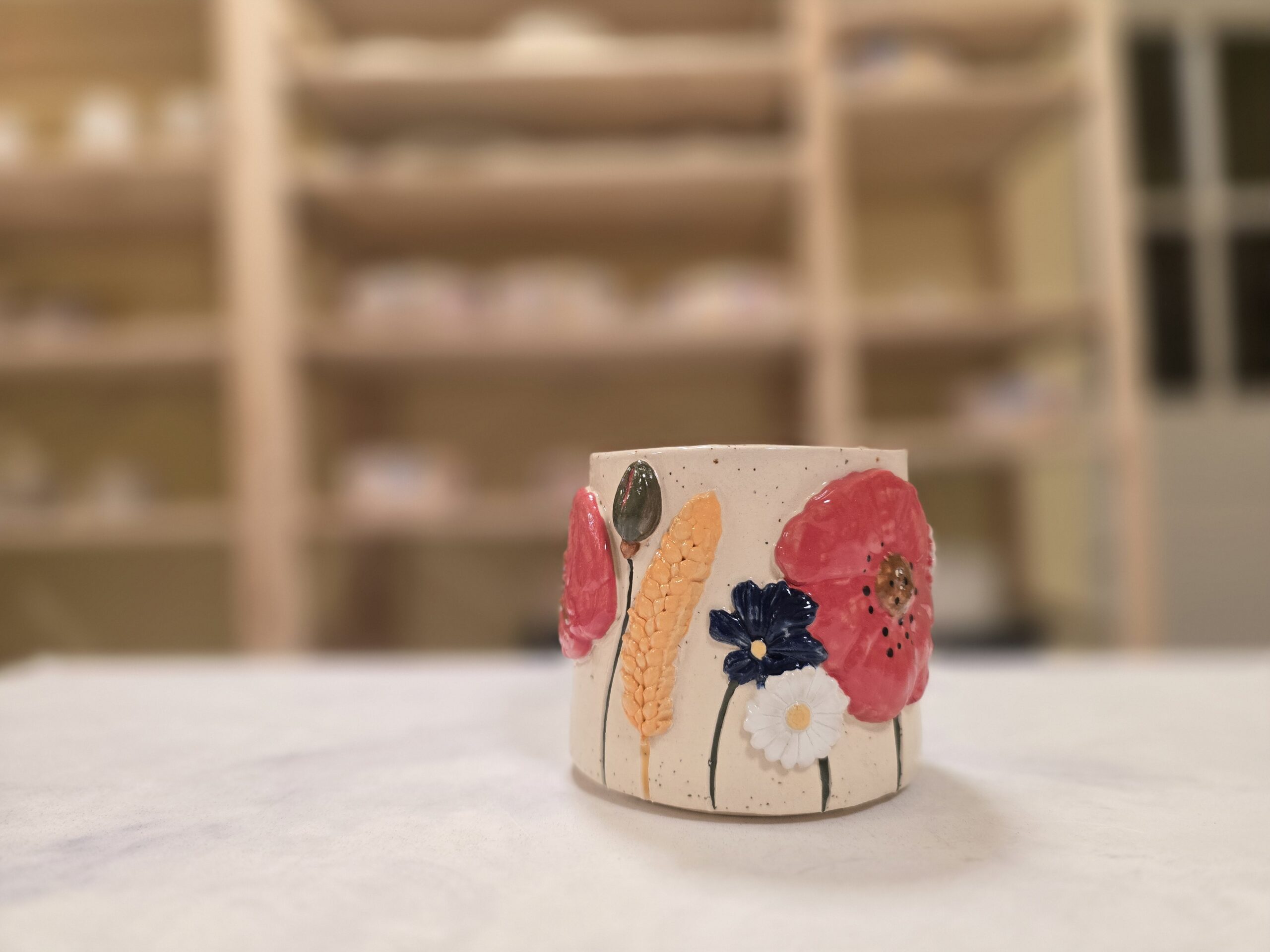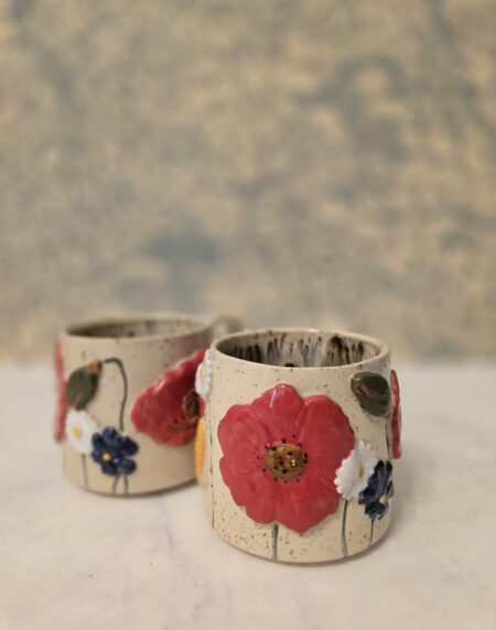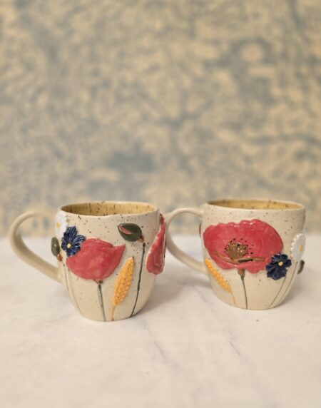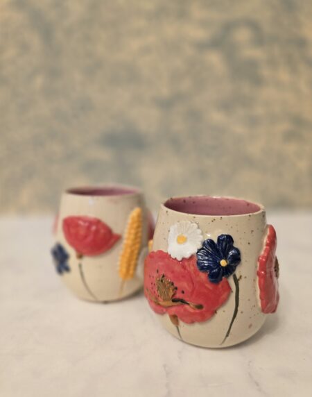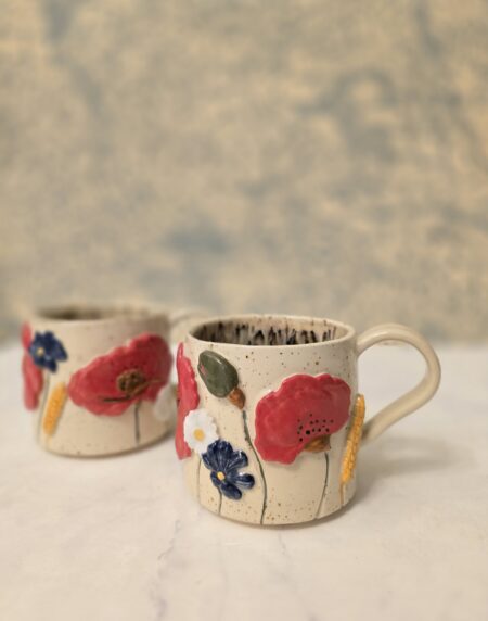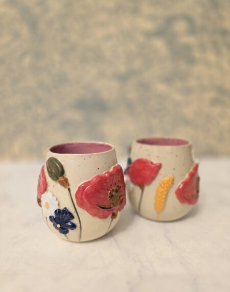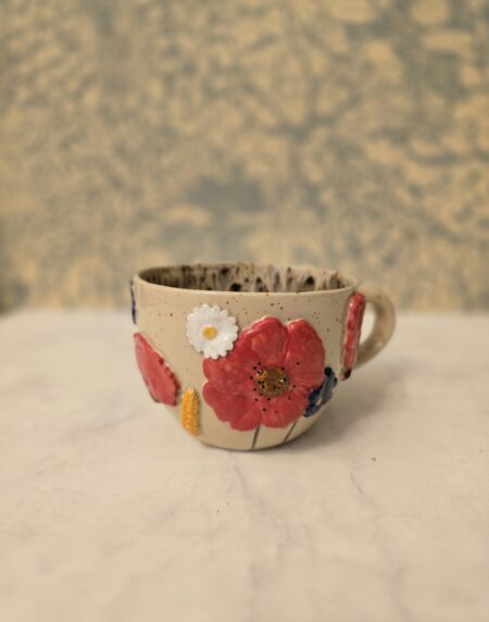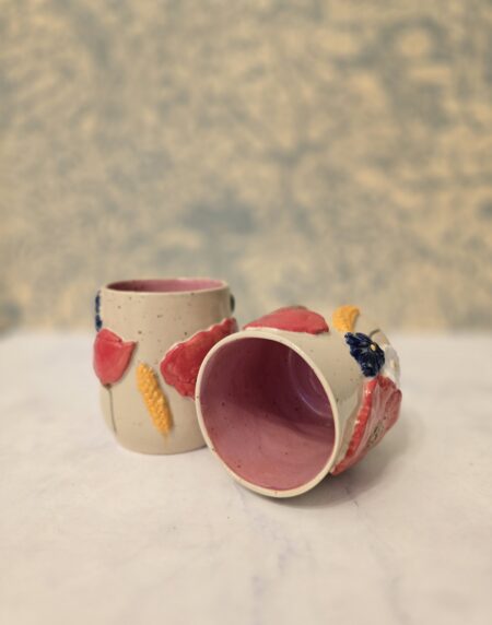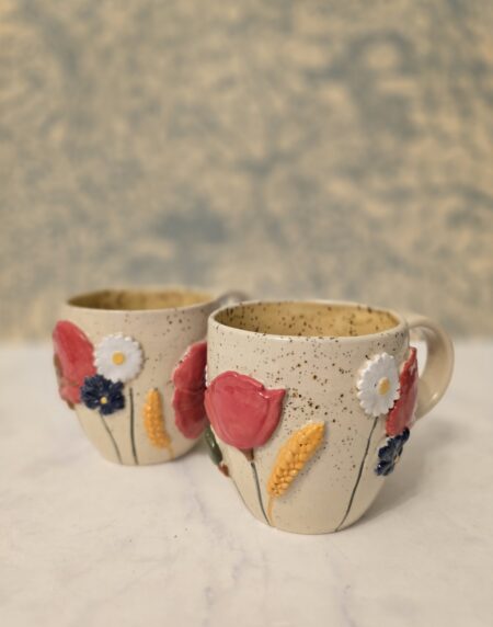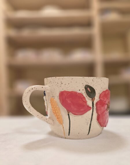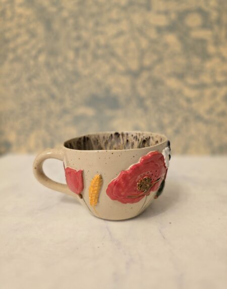 Denne håndlavede keramikkop er en del af serien Høst – inspireret af sensommerens marker, blomster og den rolige overgang mod efterår. Koppen er dekoreret med blomster og korn i relief, hvor de varme farver og organiske former giver et levende og sanseligt udtryk.