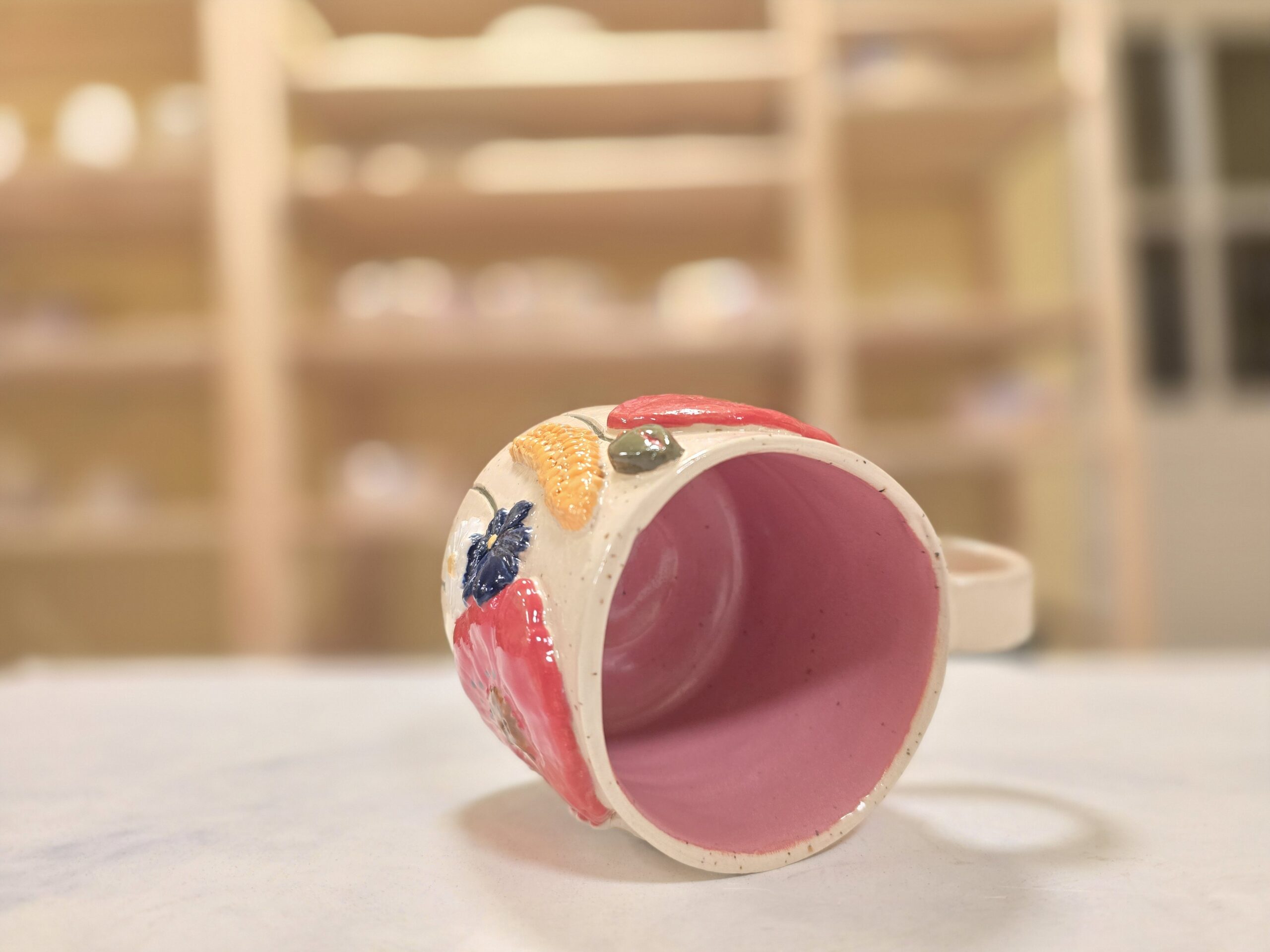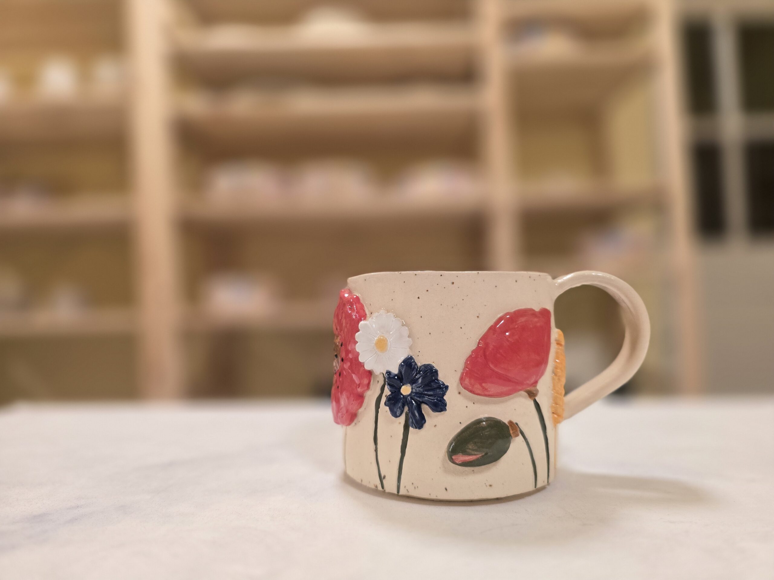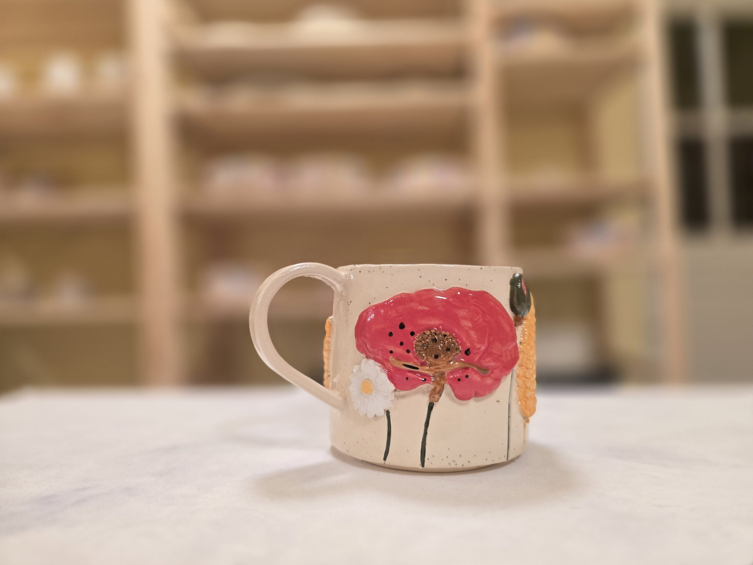 Denne håndlavede keramikkop er en del af serien Høst – inspireret af sensommerens marker, blomster og den rolige overgang mod efterår. Koppen er dekoreret med blomster og korn i relief, hvor de varme farver og organiske former giver et levende og sanseligt udtryk.