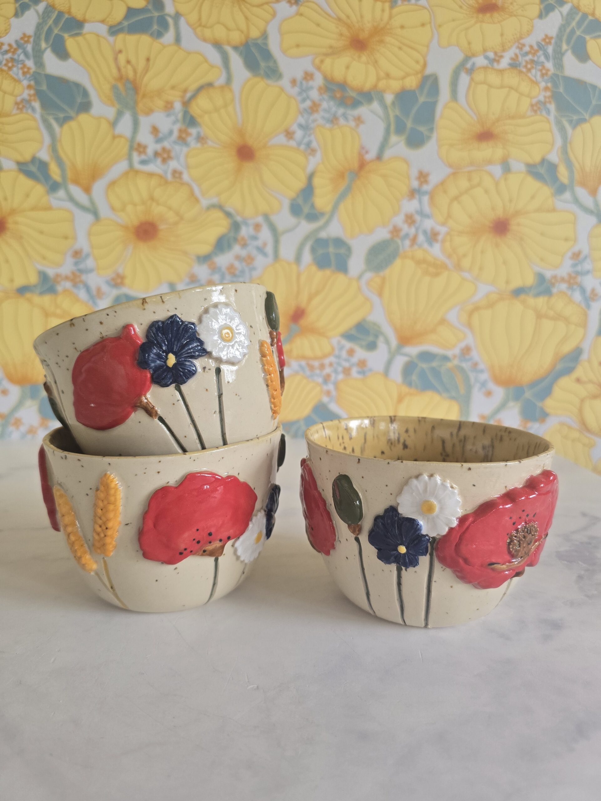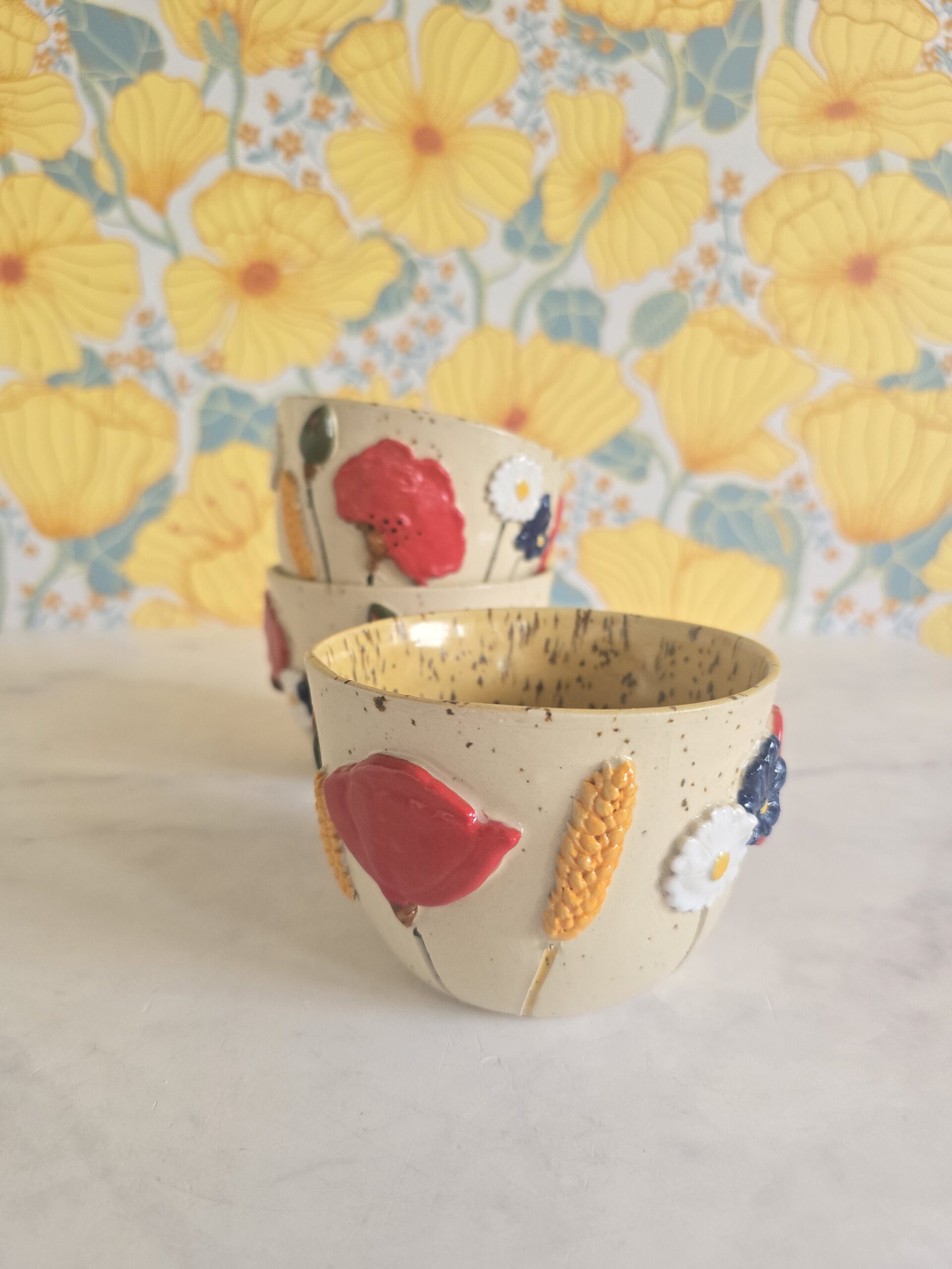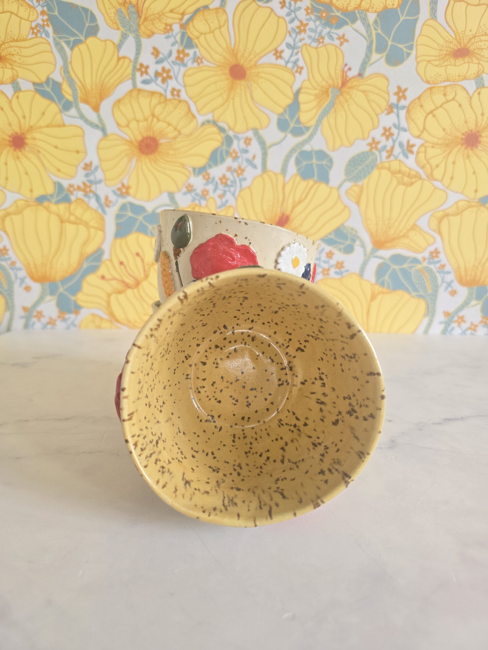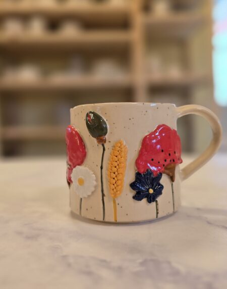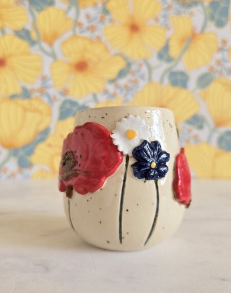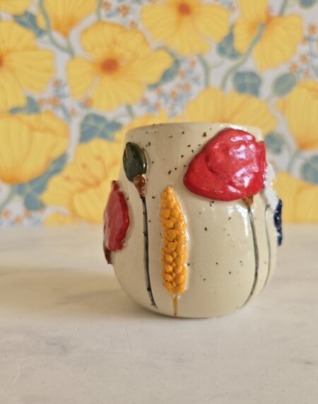 Denne kop er en del af serien Høst – inspireret af sensommerens blomster og de varme, gyldne nuancer i naturen. De små blomster og detaljer snor sig rundt om koppen og skaber et levende og legende udtryk, der gør hver kop helt særlig.