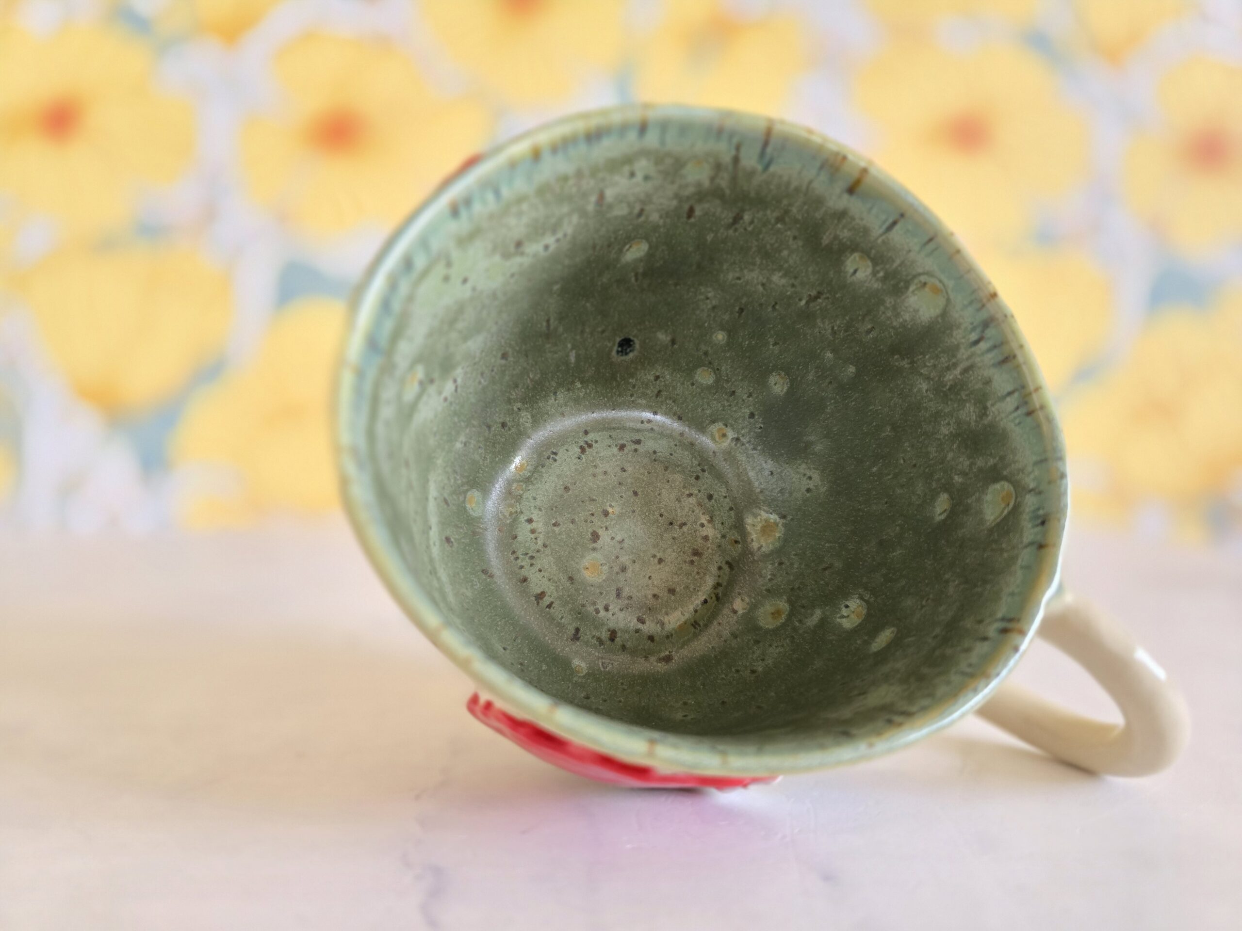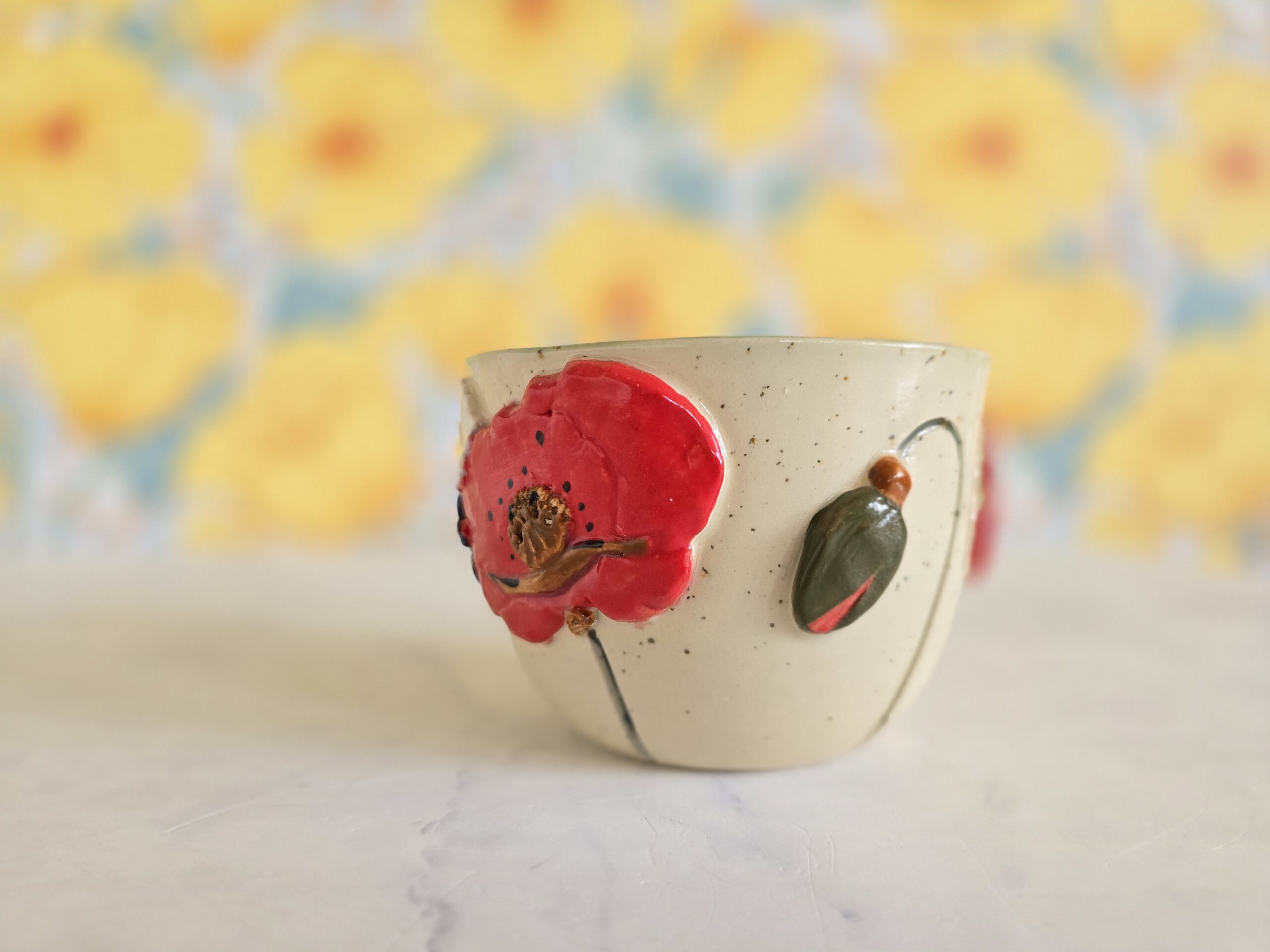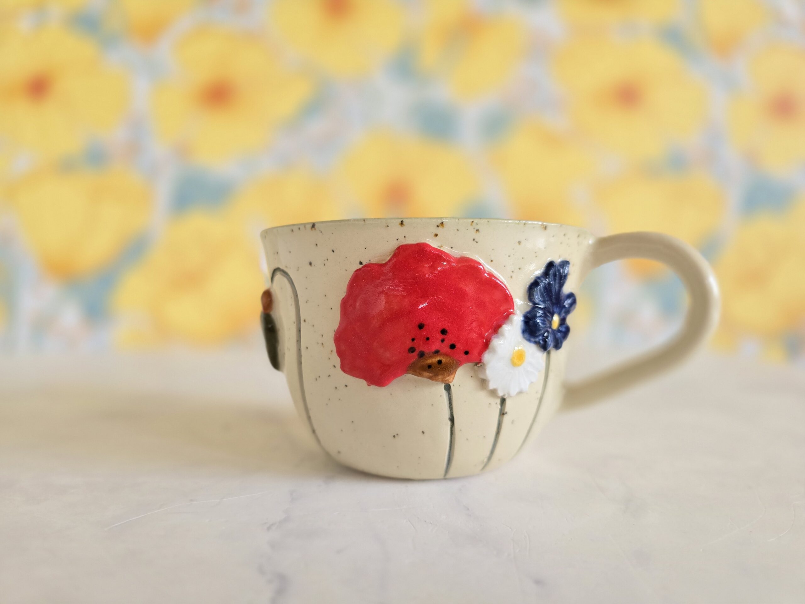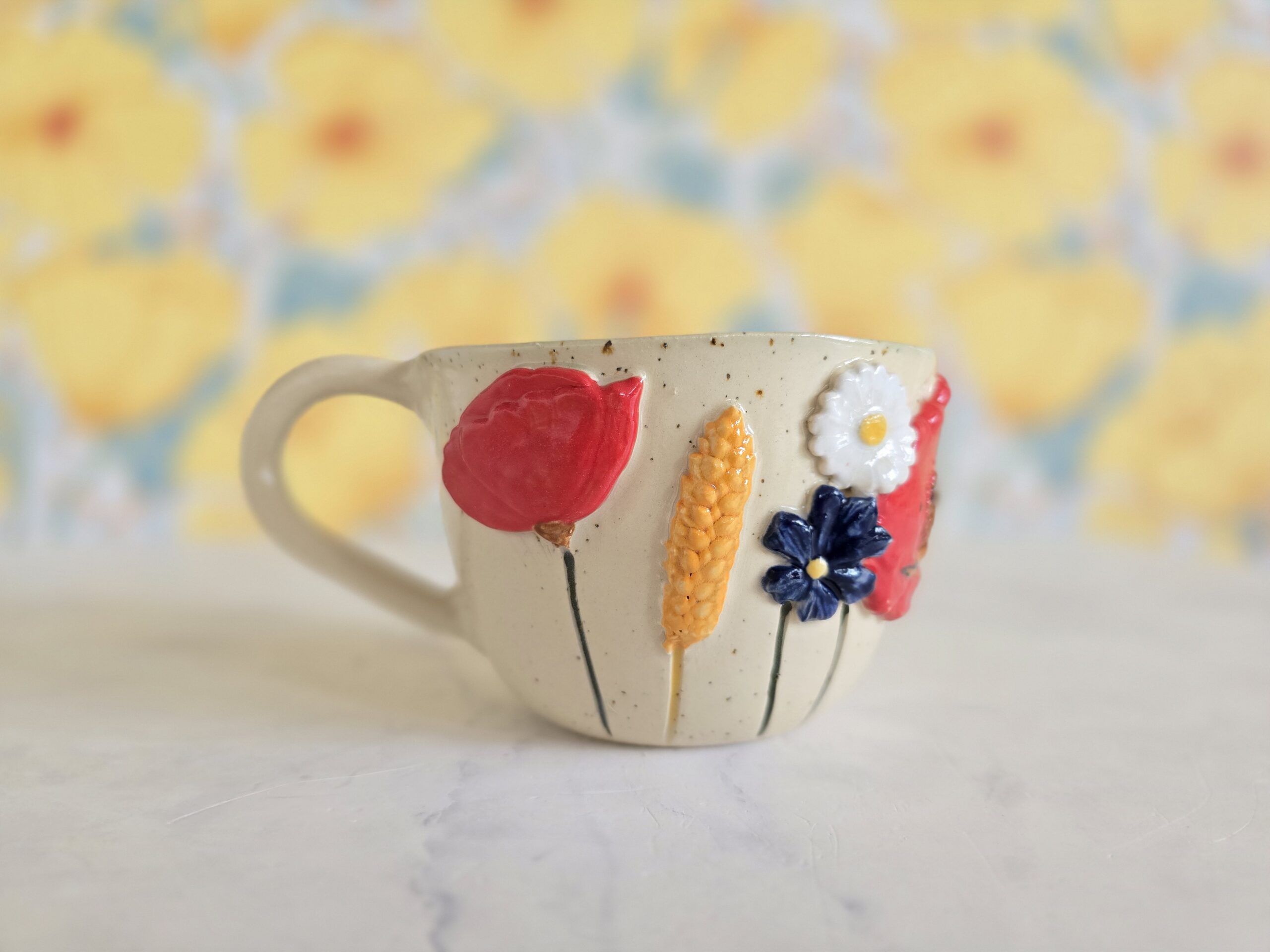 Koppen er dekoreret med håndmodellerede blomster og aks i varme høstfarver – rød, blå, hvid og gylden – i relief på den lyse, prikkede bund. Indersiden har en smuk grøn glasur med naturligt farvespil og små levende variationer.
