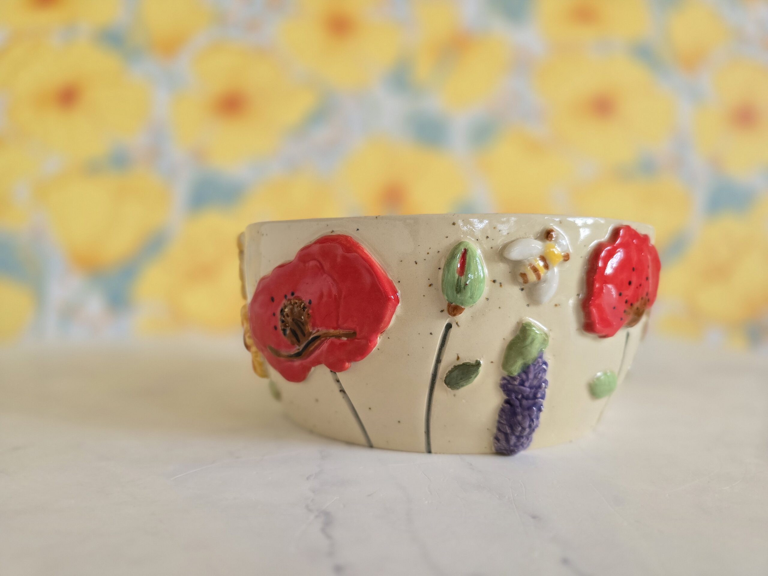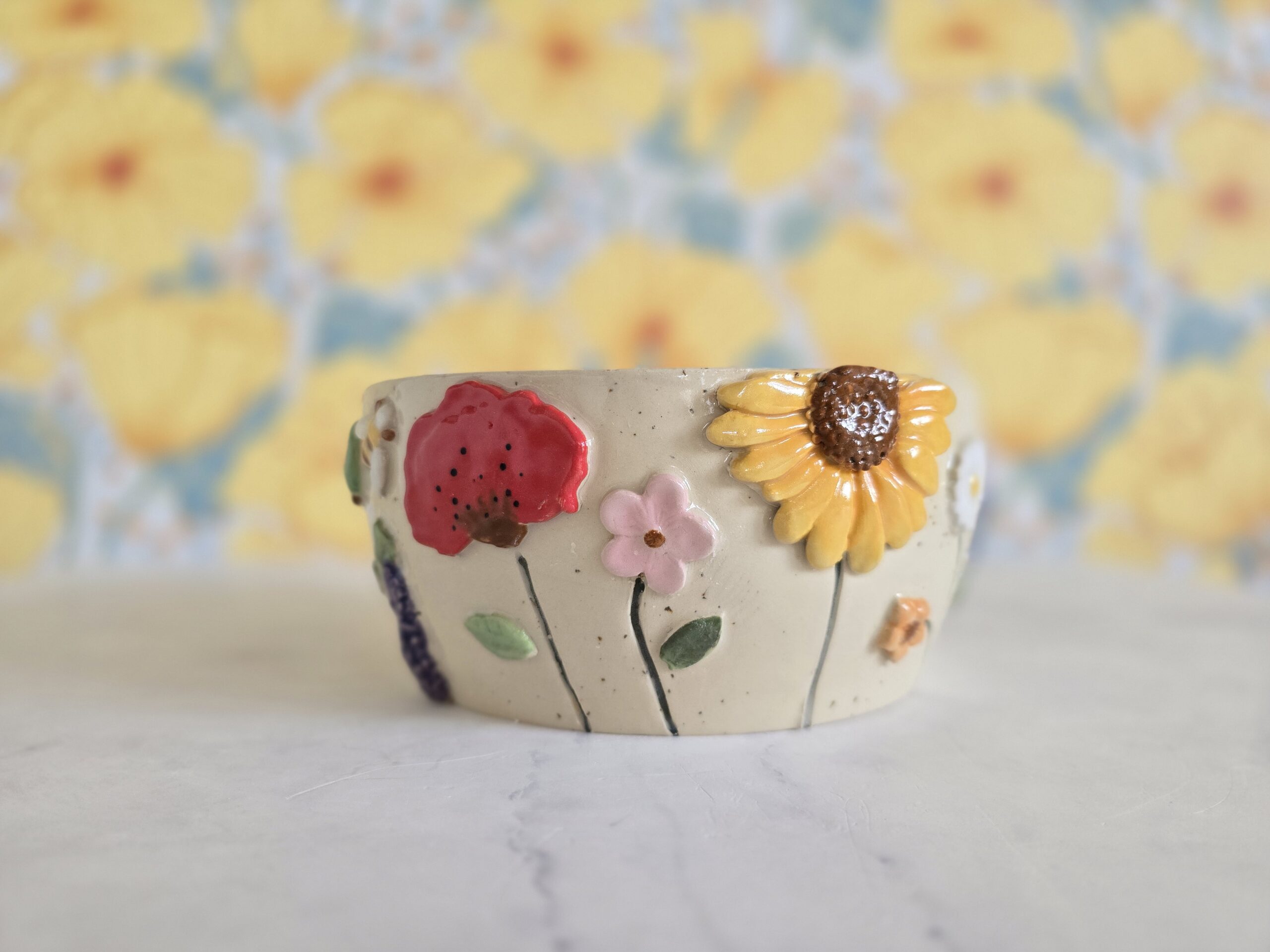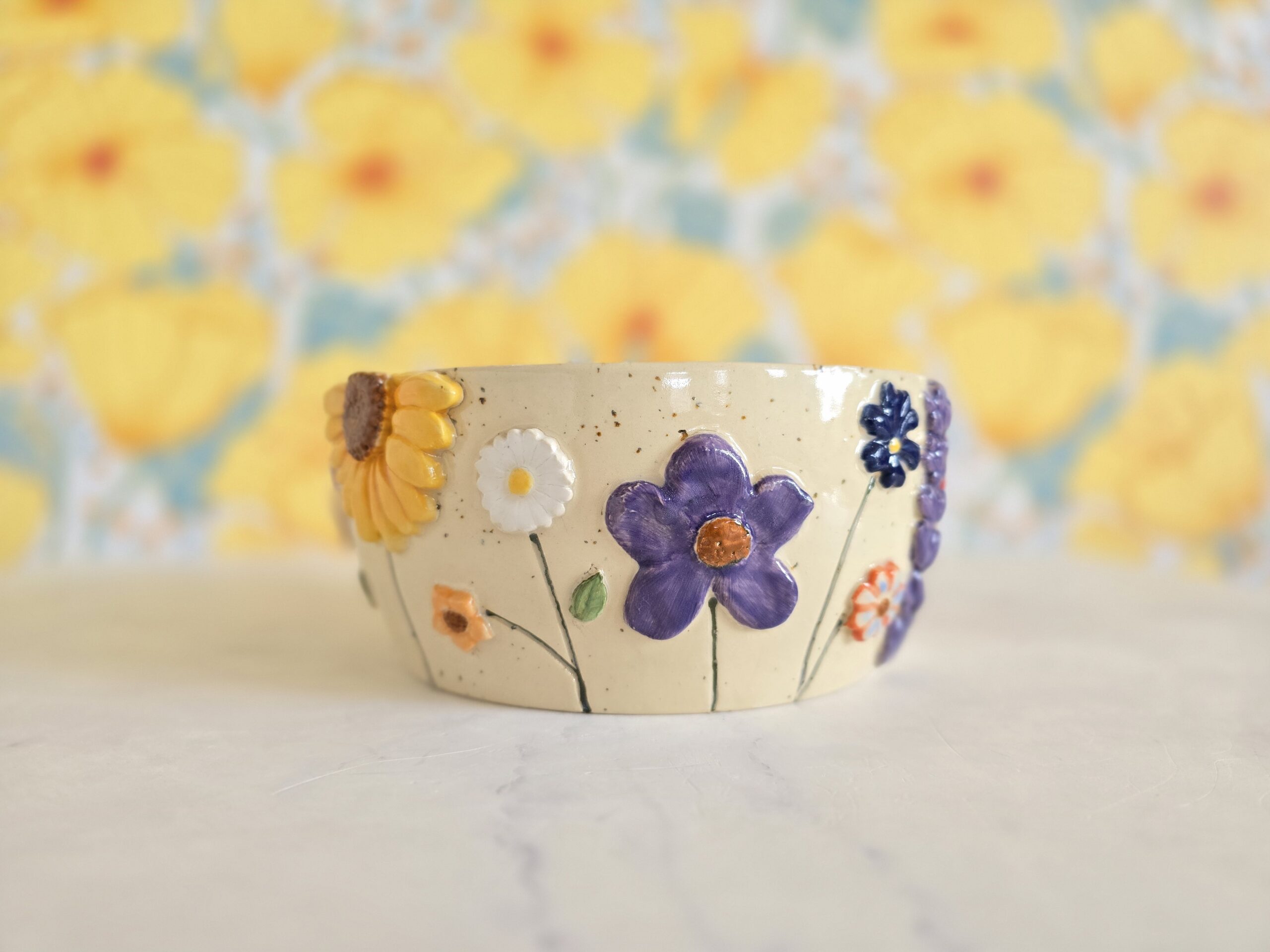 Denne håndlavede skål fra Gram Keramik er dekoreret med farverige blomster i relief – solsikke, valmue, lavendel og små markblomster – modelleret og påsat i hånden. Den cremefarvede, let prikkede ler giver en rolig bund, mens de levende blomster skaber dybde og bevægelse hele vejen rundt.