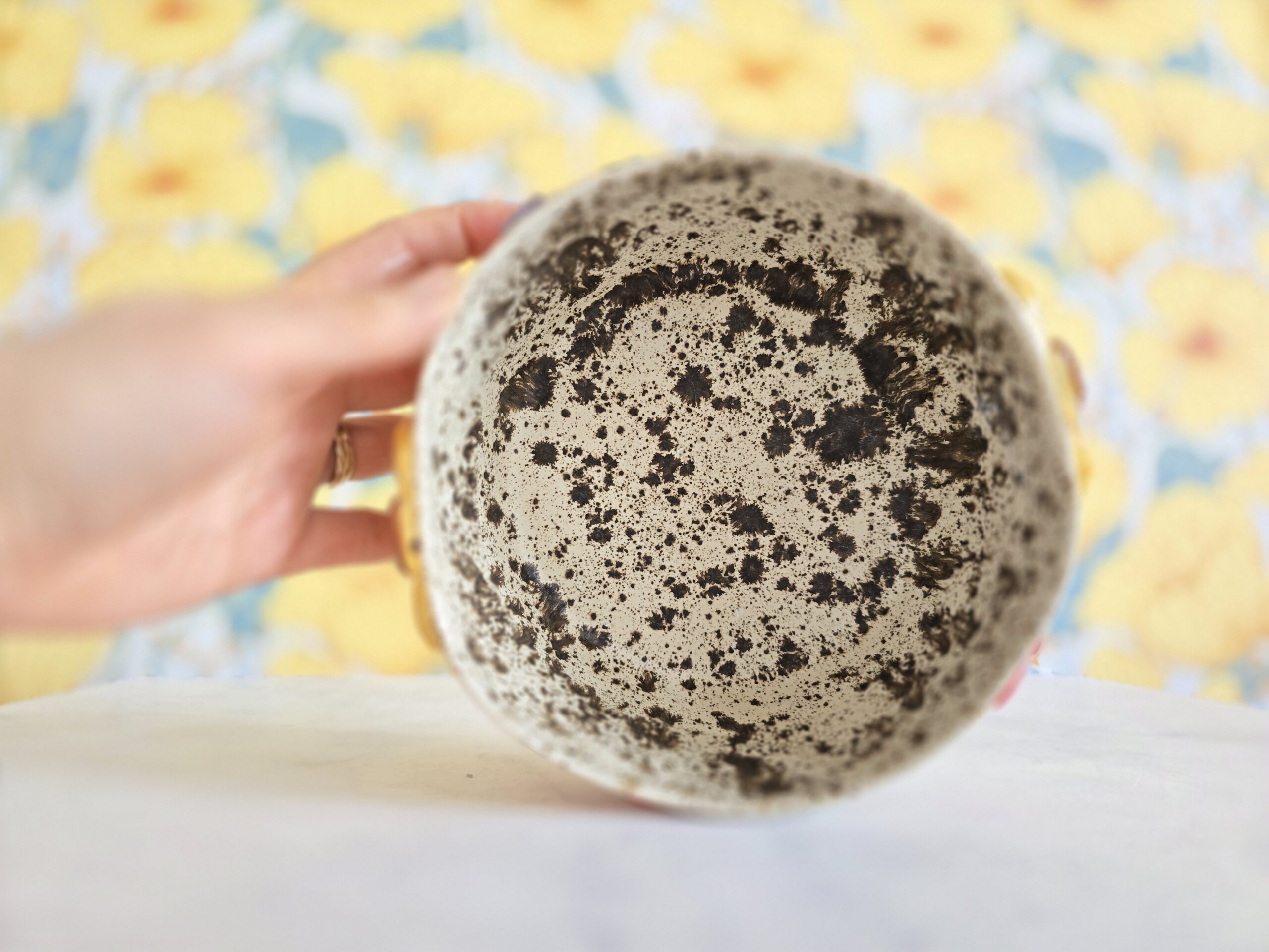 Indvendigt har skålen en mere rå og spraglet glasur med mørke spil, som giver et organisk og næsten stenet udtryk. Kontrasten mellem den vilde inderside og de farverige blomster gør skålen både kunstnerisk og karakterfuld.