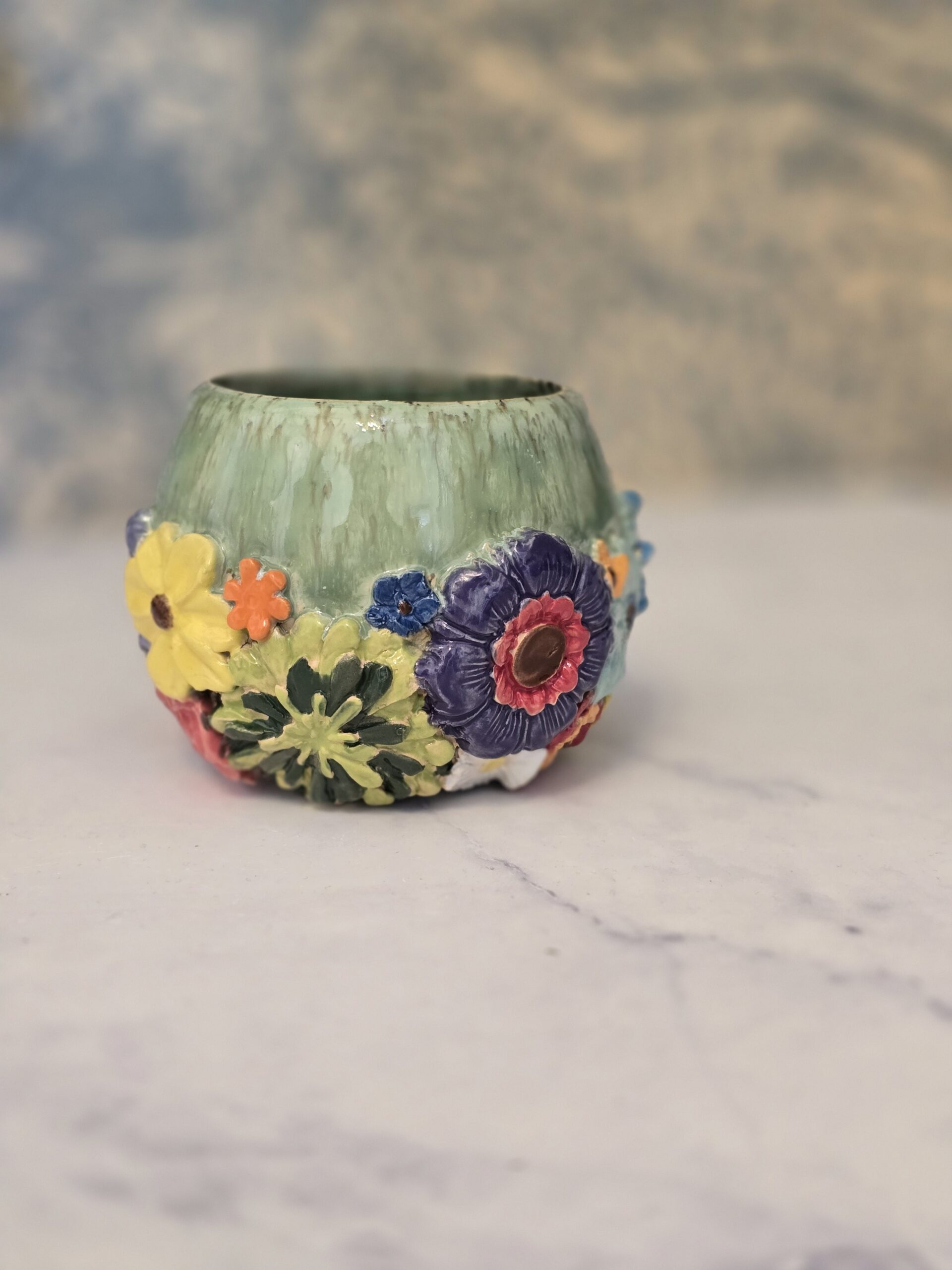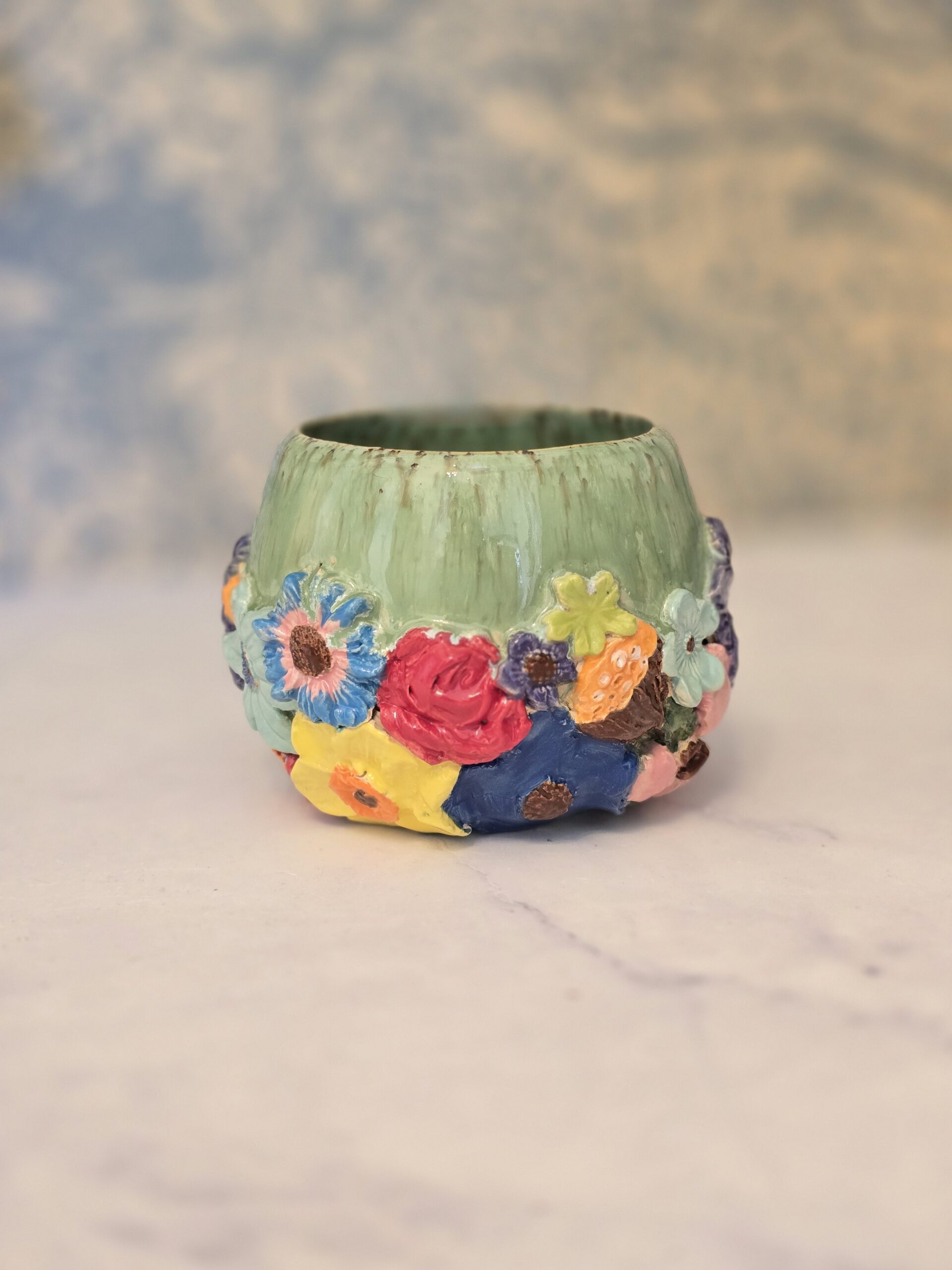 Berig din drikkeoplevelse med denne skønne kop, der rummer ca. 4 dl. Med sit charmerende design i skovfarve og farverige blomster, bringer den glæde og livlighed til enhver anledning.