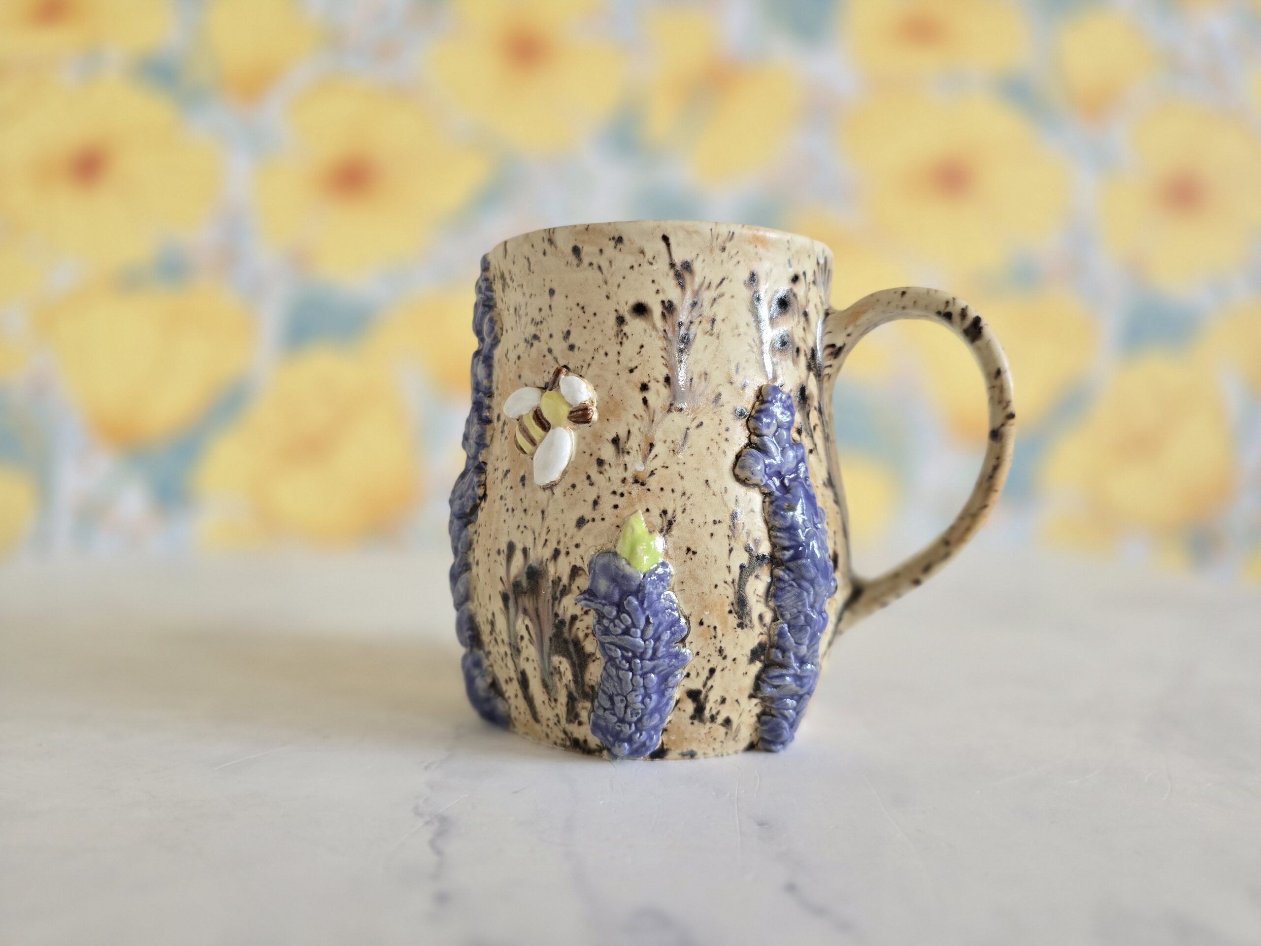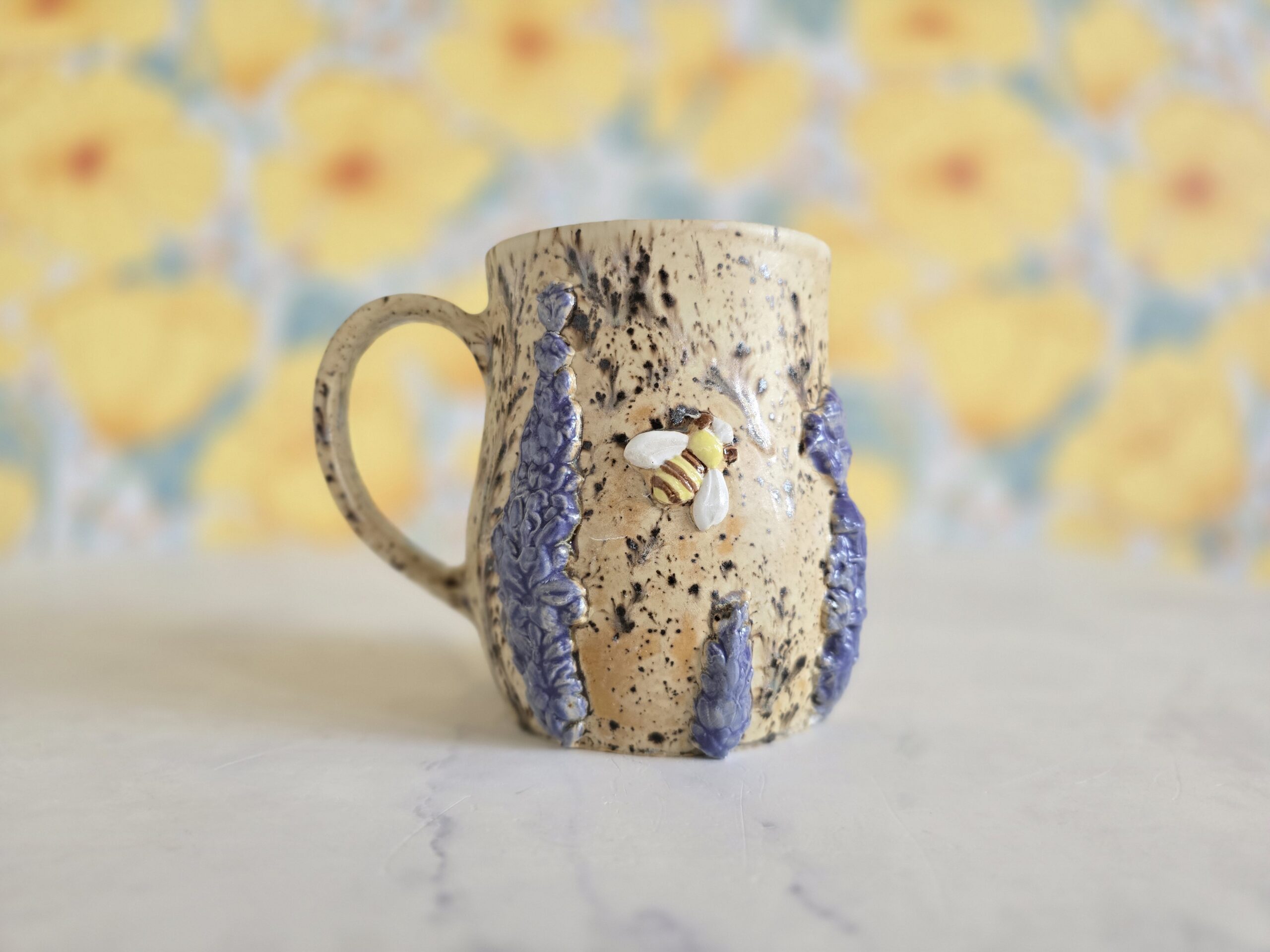 Koppen er dekoreret med håndmodellerede lavendelaks i lilla nuancer og en lille bi i relief, som giver koppen et levende og eventyrligt udtryk. Overfladen har et smukt, naturligt farvespil med mørke spil og organiske variationer, der gør hver kop helt unik.