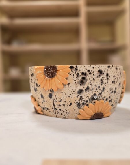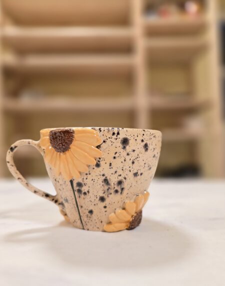 Den varme, let prikkede stentøjsbund giver et naturligt og rustikt udtryk, mens de håndmodellerede solsikker i gyldne nuancer tilfører liv og varme. Blomsternes struktur og den mørke midte skaber dybde og gør hver kop levende og sanselig.
