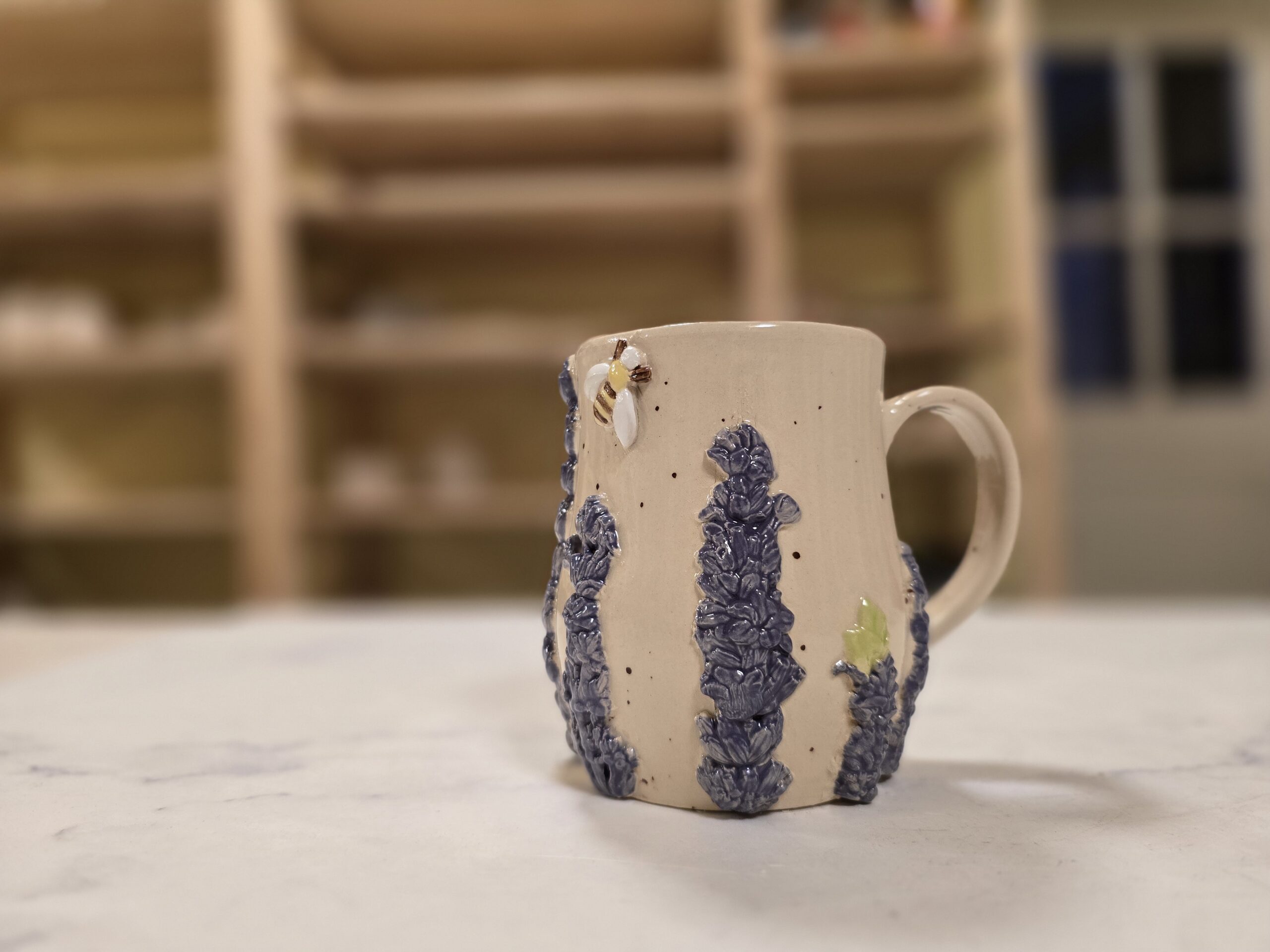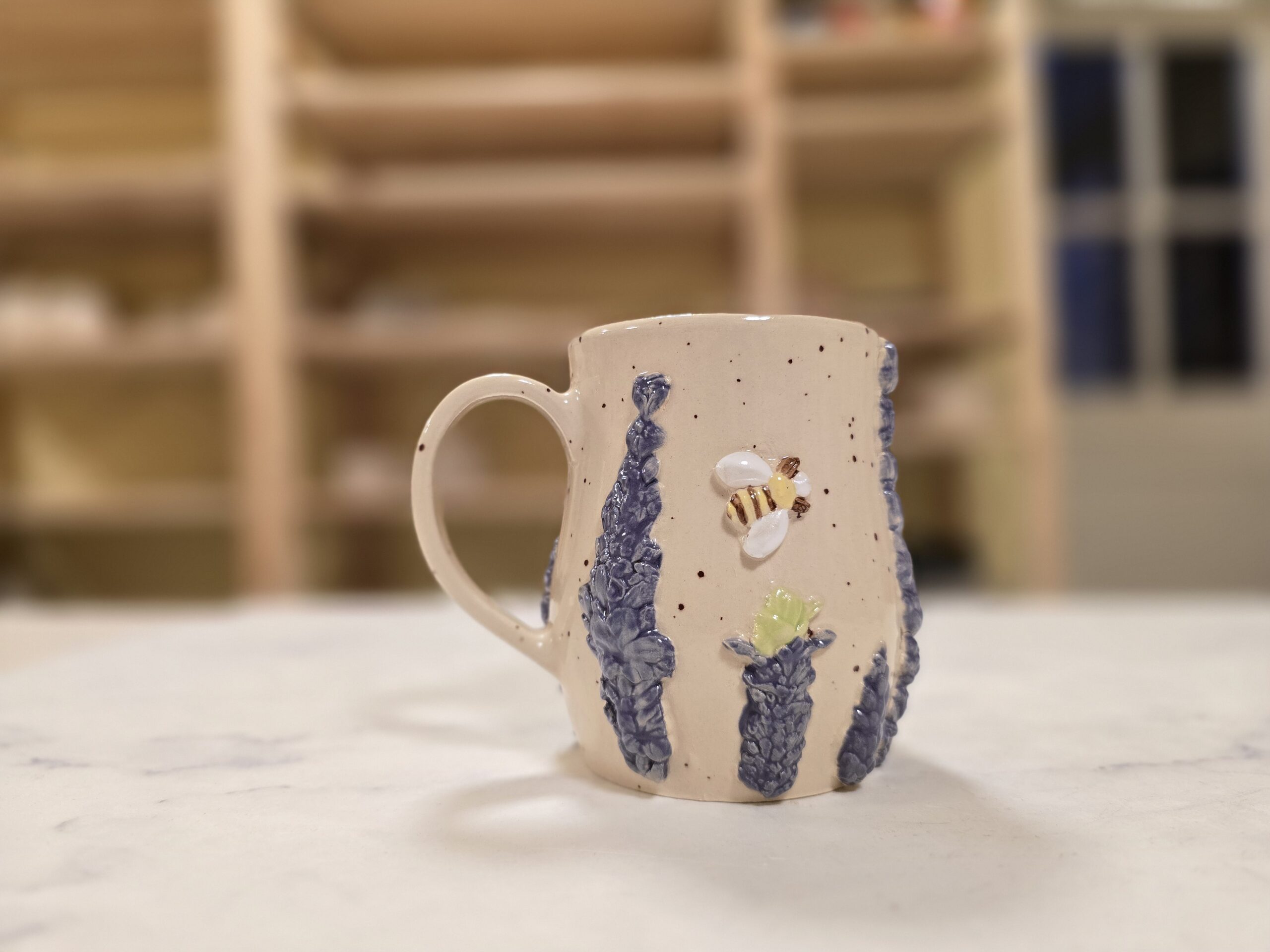 Denne kop forener naturens ro med et levende og sanseligt udtryk. Den lyse, varme bund med fine mørke prikker danner baggrund for lavendelmotiver i blå nuancer og en lille bi, der giver koppen karakter og fortælling.