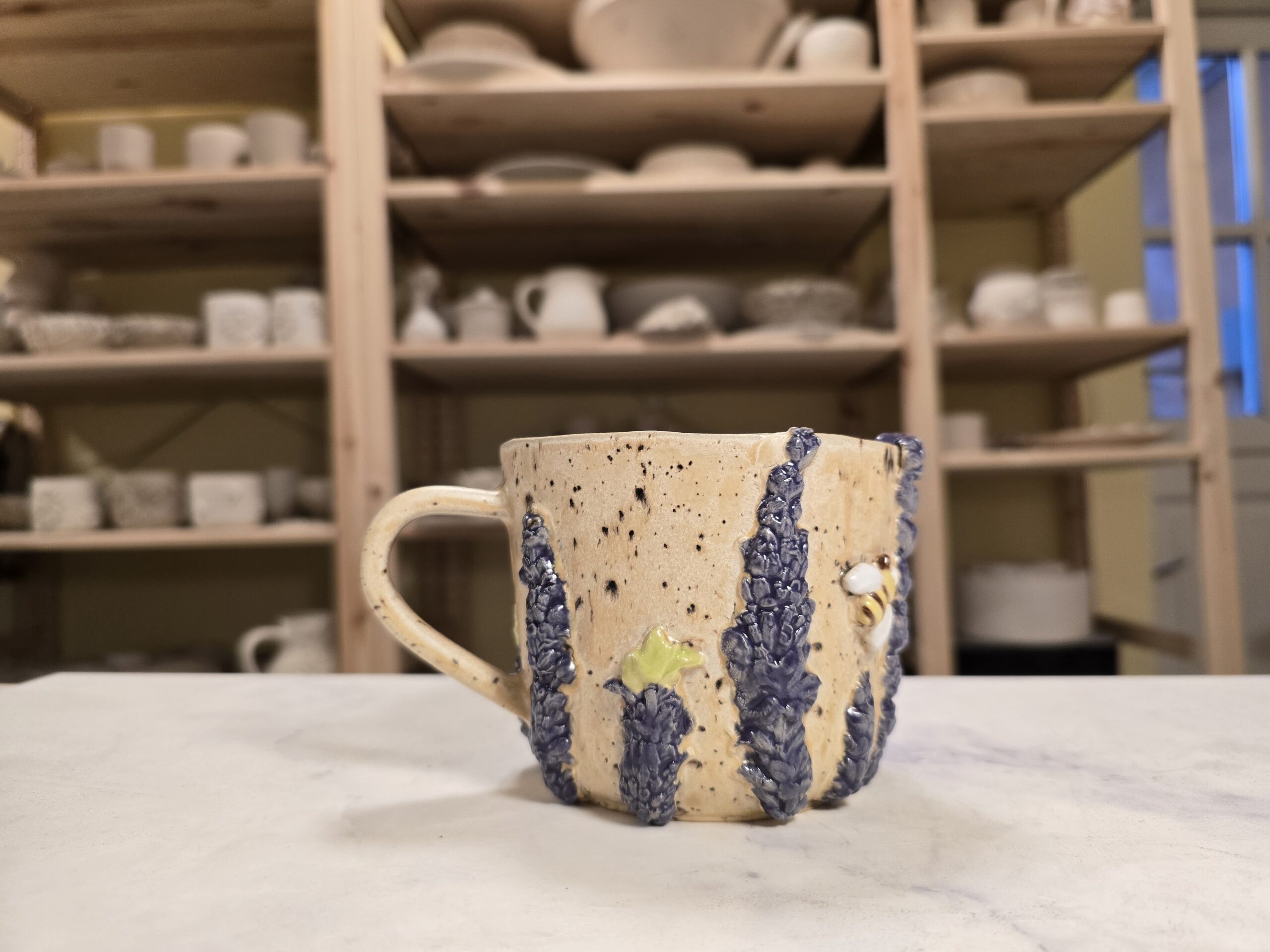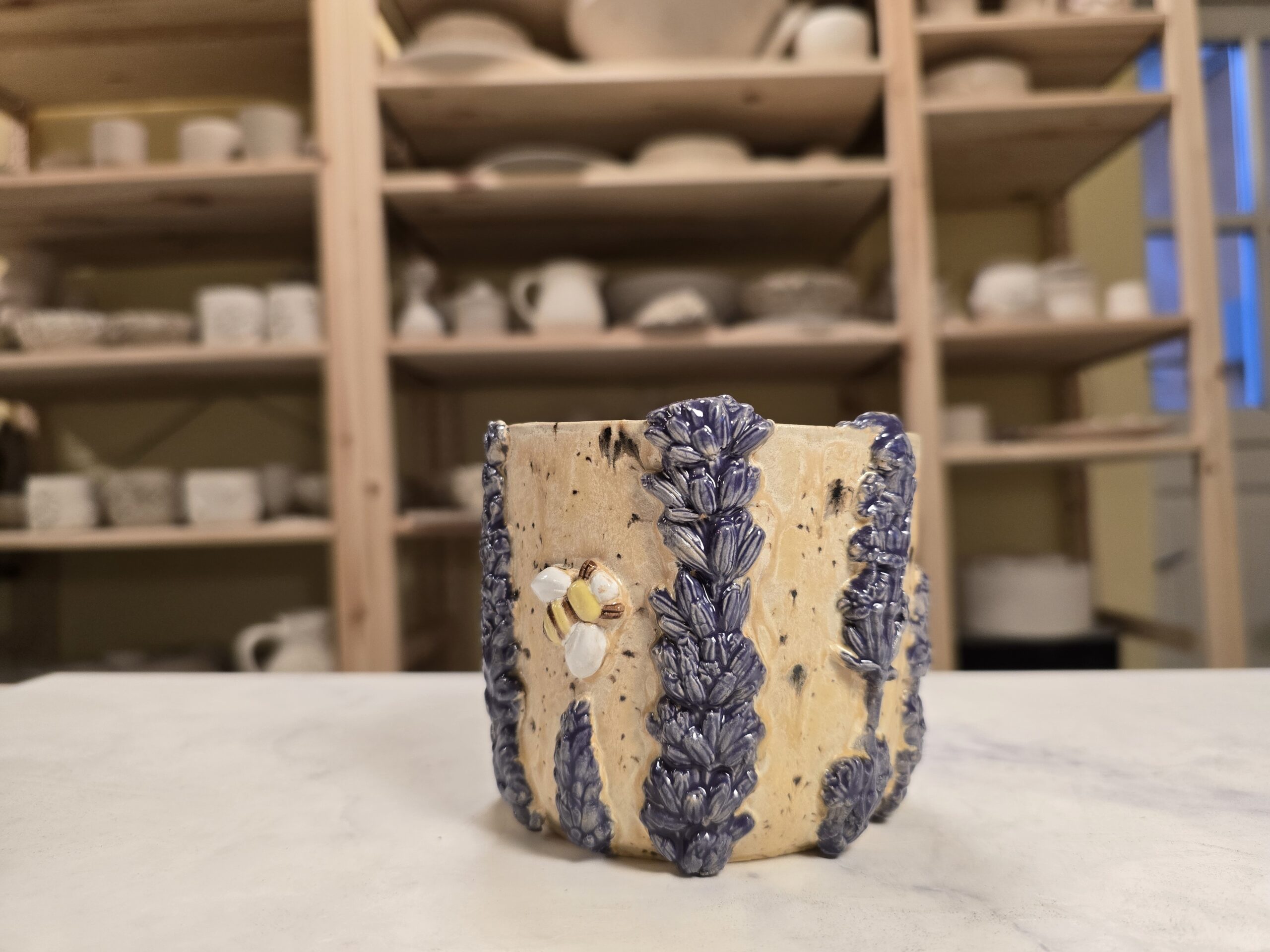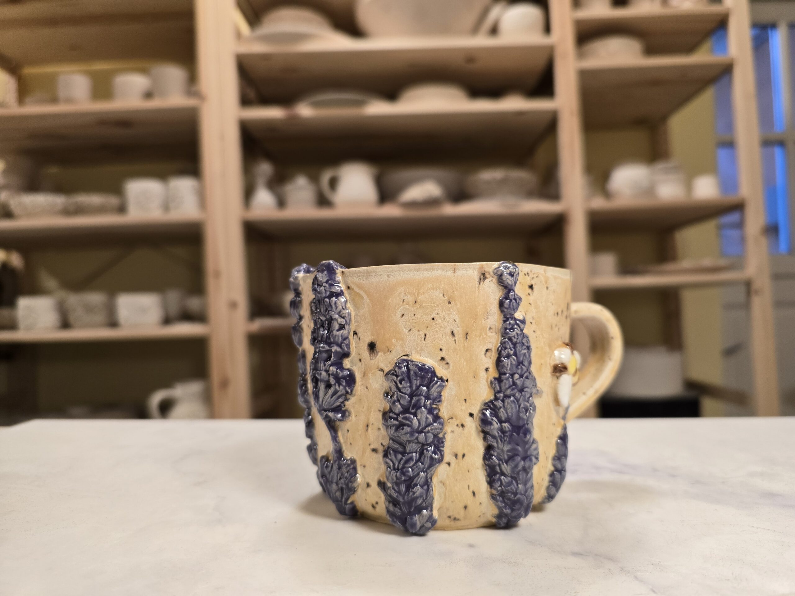 Håndlavet krus i stentøj med et rumfang på 4 dl. Ydersiden er dekoreret med et tæt mønster af små, tredimensionelle bier og blomsterrelieffer i glaserede nuancer af blå, gul og hvid, som skaber et levende, naturinspireret udtryk. Overfladen har en varm, spættet lerbase, mens indersiden er glaseret i en neutral tone for nem rengøring. Kruset har en behagelig hank, som gør det velegnet til både hverdag og gavegivning. Hver kop er unik; små variationer i form, farve og glasur kan forekomme.