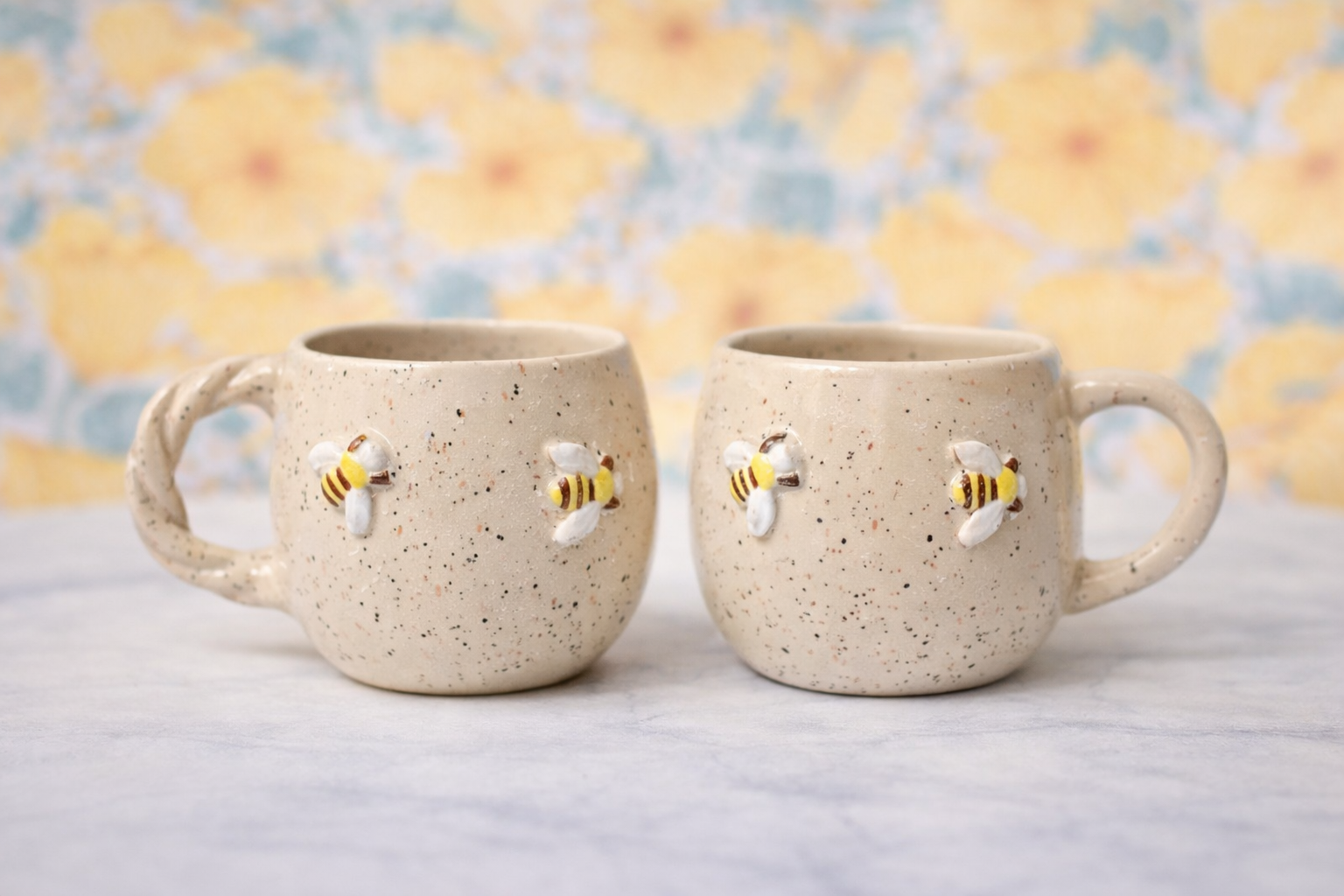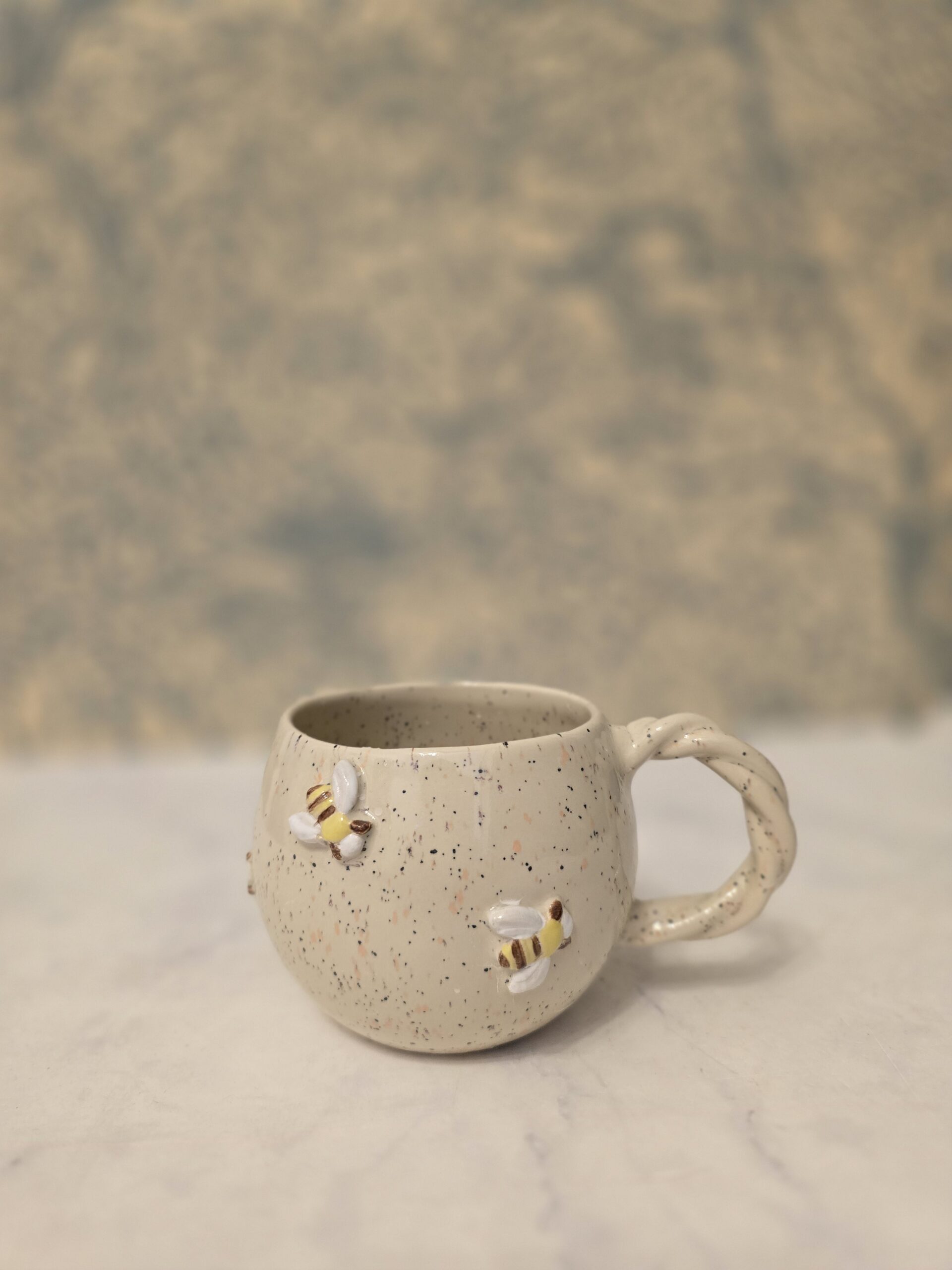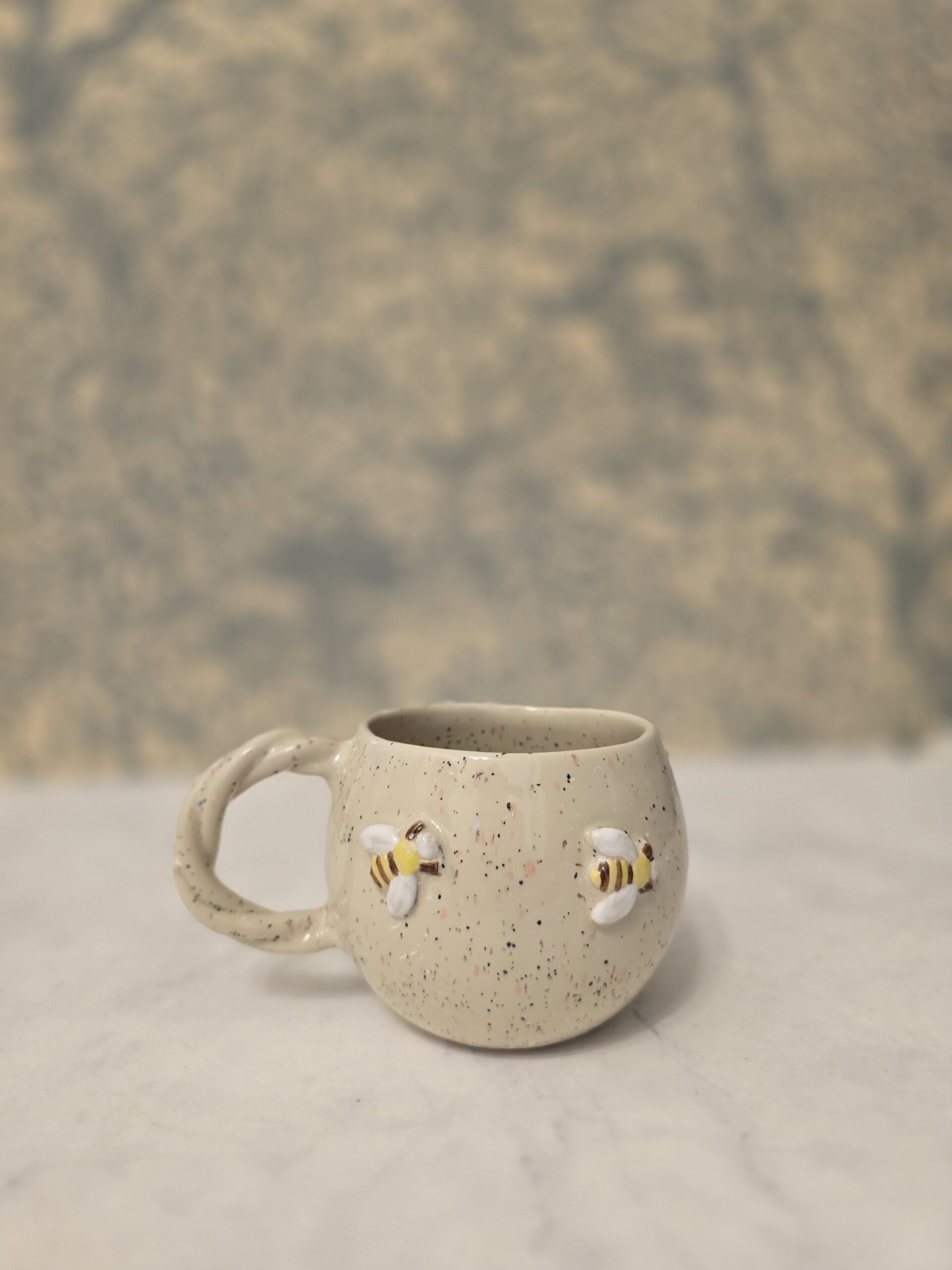 Denne charmerende kop rummer ca. 4 dl og er dekoreret med fine bier. Den har en neutral farve med små farverige prikker, hvilket giver den et unikt og hyggeligt udtryk.