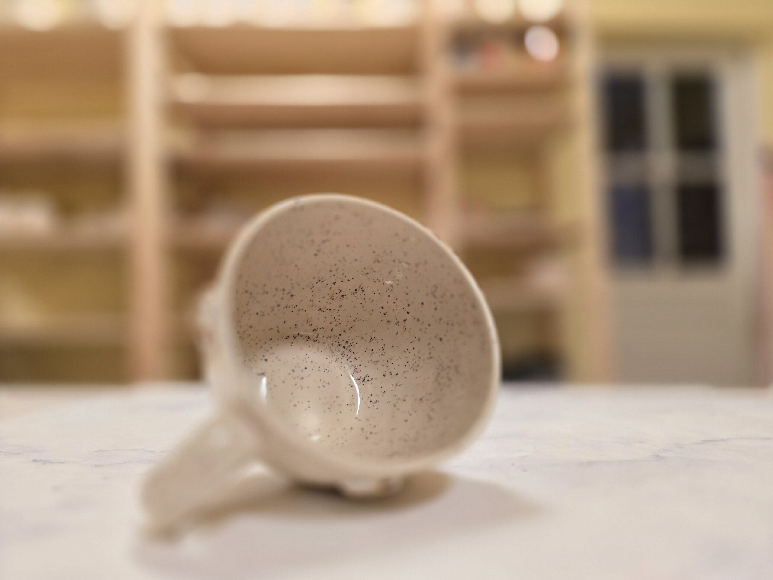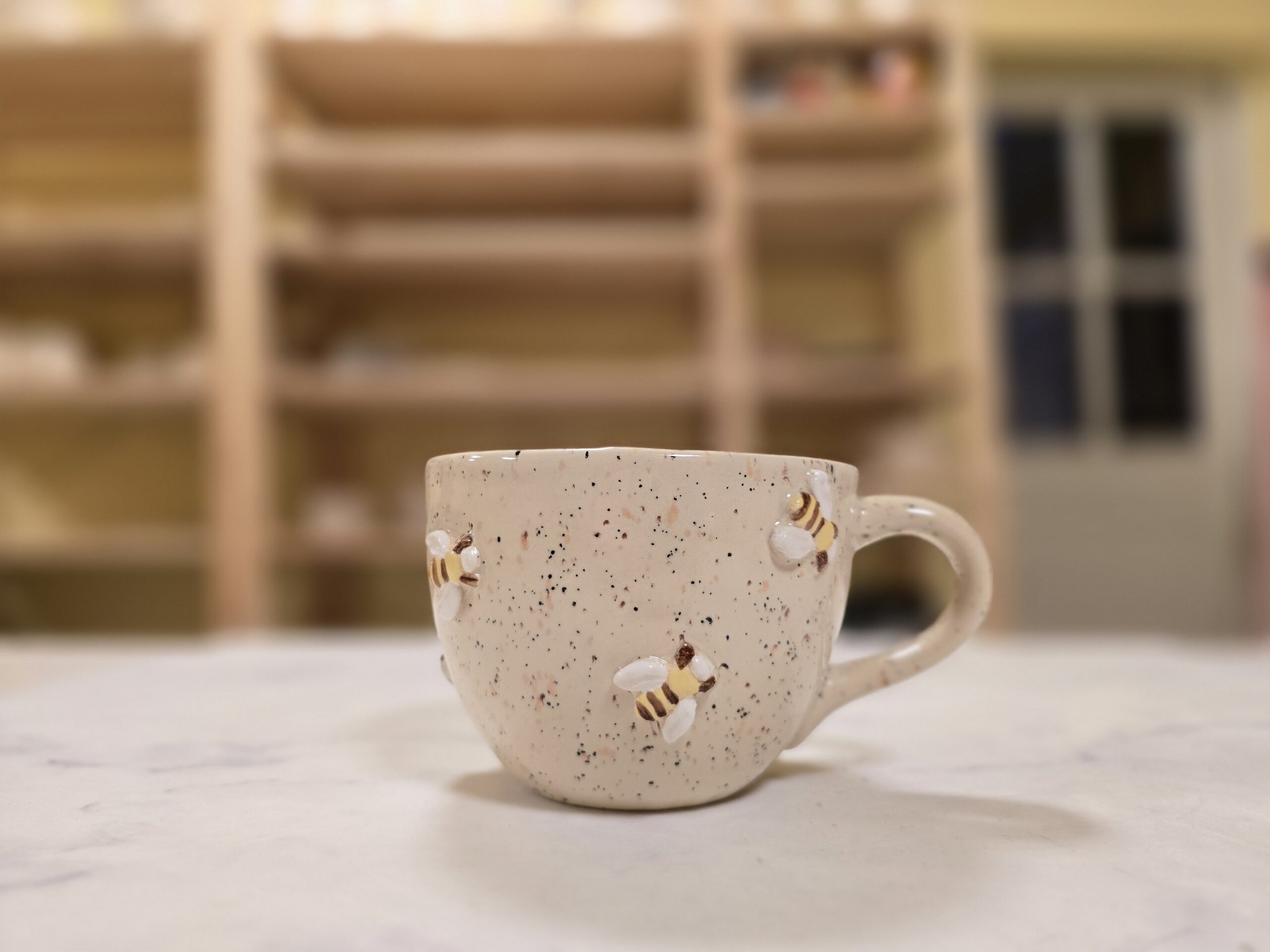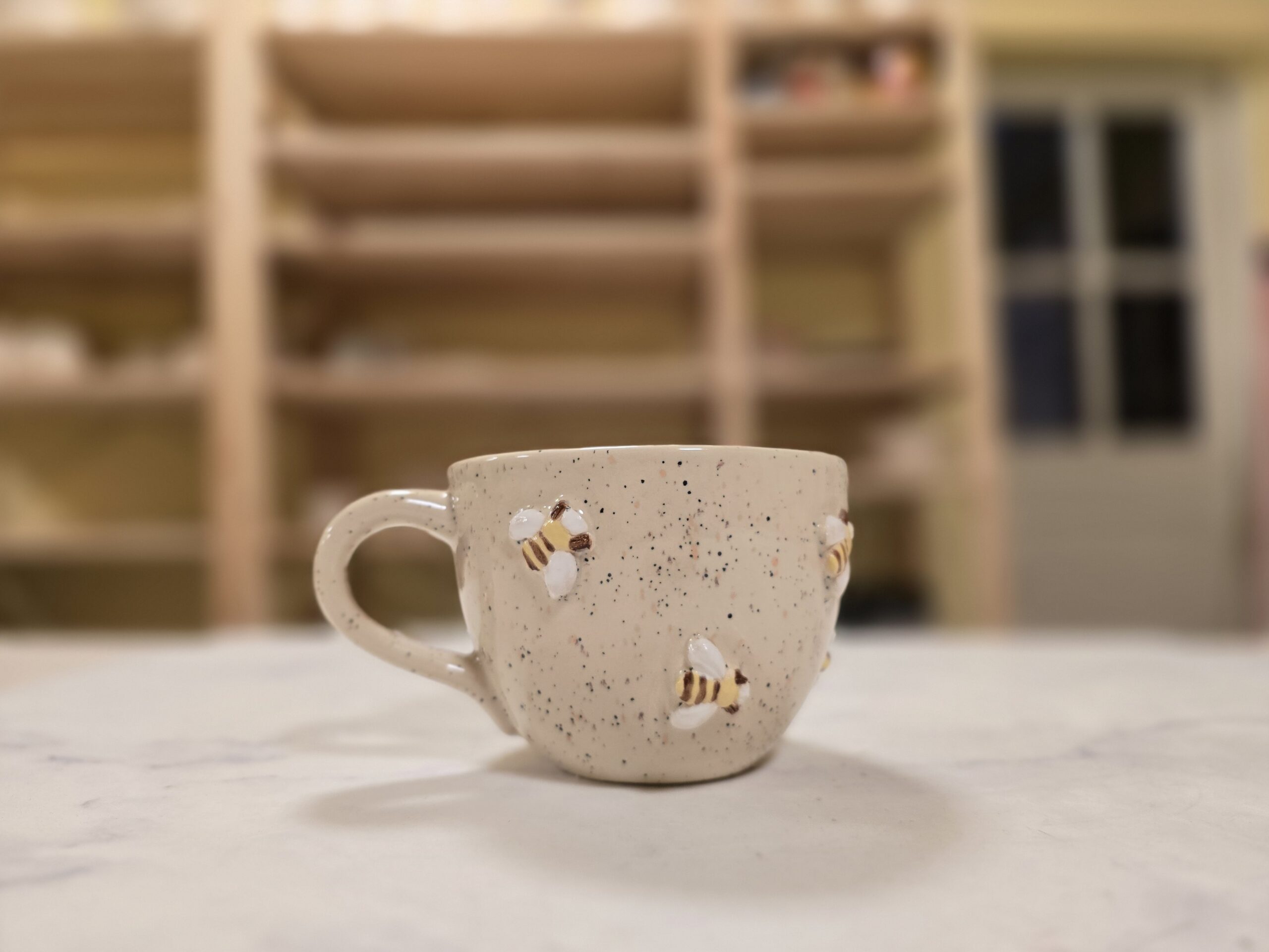 Den lyse, naturlige glasur med fine mørke prikker skaber et roligt og jordnært udtryk, mens bierne tilfører varme og personlighed. Indersiden har samme harmoniske glasur og giver et samlet, helstøbt udtryk.