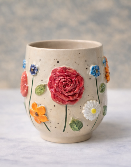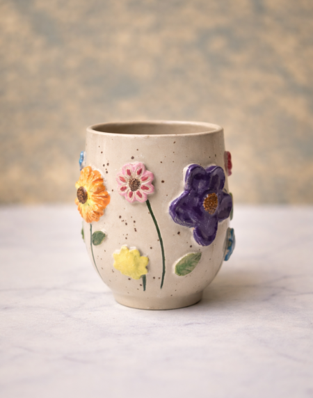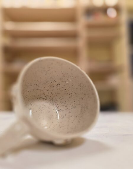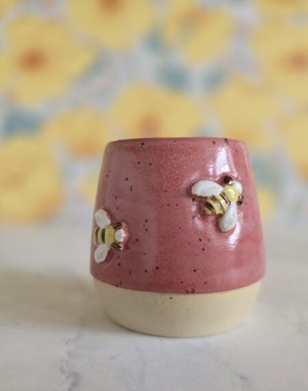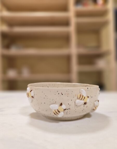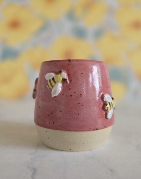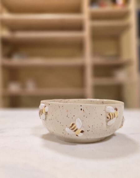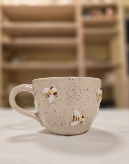 Denne håndlavede keramik kop fra Let it Bee-serien er dekoreret med små, håndmodellerede bier, som er påsat én for én. Den lyse, naturlige glasur med fine mørke prikker giver et roligt og nordisk udtryk, mens bierne tilfører varme og personlighed.