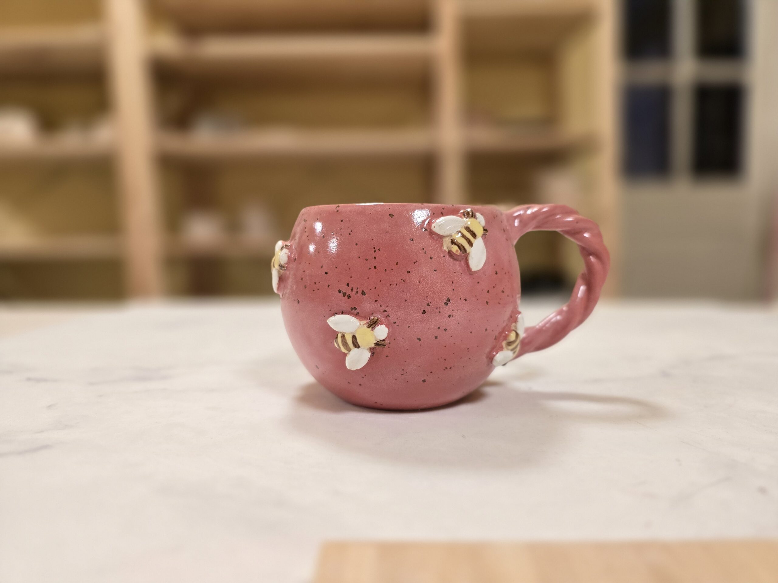 Den rosa glasur giver koppen et varmt, levende og feminint udtryk, mens de små bier skaber bevægelse og personlighed. Glasuren har fine mørke prikker, der tilfører dybde og et håndlavet, organisk udtryk.