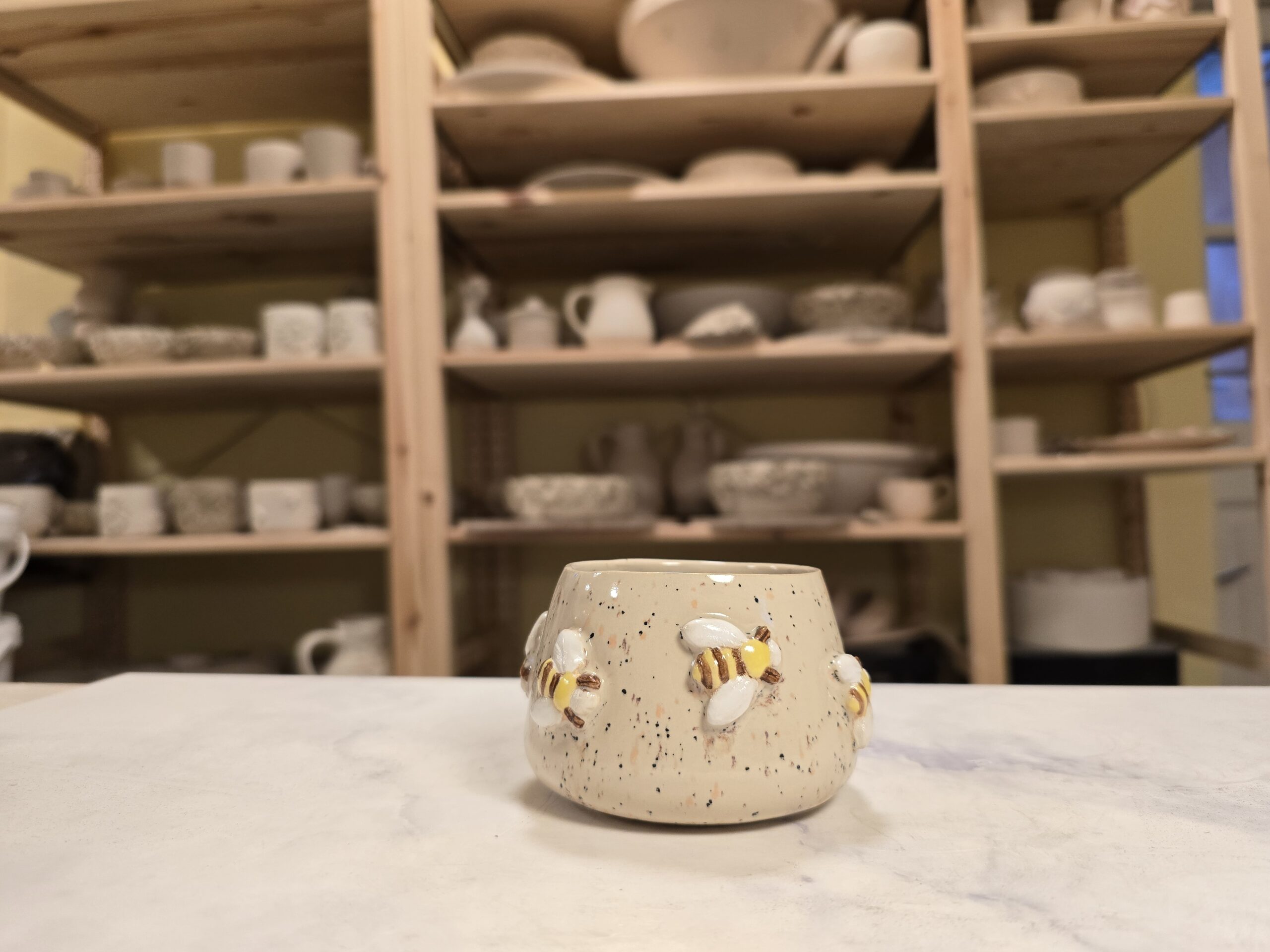 Robust, håndlavet krus i stentøj med et rumfang på cirka 1,8 dl. Ydersiden er dekoreret med et mønster af små, tredimensionelle bier i glaserede gule og hvide nuancer, der skaber et levende, naturinspireret udtryk mod den varme, prikkede lerbase. Kruset har en glaseret inderside for nem rengøring. Den kompakte størrelse gør det velegnet til espresso, te eller små portioner varm drik — samtidig kan det fungere som dekorativt element på bordet eller i køkkenet. Hver kop er unik; små variationer i form og glasur kan forekomme.