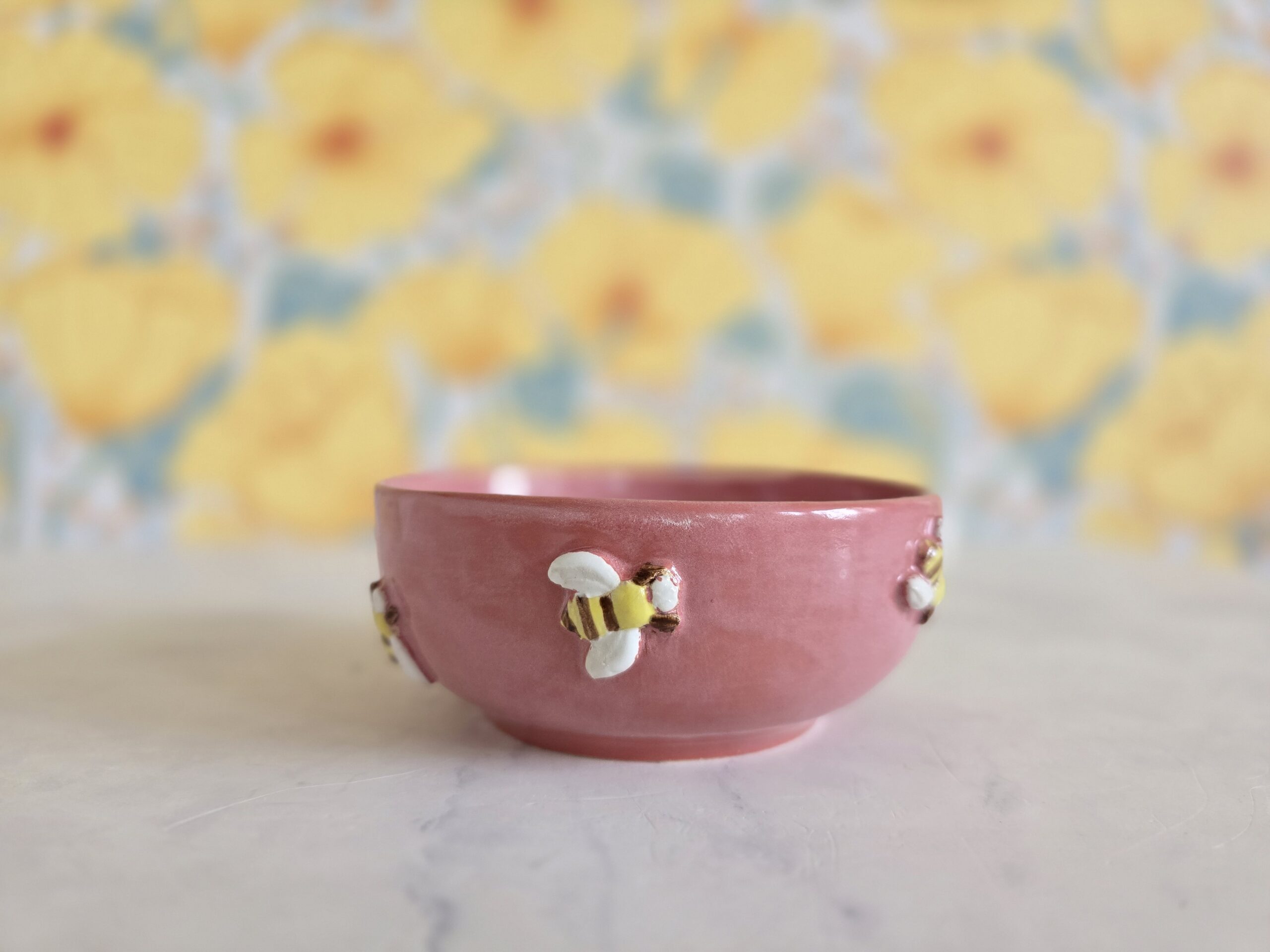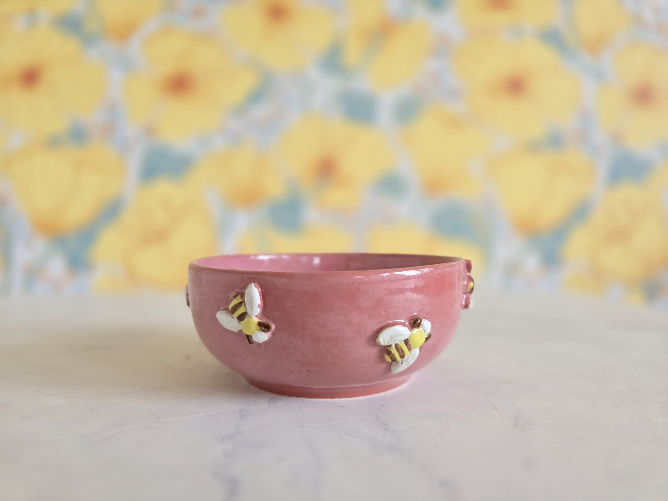 Hver skål er håndlavet og hånddekoreret, og derfor vil der altid være små variationer i glasur, farvespil og placering af bierne. Det er en del af det ægte håndværk.