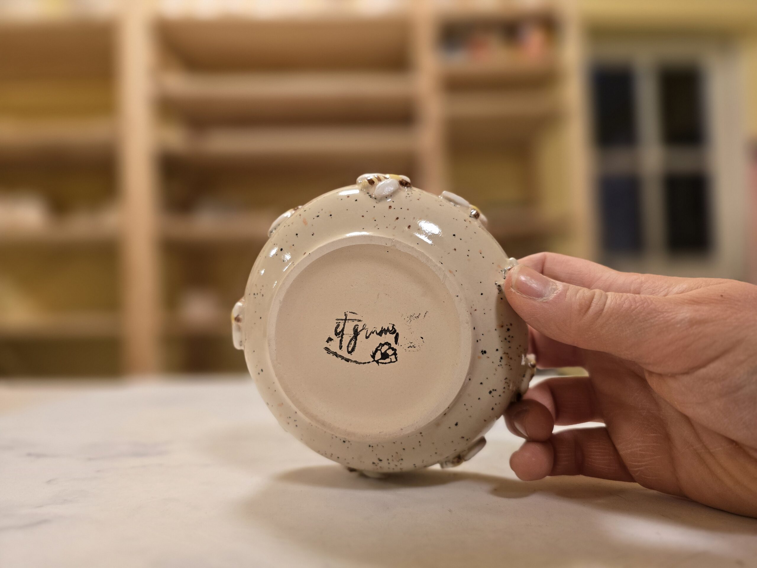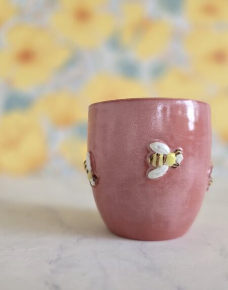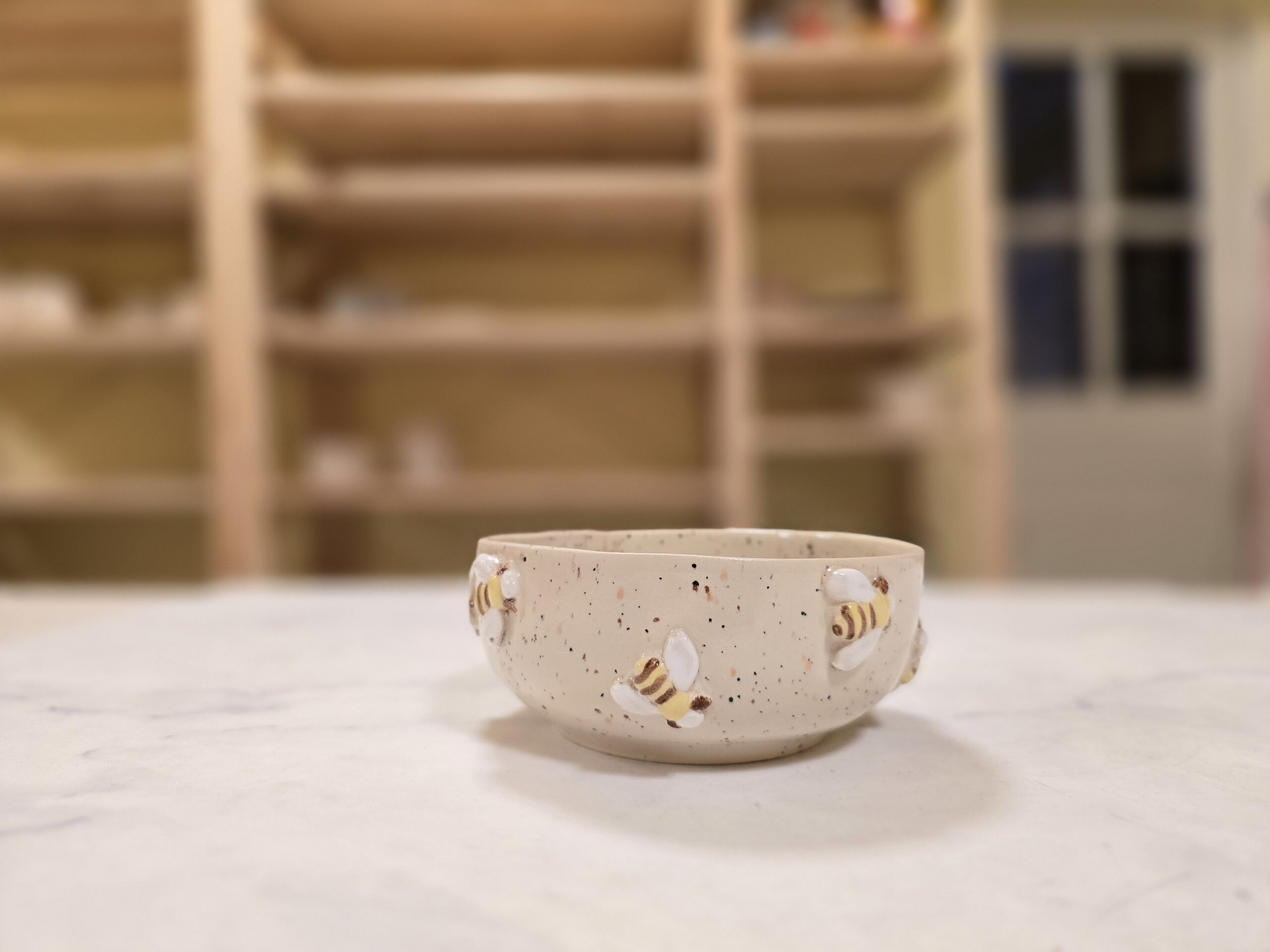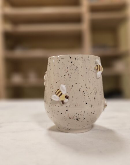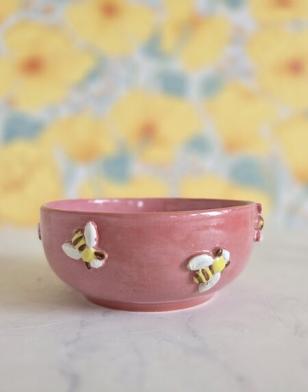 Denne lille skål fra Let it Bee-serien er håndlavet i stentøj og dekoreret med små, håndmodellerede bier, som er påsat én for én. Den lyse, naturlige glasur med fine mørke prikker giver et roligt og nordisk udtryk, mens bierne tilfører varme og personlighed.