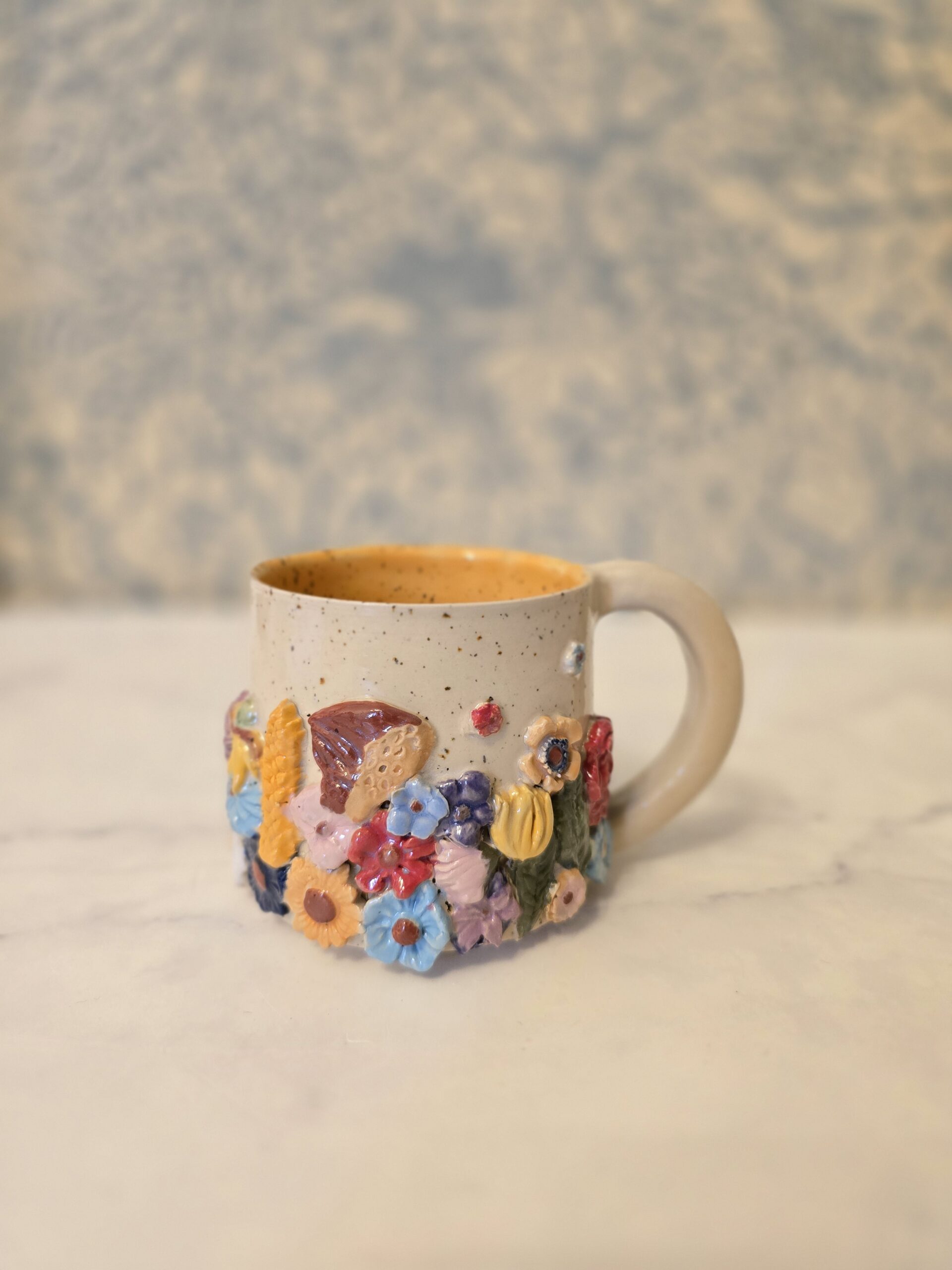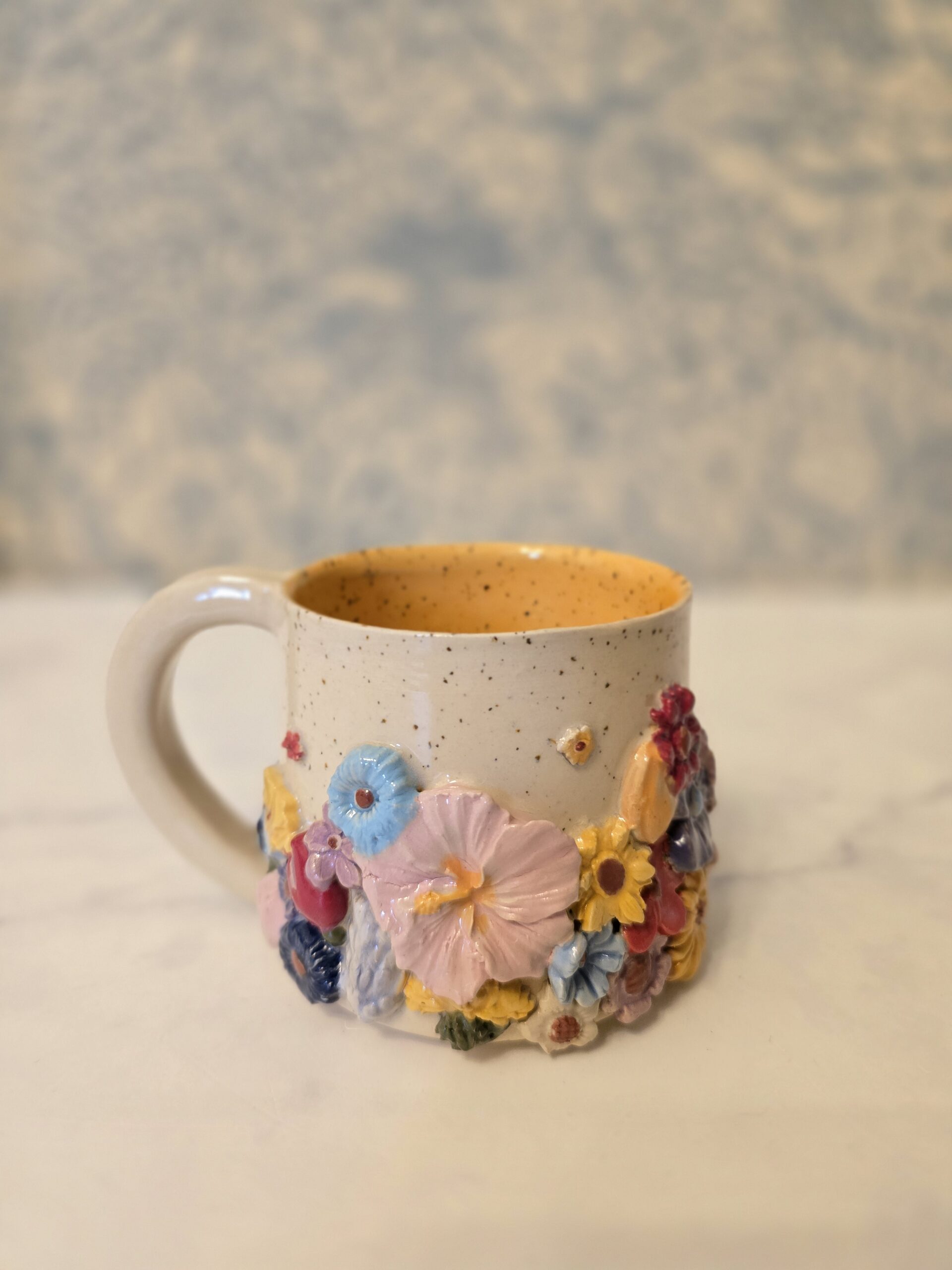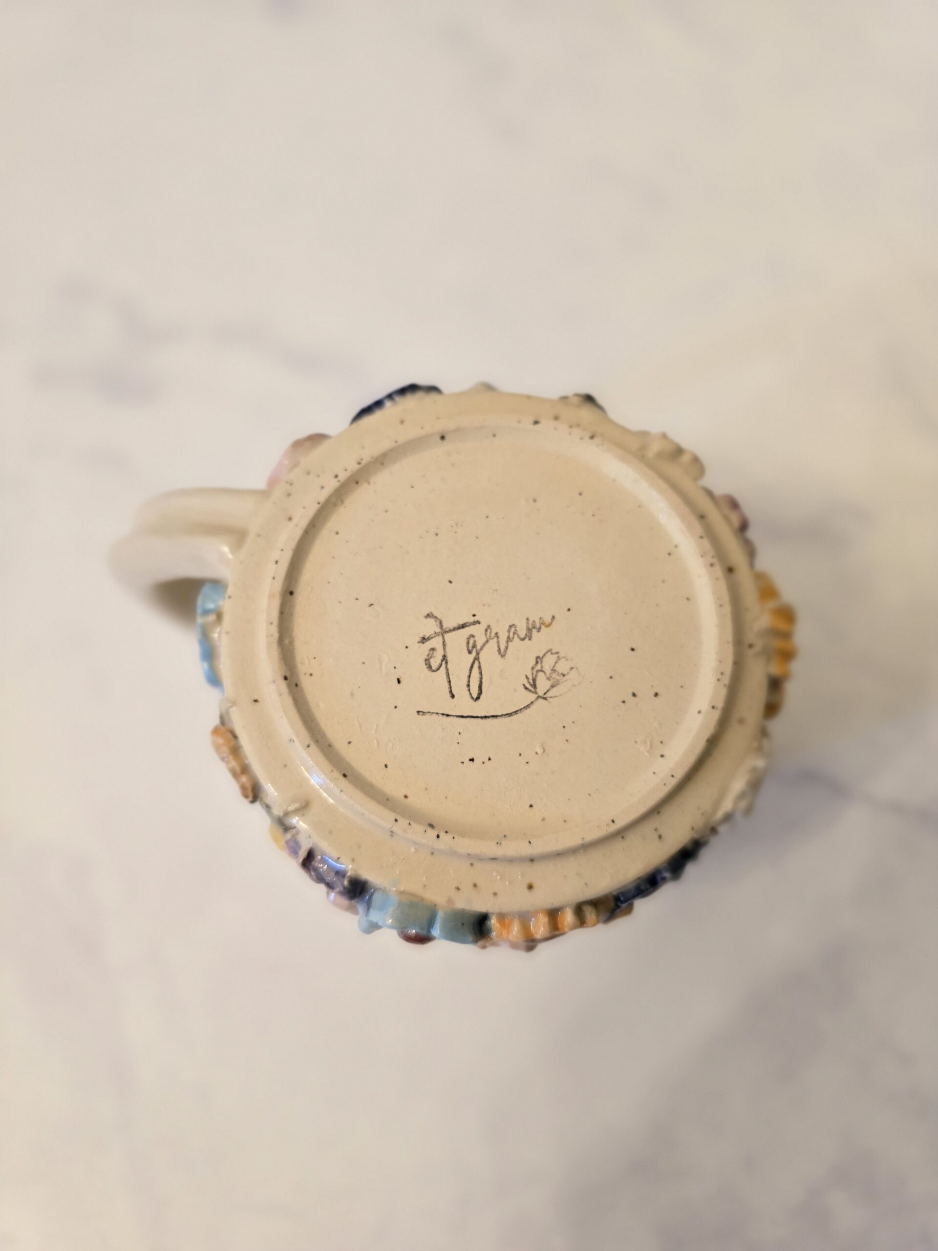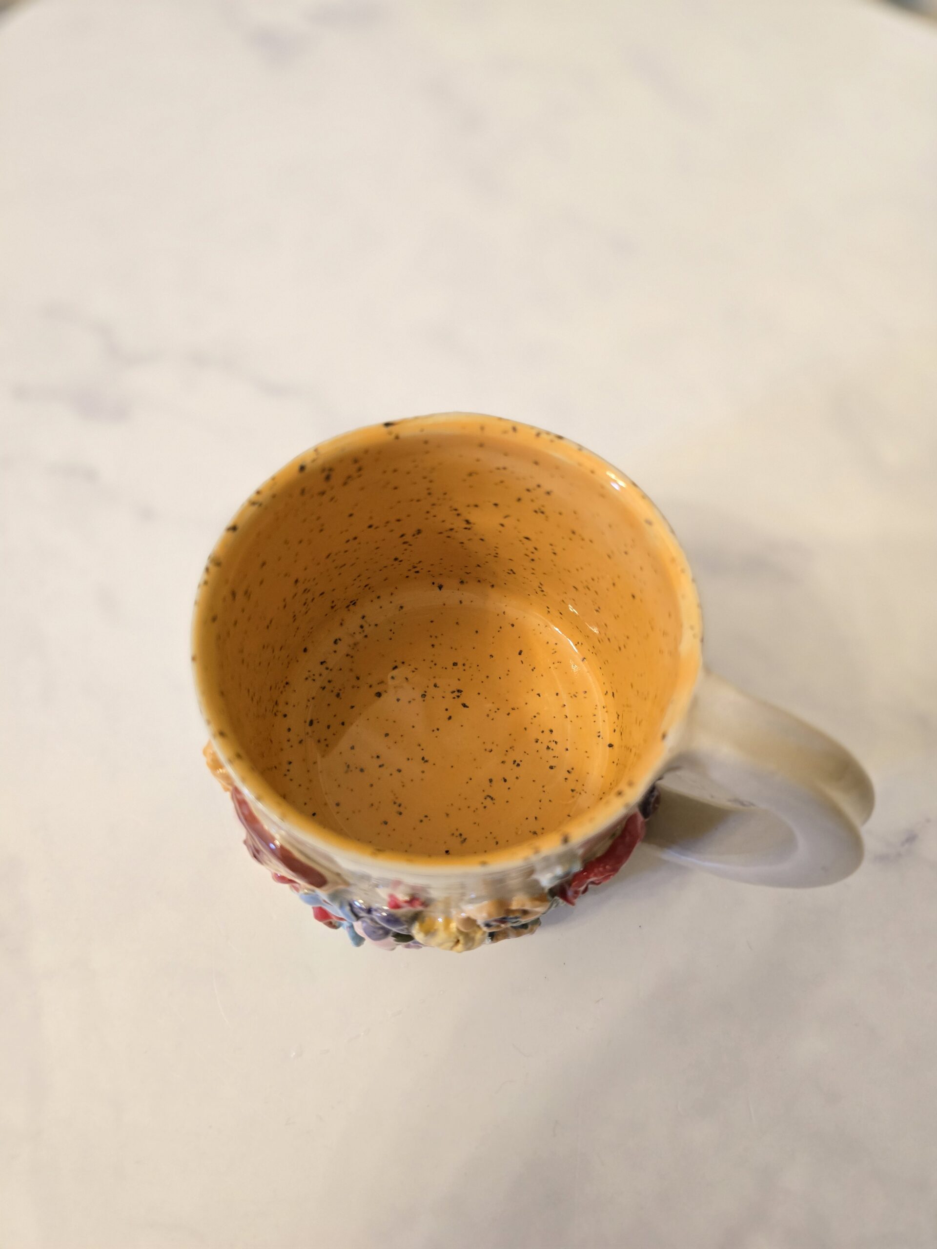 Oplev denne charmerende kop, der kombinerer funktionalitet med kunstnerisk flair. Med en kapacitet på ca. 3 dl er den ideel til servering af varme drikke som kaffe, te eller kakao. Den unikke blomsterudsmykning og den gule inderside gør den til et smukt indslag i dit køkken.