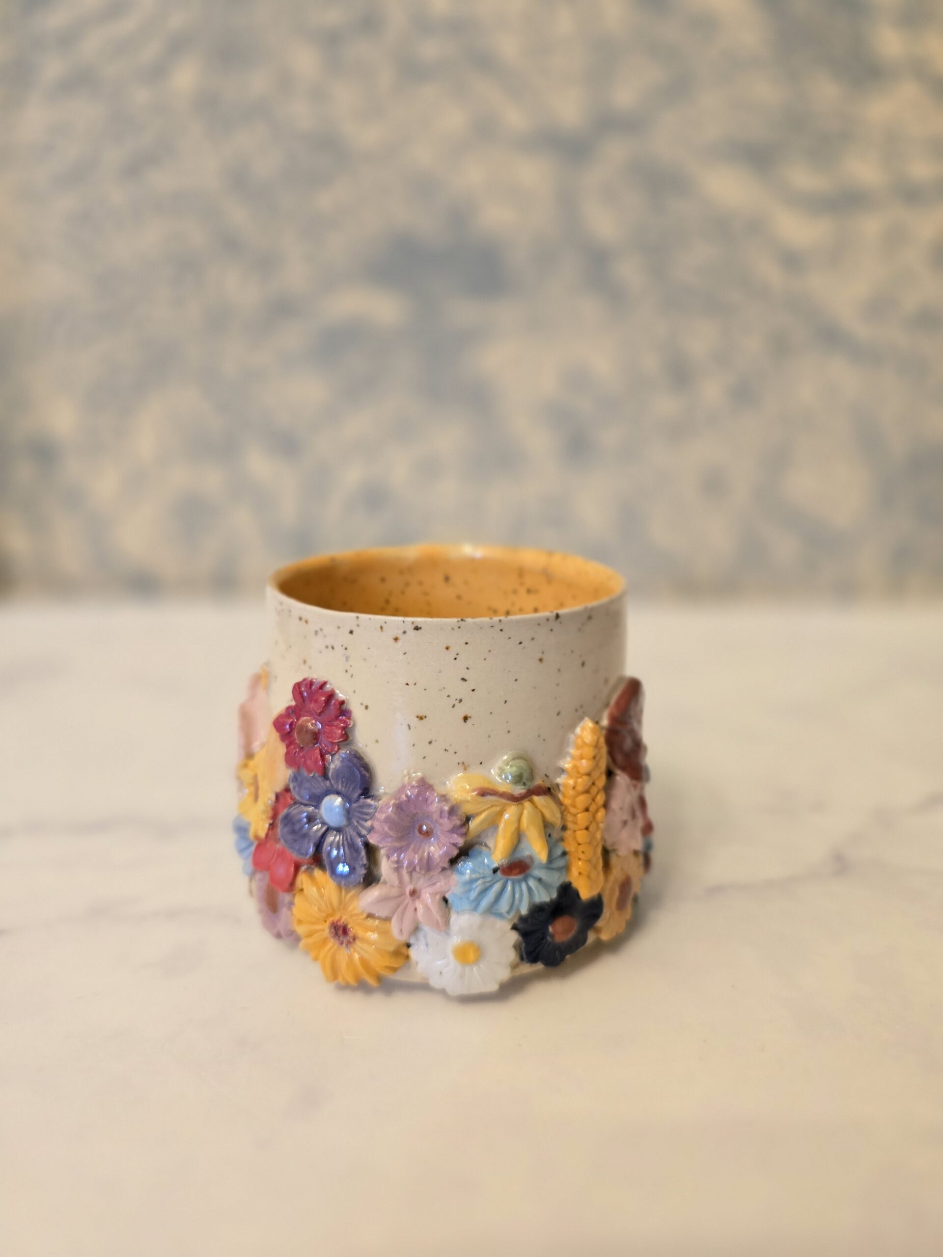 Denne smukke kop rummer ca. 3 dl og er dekoreret med farverige blomsterdetaljer. Den gule inderside tilføjer et livligt præg til din drikkeoplevelse.