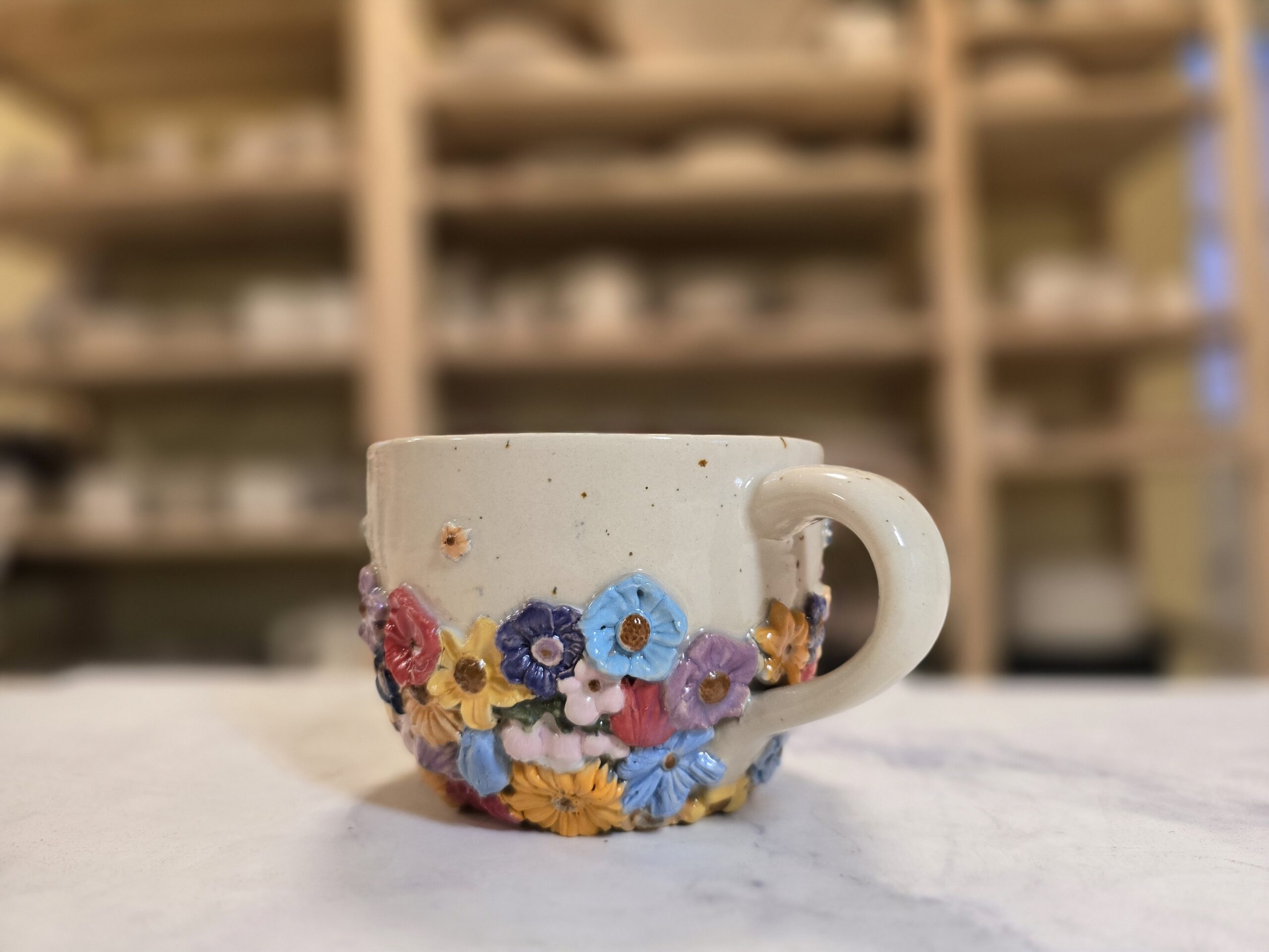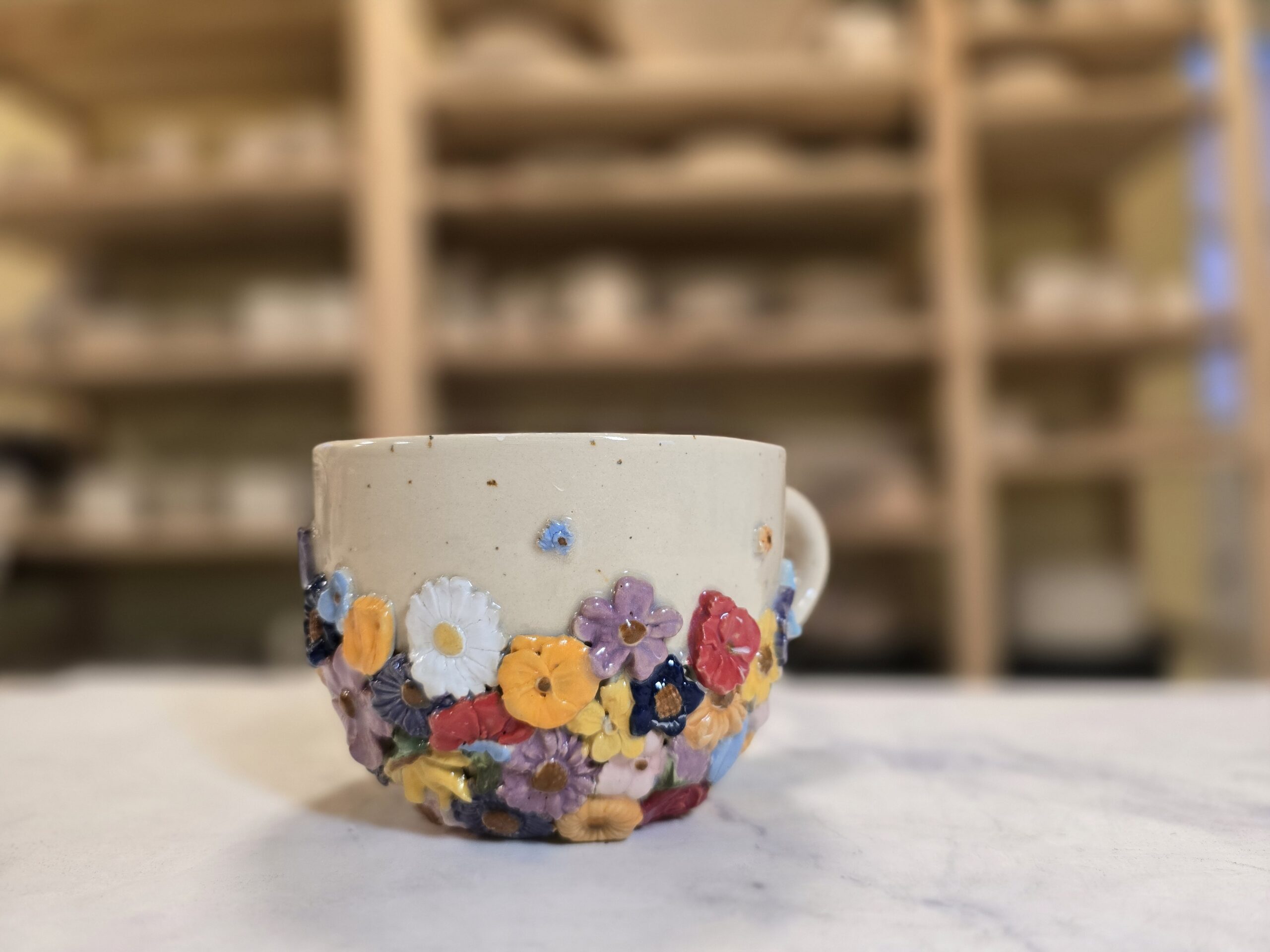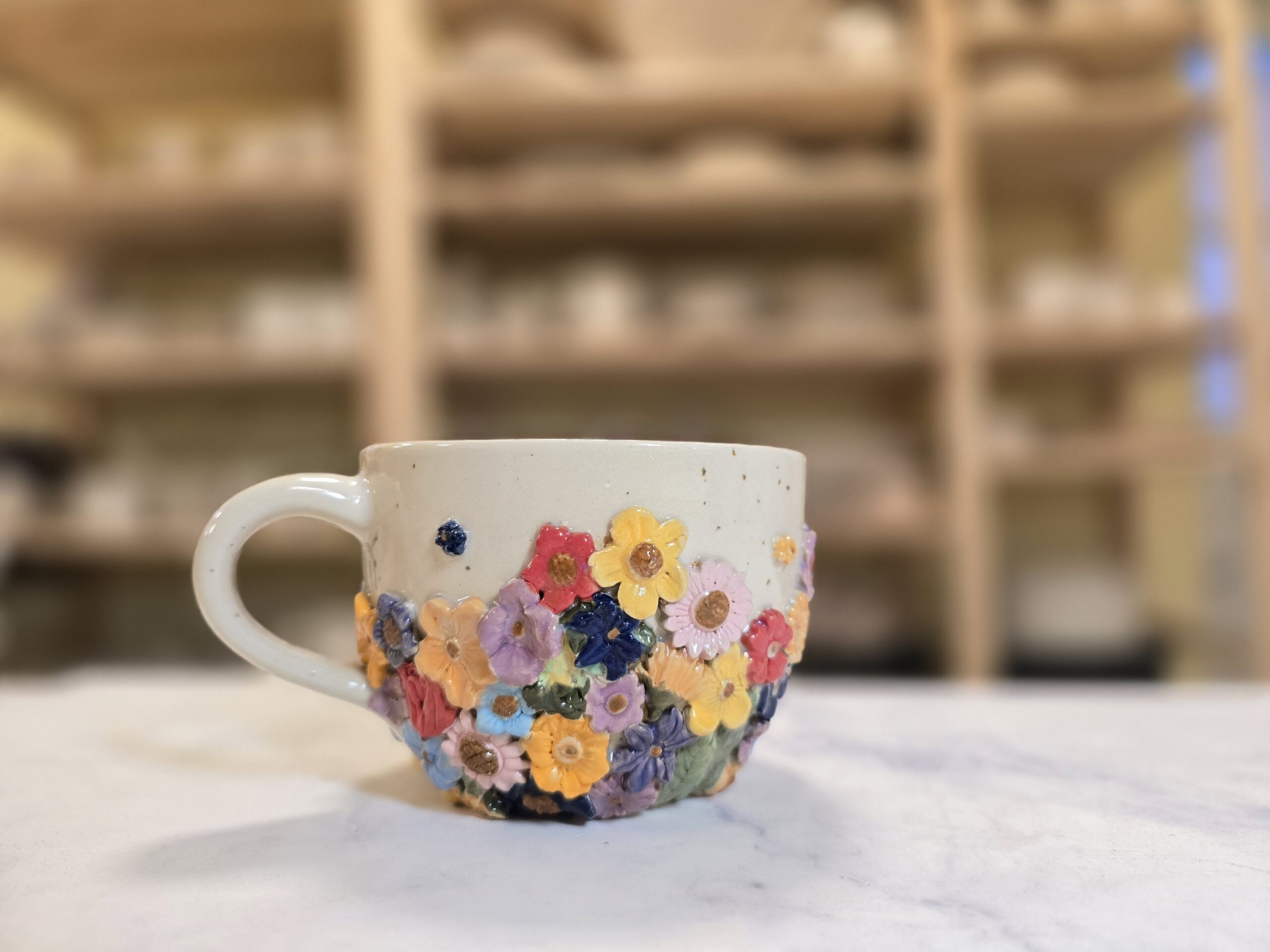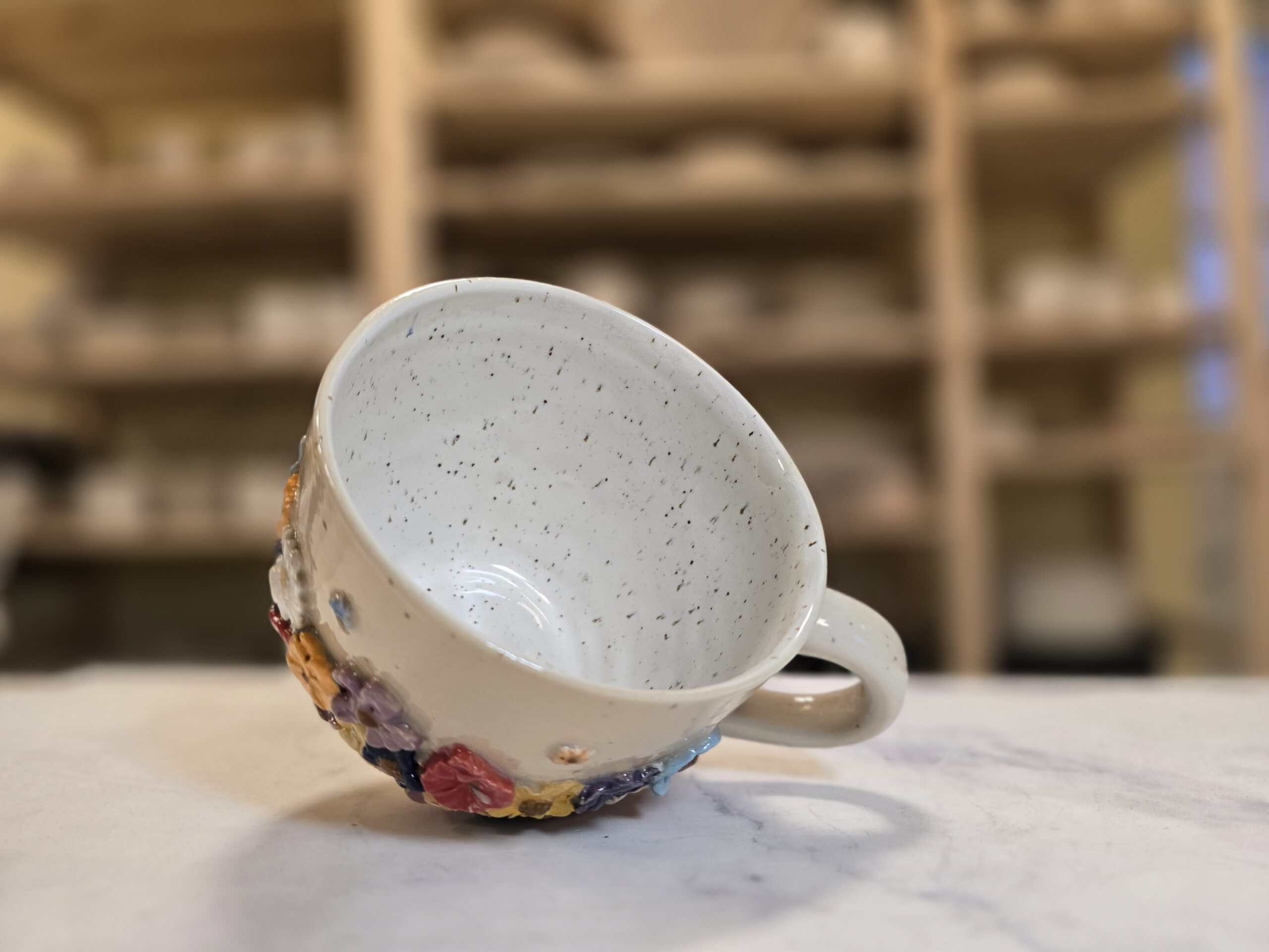 Jumbokop i håndlavet stentøj (5 dl) med farverige blomsterrelieffer på prikket overflade. Stor, hyggelig og velegnet til lange kaffestunder.