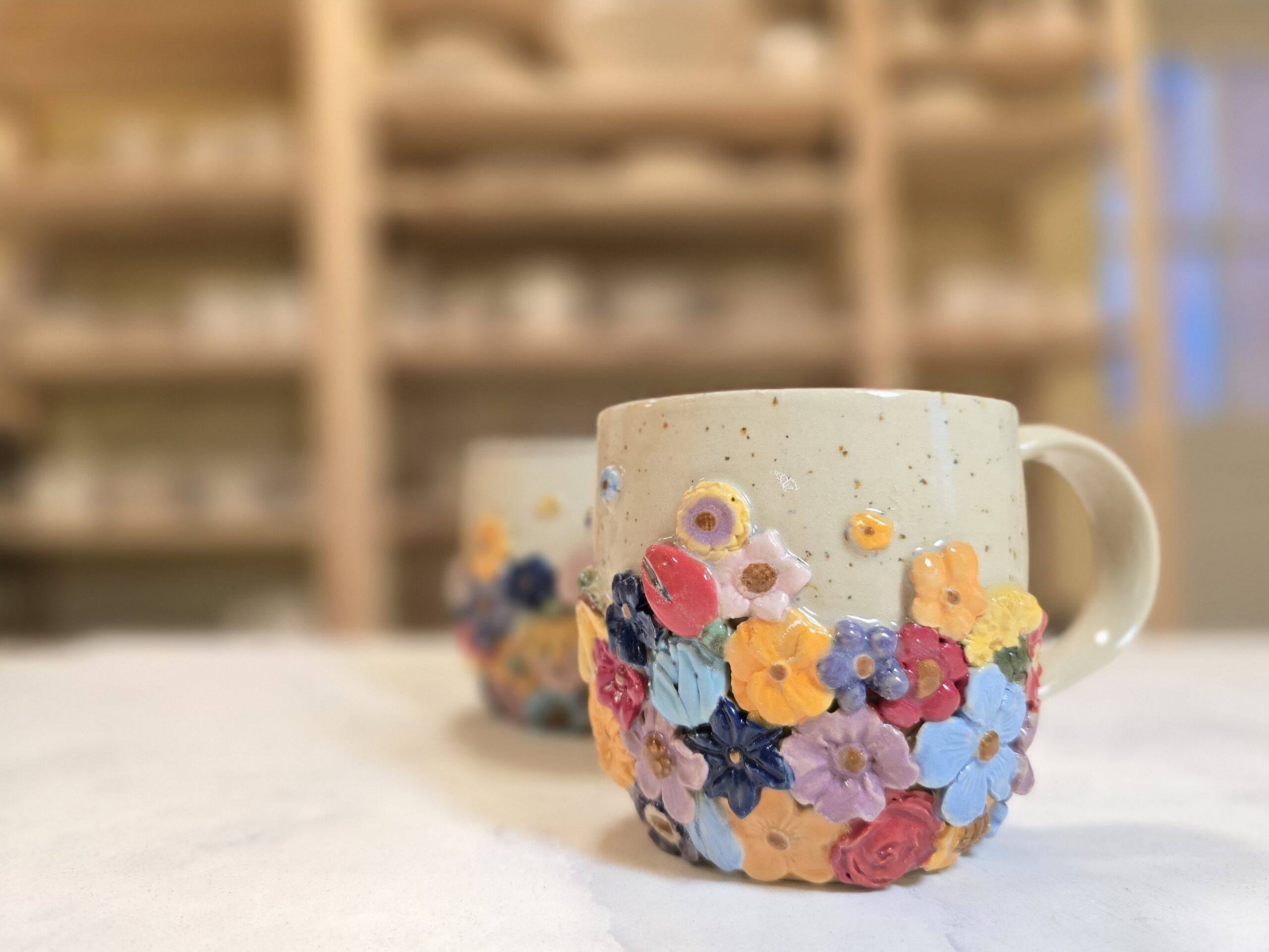 muk, håndlavet kop i stentøj med et rumfang på 3 dl. Koppen er dekoreret med små, farverige blomster i glasur, som giver et livligt og glædeligt udtryk på en varm, specklet lerbase. Den kompakte størrelse gør den ideel til te, mindre kaffe eller kakao, og det holdbare stentøj tåler daglig brug. Hver kop er unik med små variationer i form og glasur — en charmerende detalje til dit køkken eller som en fin, personlig gave.