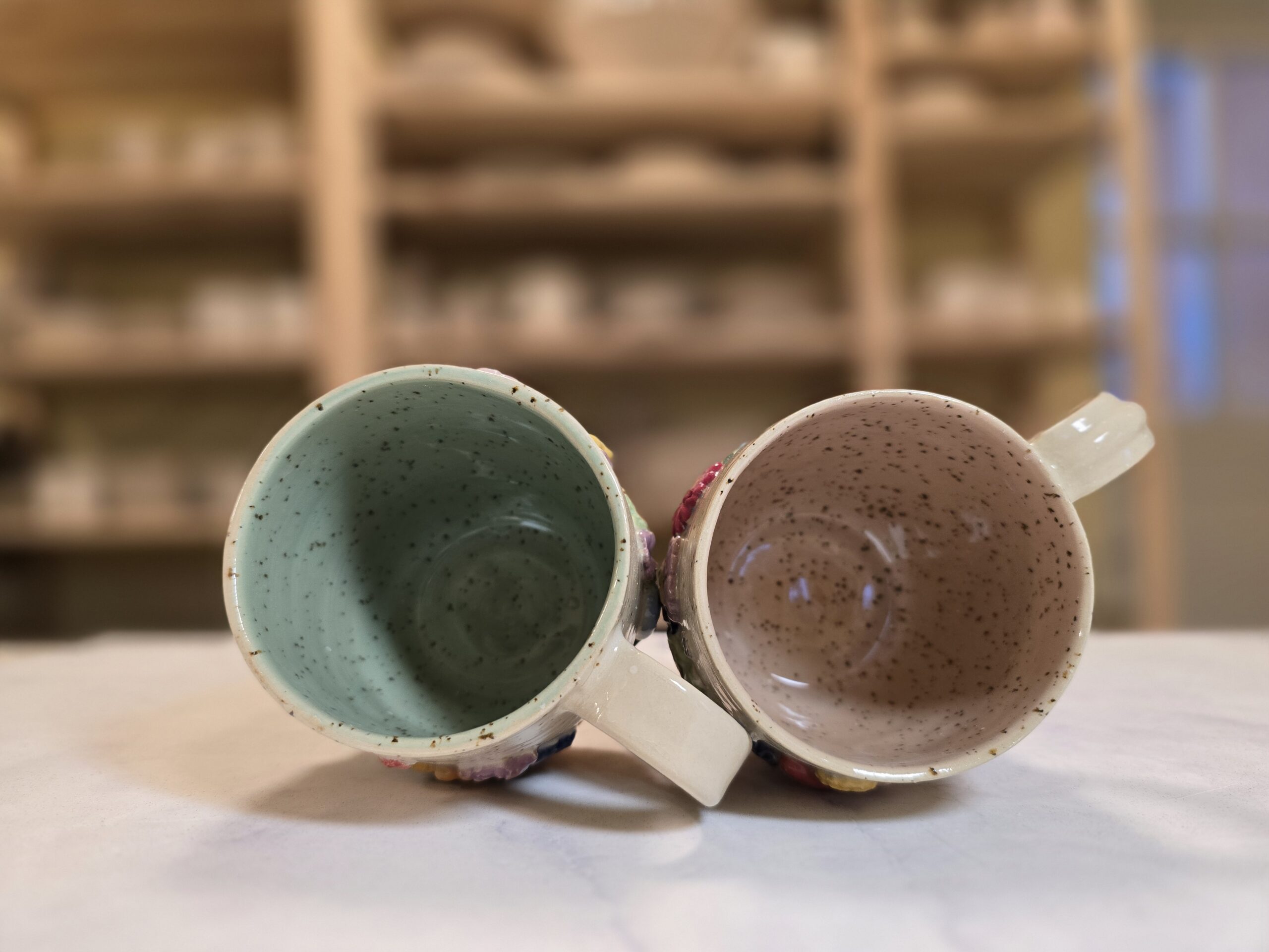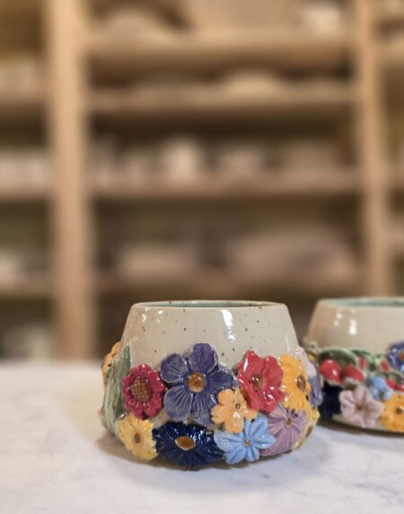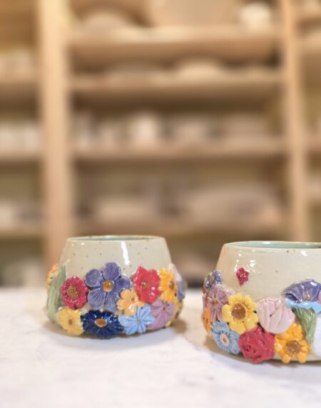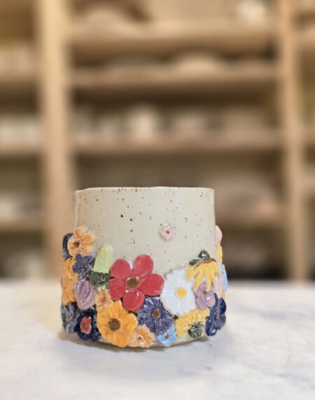 Håndlavet stentøjskop (3 dl) med farverige blomsterrelieffer på prikket overflade. Hyggelig, robust og perfekt til daglig brug. Koppen er grøn på indersiden.