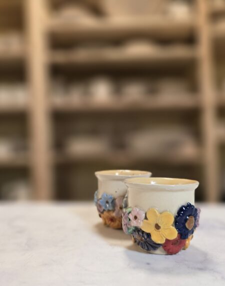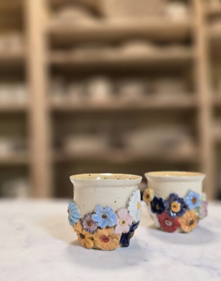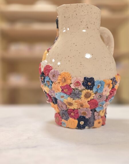Smukt, håndlavet krus i solidt stentøj med et rumfang på 3,5 dl. Et bånd af små, tredimensionelle blomster i glaserede farver dekorerer den nederste del og giver kruset et livligt, glædeligt udtryk mod den varme, prikkede lerbase. Den generøse størrelse gør kruset velegnet til kaffe, te eller kakao, og det håndlavede arbejde betyder, at hver enkelt er unik med små variationer i form og glasur — en charmerende detalje til både hverdag og gæstebud.