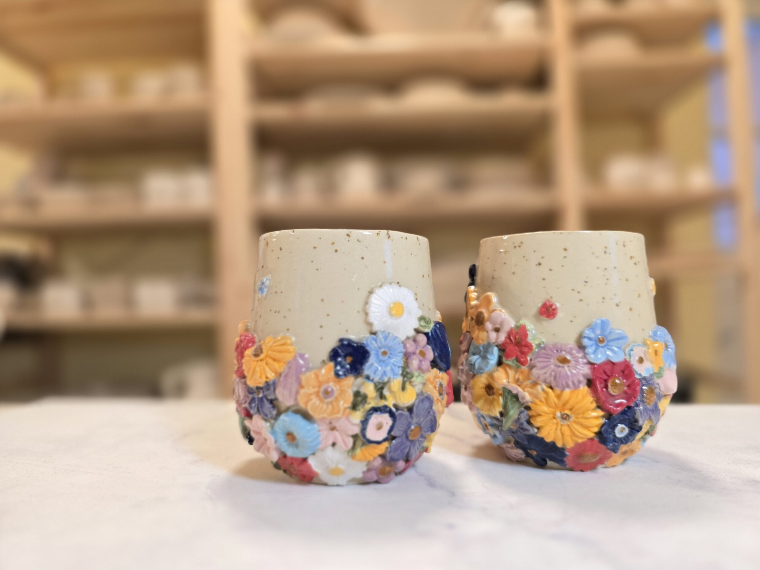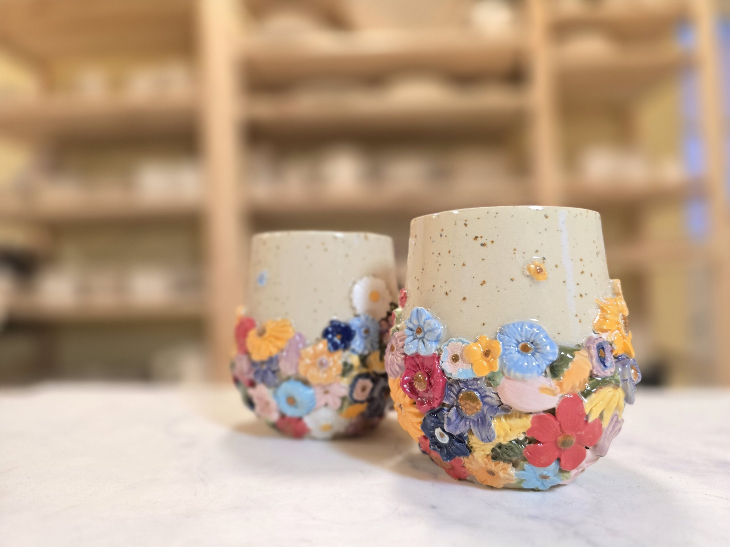 Håndlavet stentøjskrus (3,5 dl) med farverige blomsterrelieffer på prikket overflade. Robust, dekorativt og perfekt til kaffe eller te.
