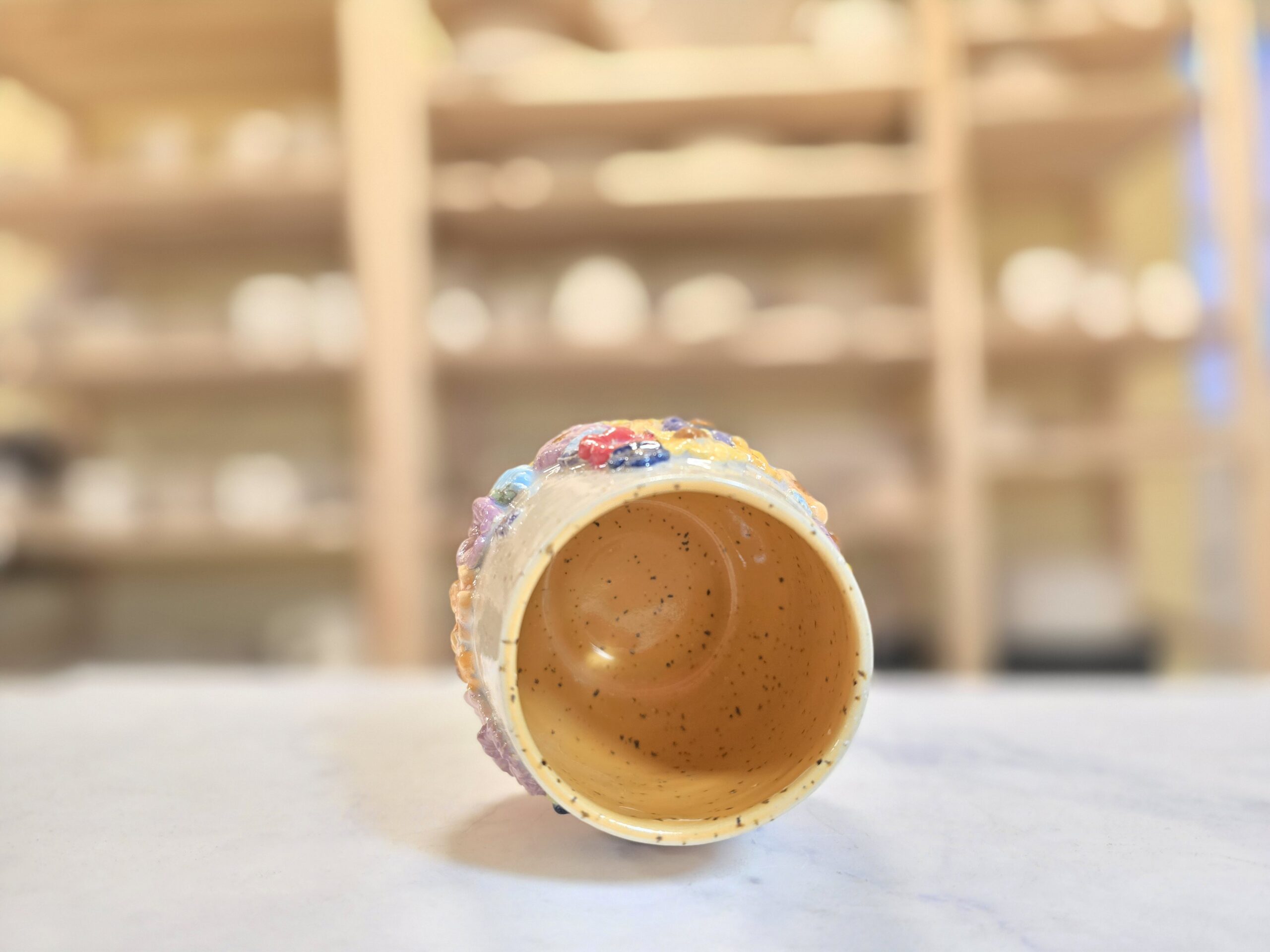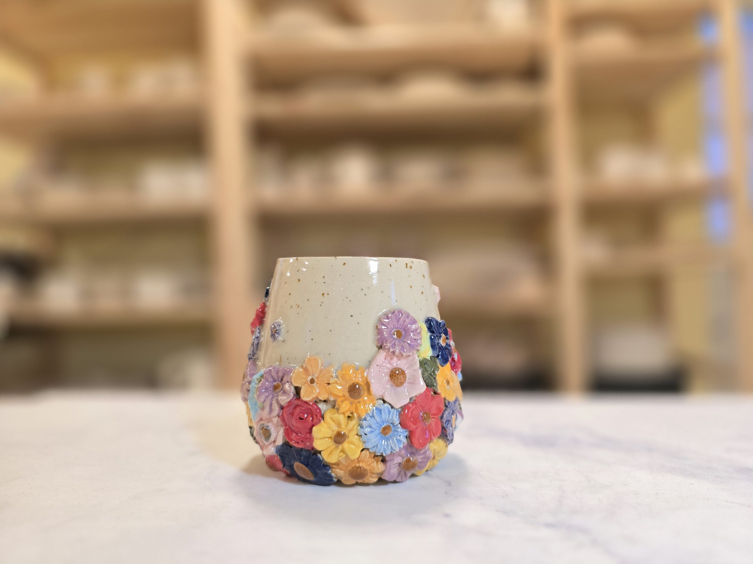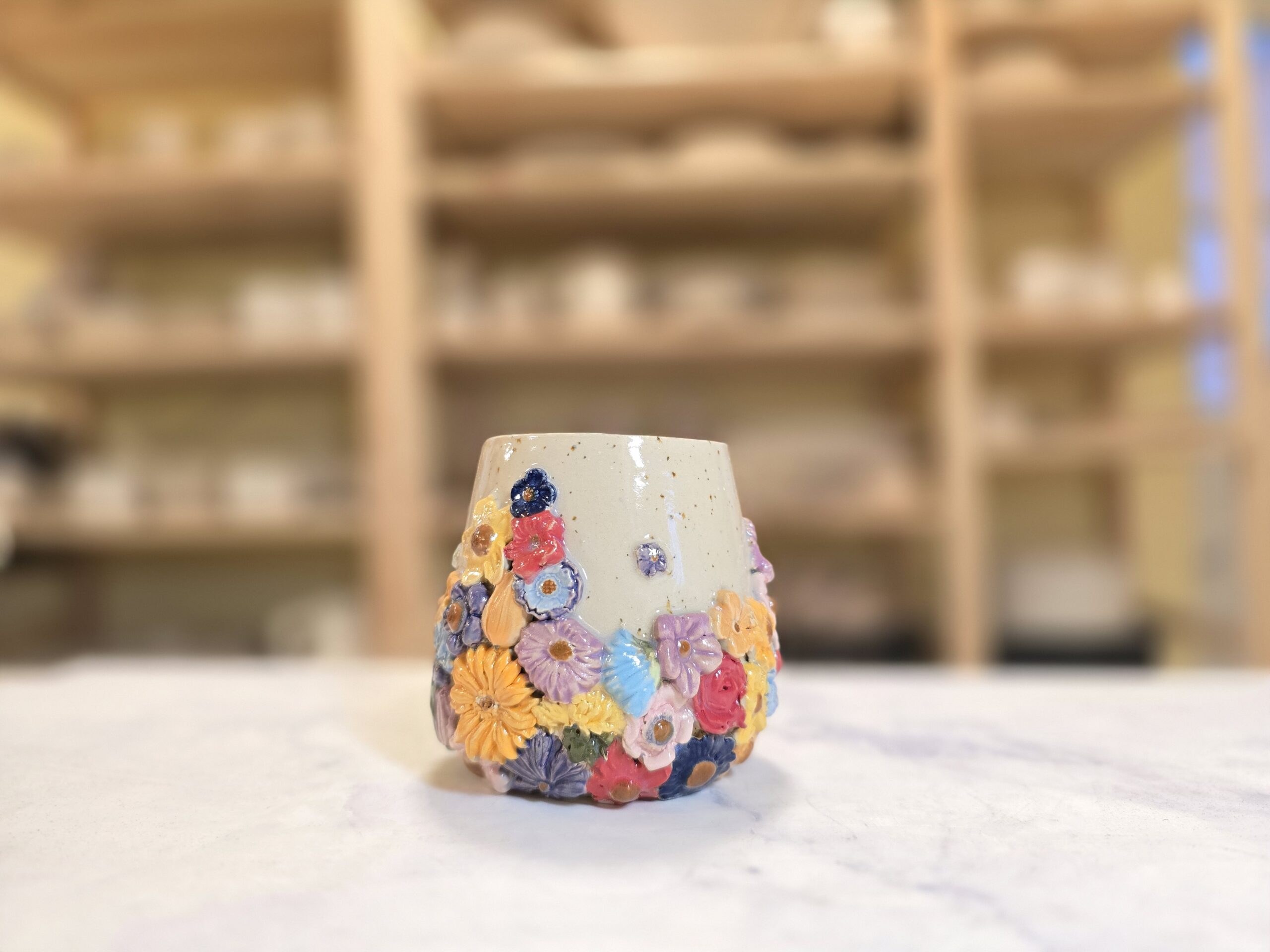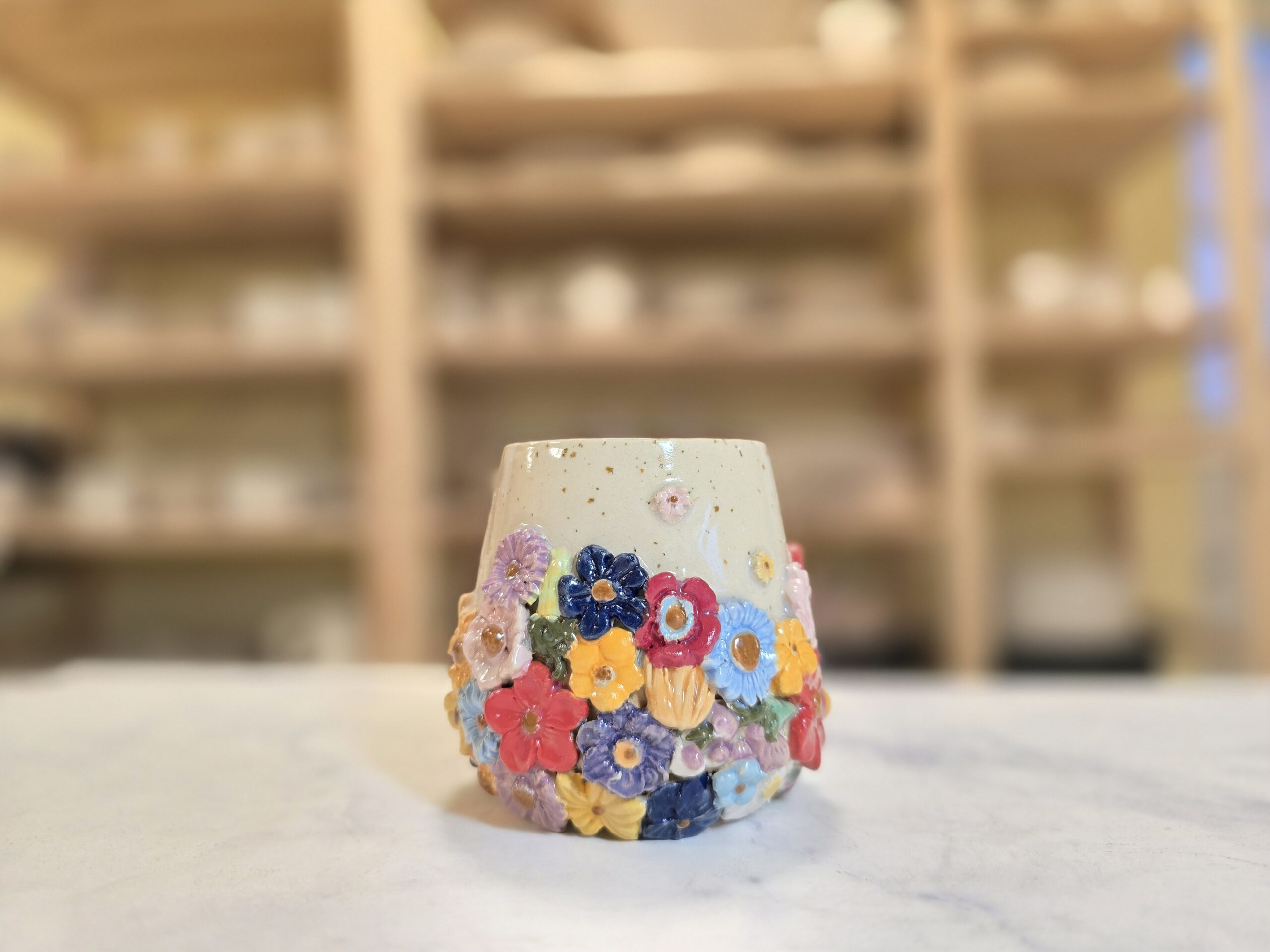 Håndlavet stentøjskrus (2,5 dl) med farverige blomsterrelieffer på en varm, prikket overflade. Dekorativt og velegnet til daglig brug.