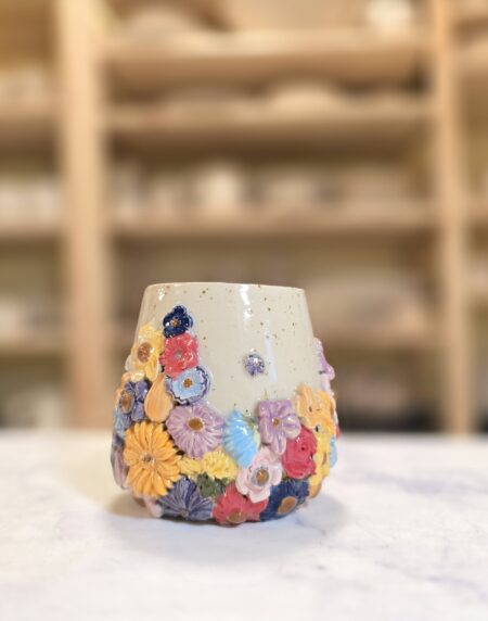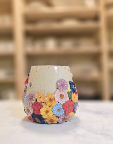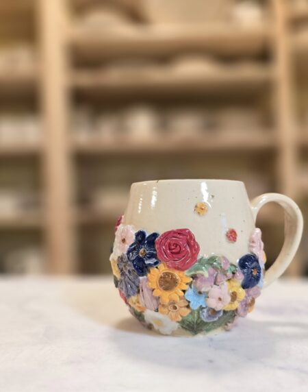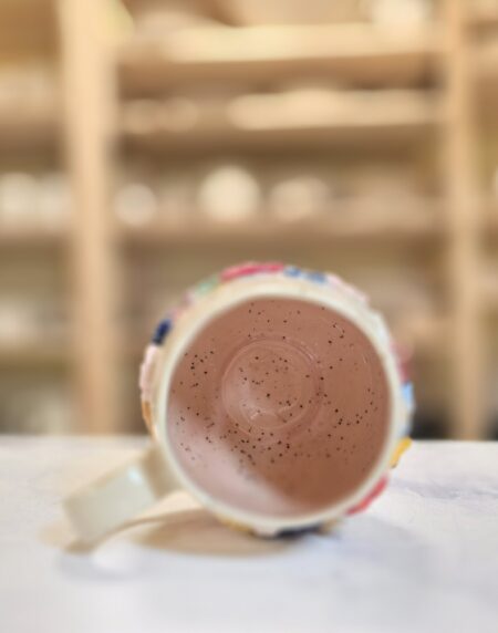 Denne farverige kop har et unikt design med blomsterdetaljer og en dyb rød inderside. Den er ideel til varme drikke og tilføjer et festligt præg til din dagligdag.