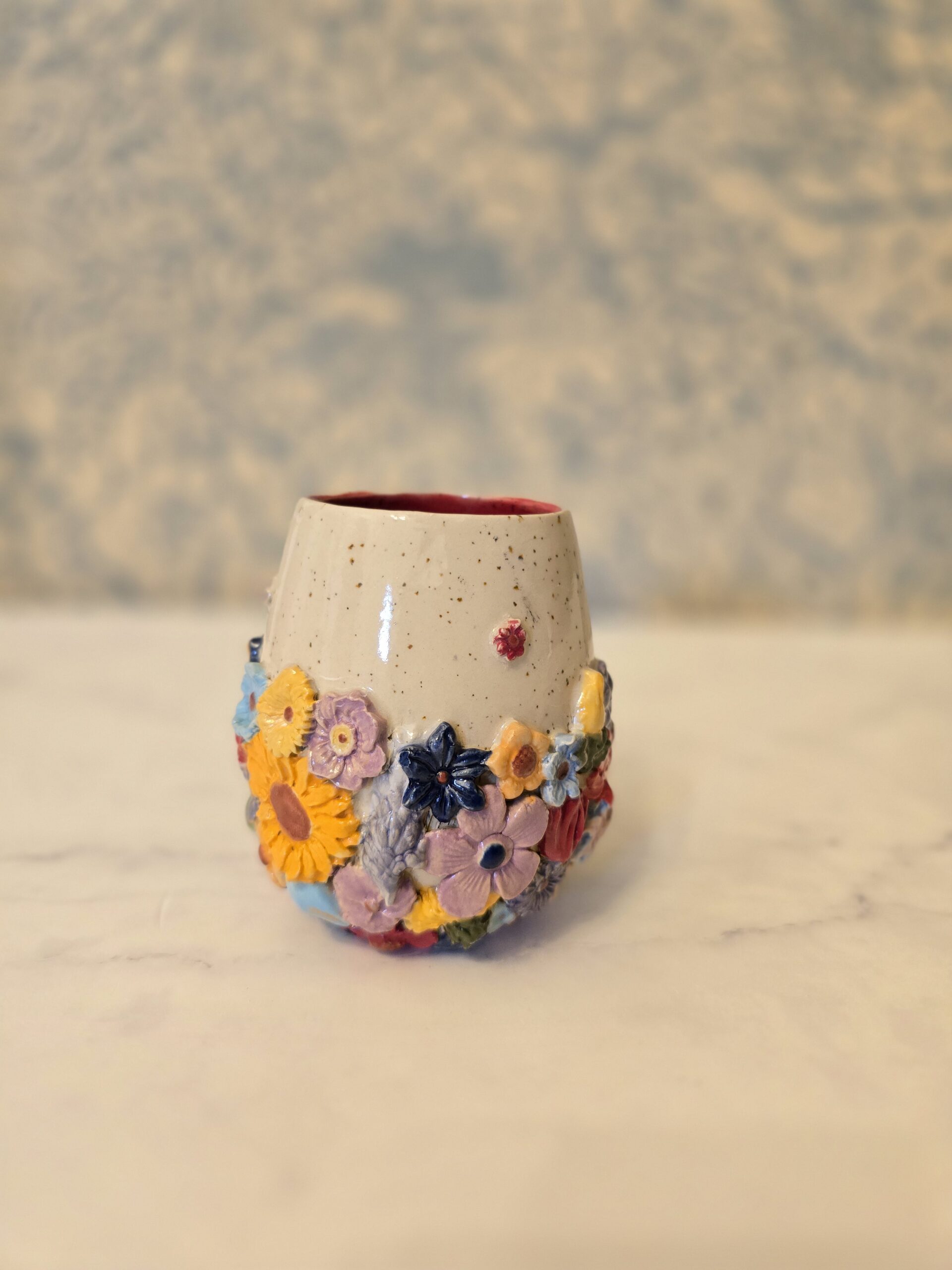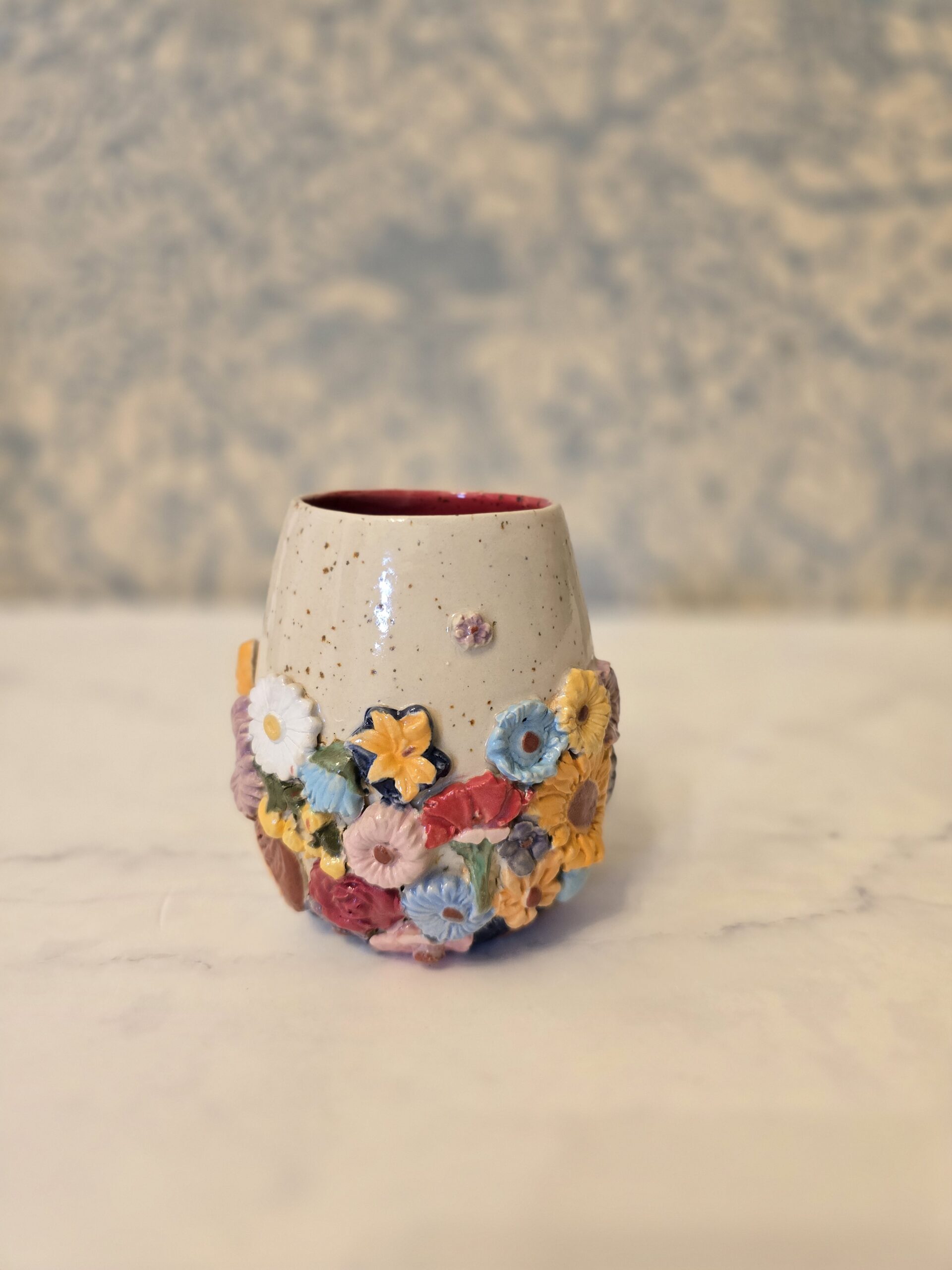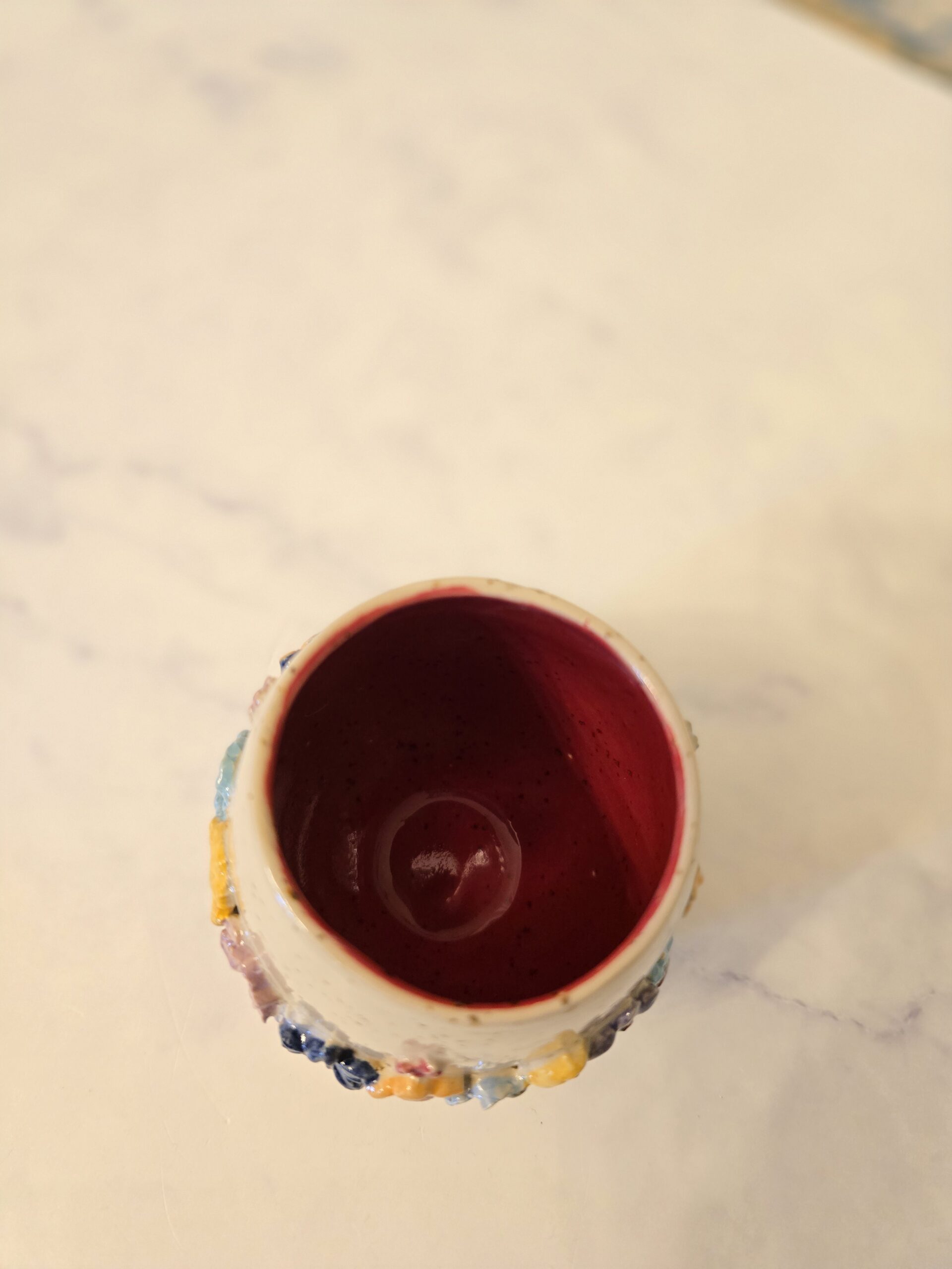 Denne farverige kop har et unikt design med blomsterdetaljer og en dyb rød inderside. Den er ideel til varme drikke og tilføjer et festligt præg til din dagligdag.