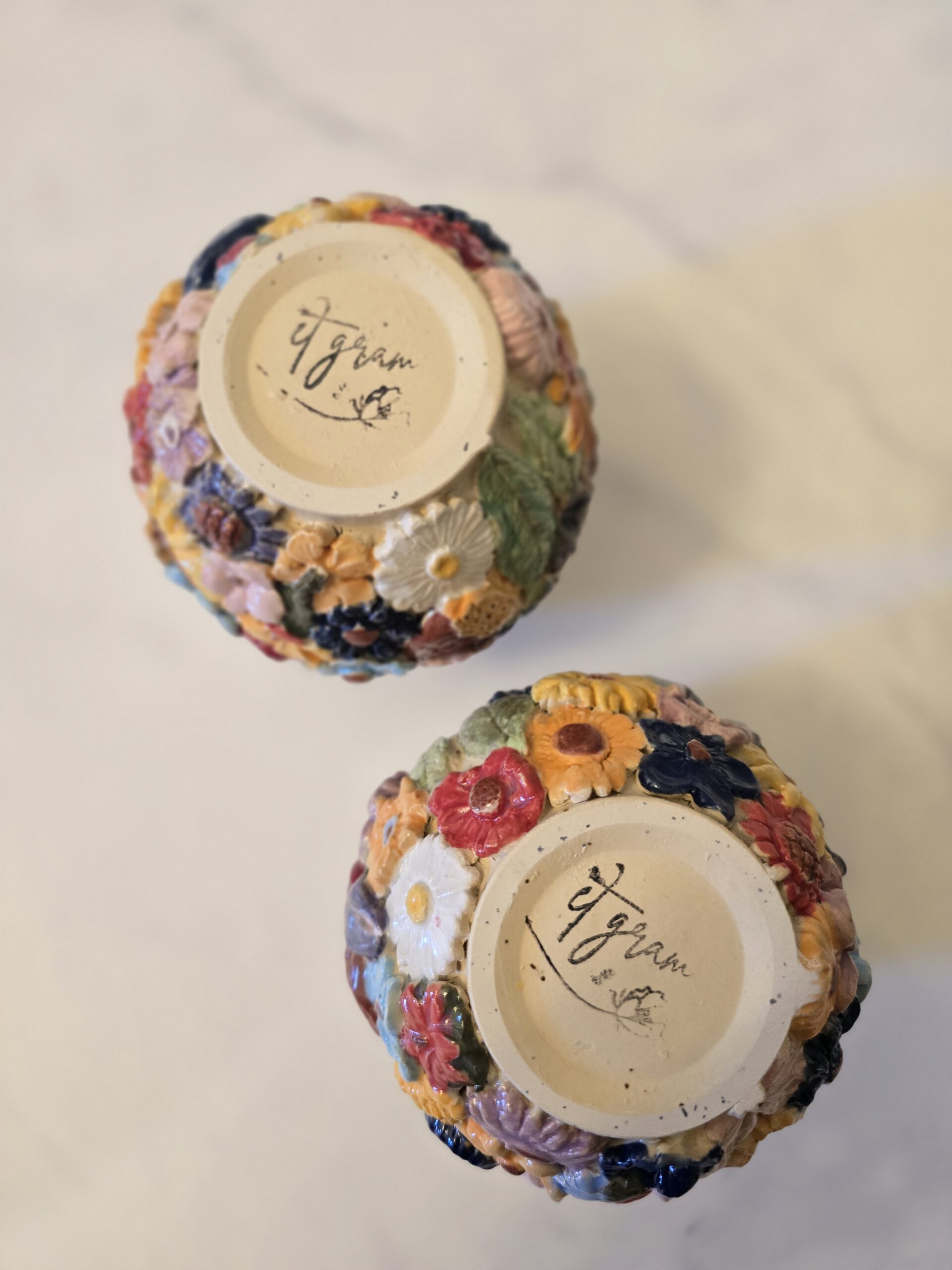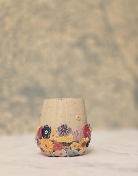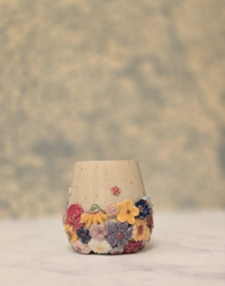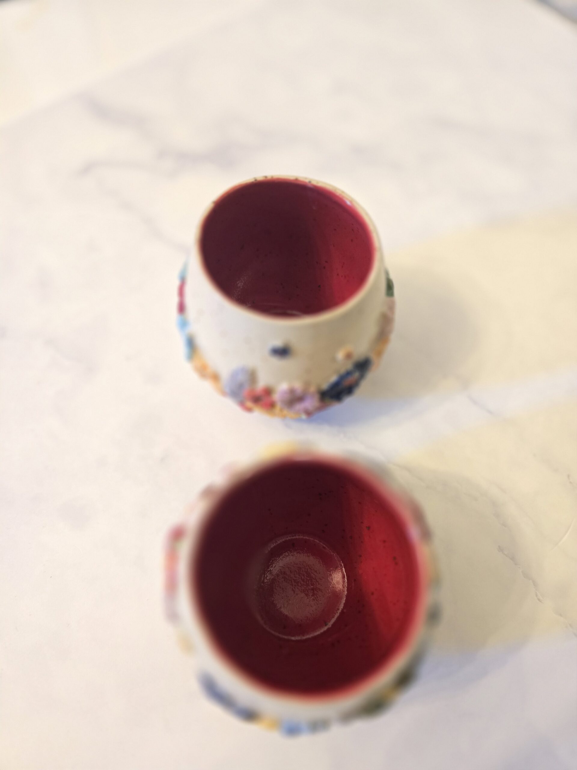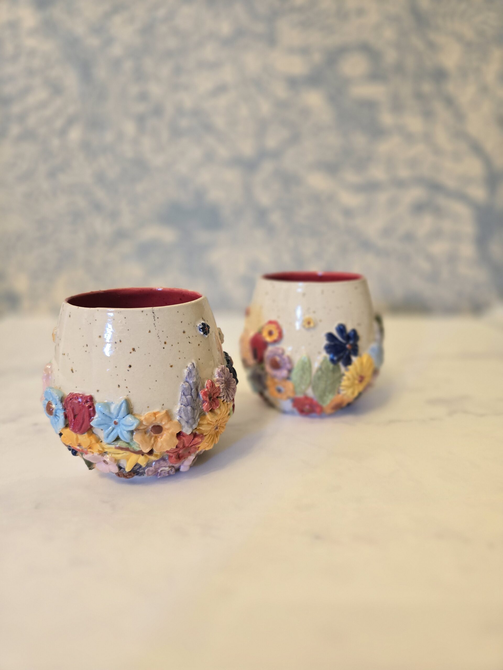 Denne farverige kop har et unikt design med blomsterdetaljer og en dyb rød inderside. Den er ideel til varme drikke og tilføjer et festligt præg til din dagligdag.