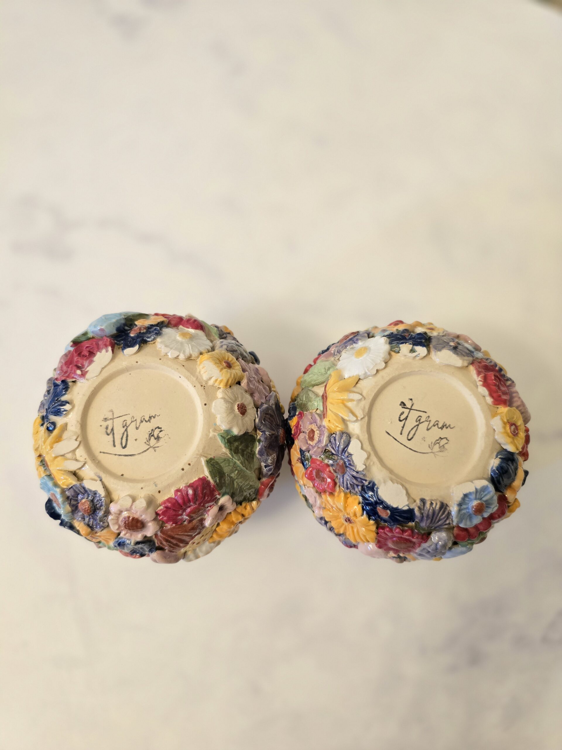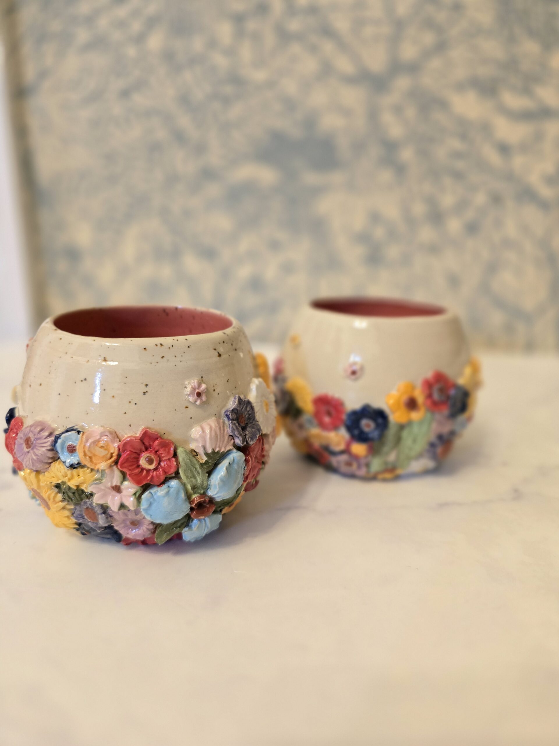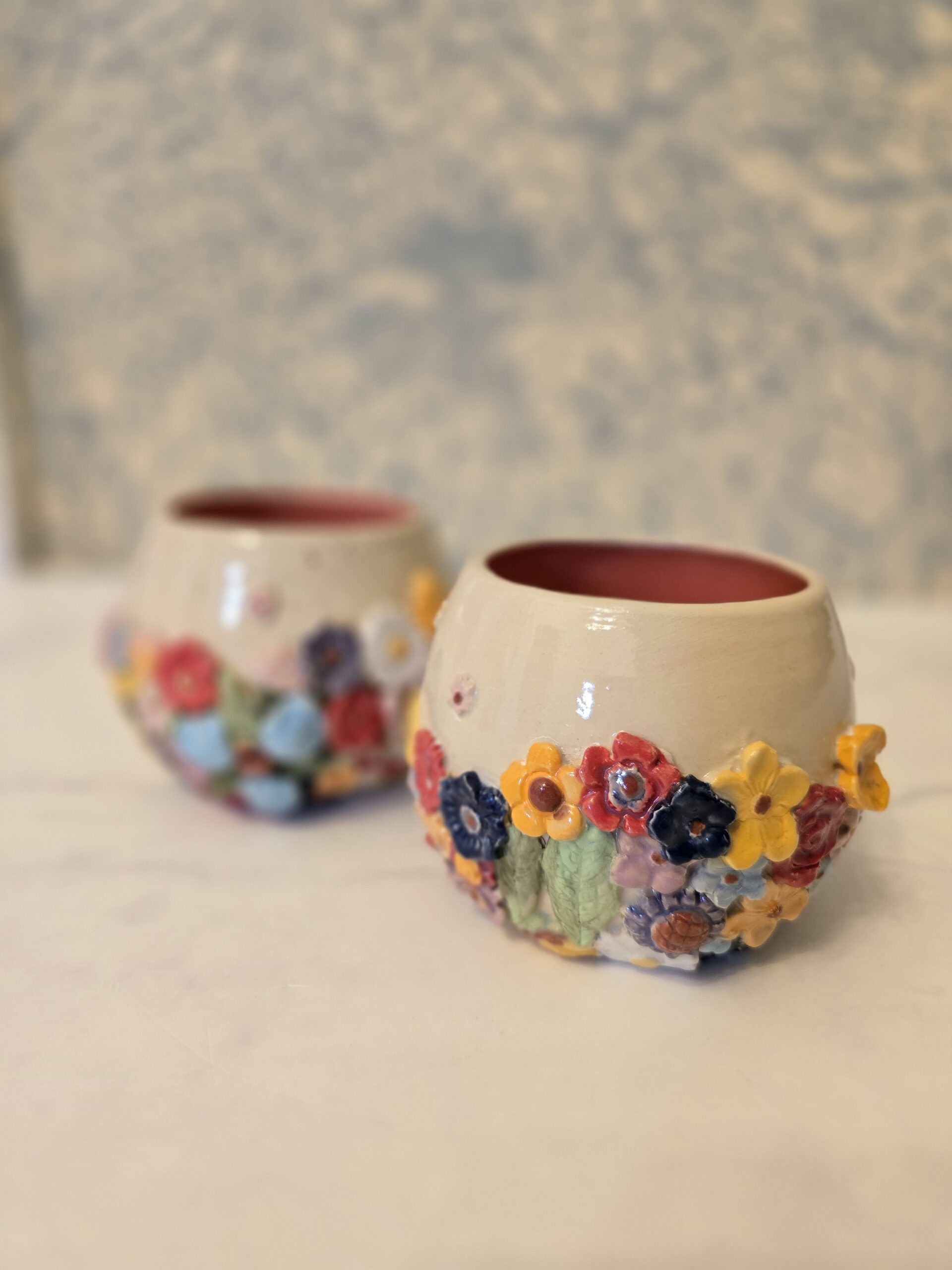 Denne smukke kop rummer ca. 4 dl og er dekoreret med farverige blomsterdetaljer. Den dybe røde inderside tilføjer et livligt præg til din drikkeoplevelse.