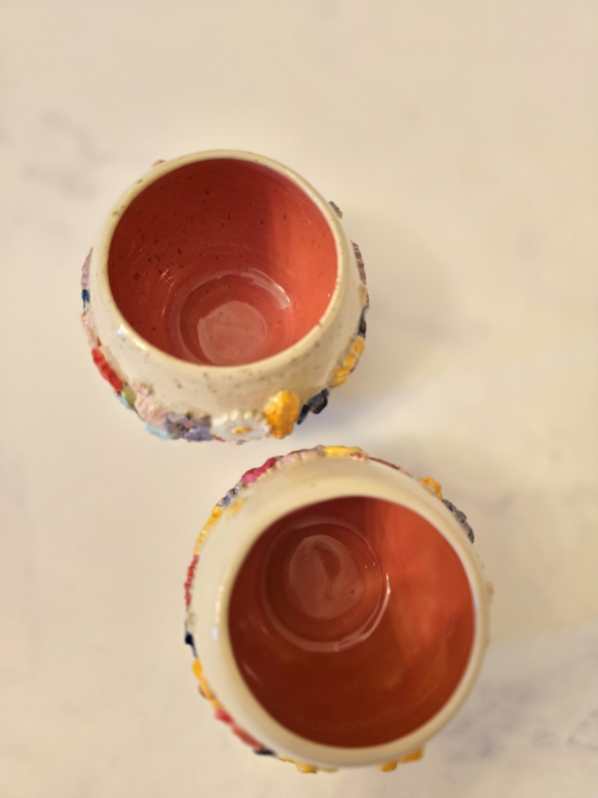 Oplev denne charmerende kop, der kombinerer funktionalitet med kunstnerisk flair. Med en kapacitet på ca. 4 dl er den ideel til servering af varme drikke som kaffe, te eller kakao. Den unikke blomsterudsmykning og den dybe røde inderside gør den til et smukt indslag i dit køkken.