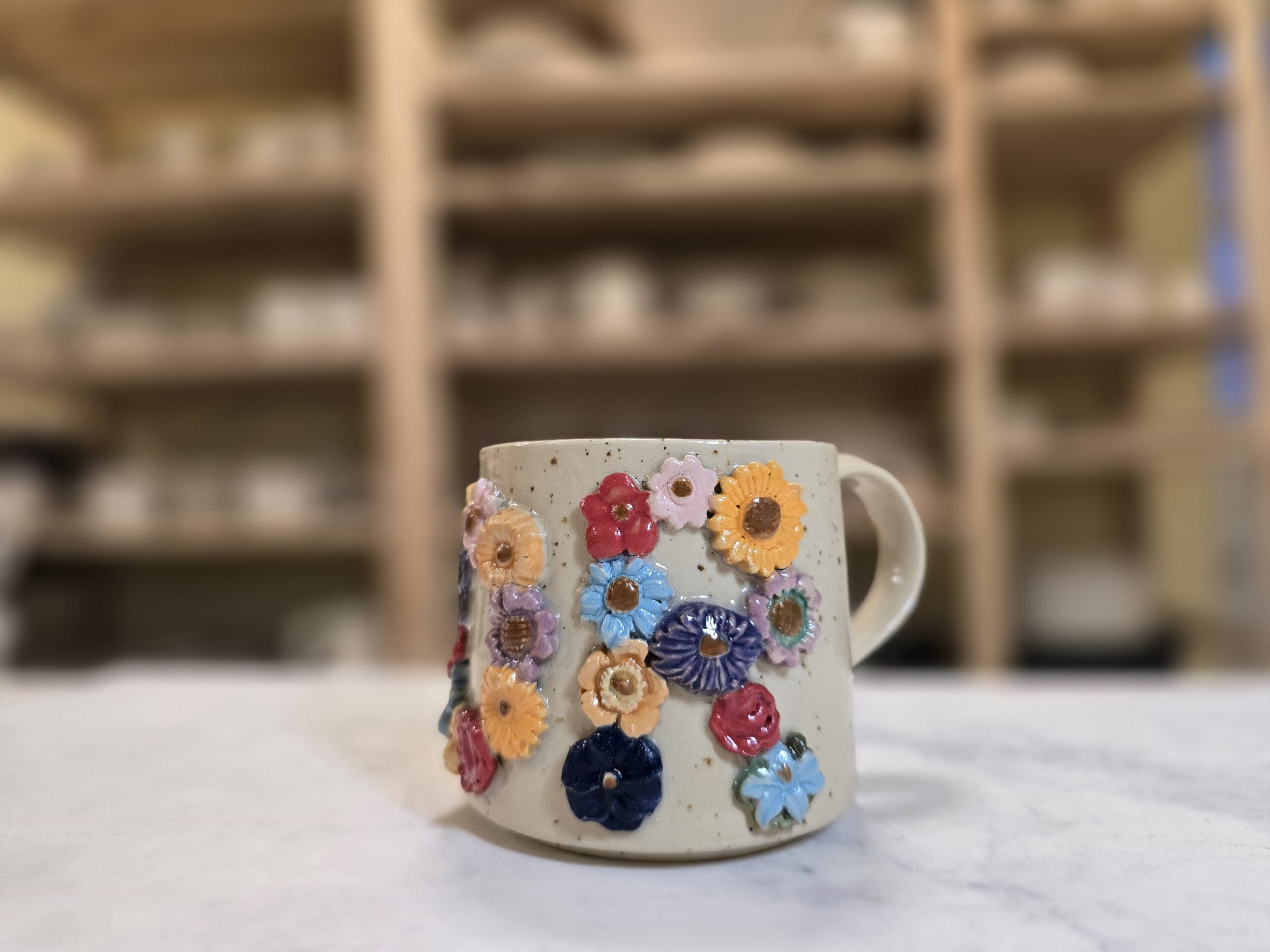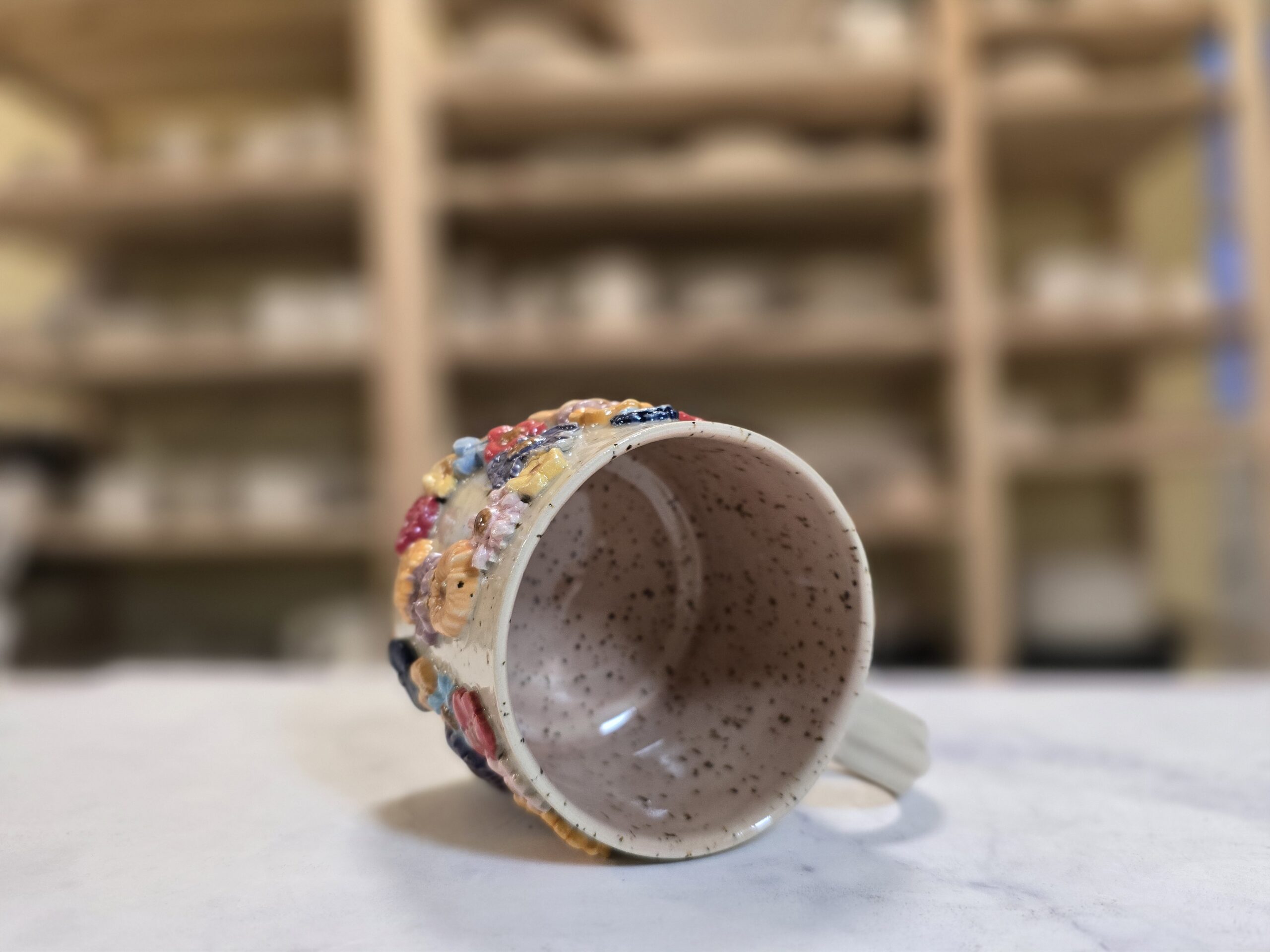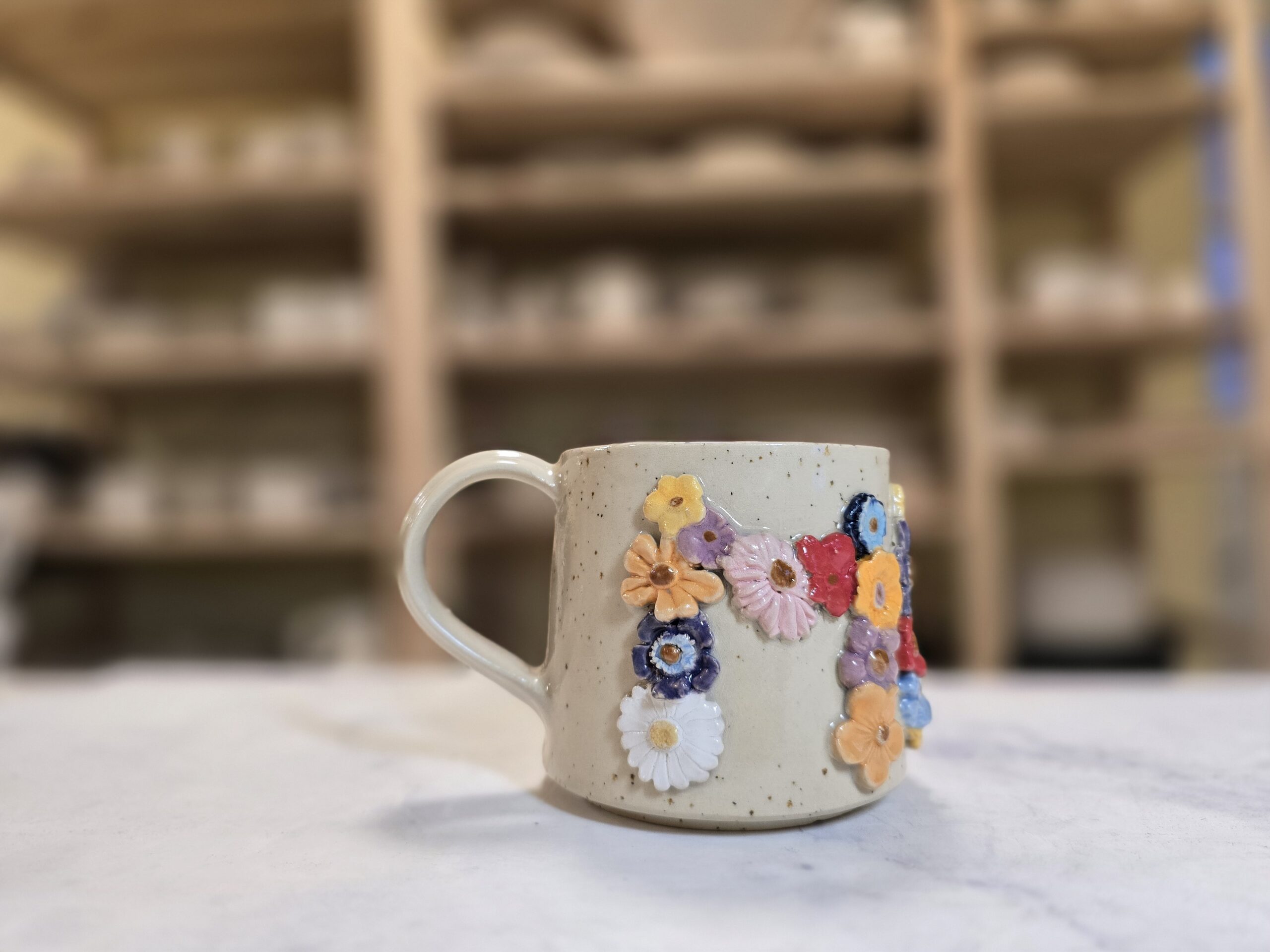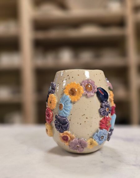 Robust, håndlavet krus i stentøj med et rumfang på 3,0 dl. Ydersiden er prydet af et tæt mønster af små, glaserede blomster i klare pasteller og dybere nuancer, som giver kruset et levende, tekstureret udtryk. Overfladen har en varm, speklet lerbase, mens indersiden er glaseret (lys rosa/neutral tone) for nem rengøring. Kruset har en komfortabel hank og passer godt til både hverdag og gavebrug. Hver kop er unik — små variationer i form, farve og glasur kan forekomme.