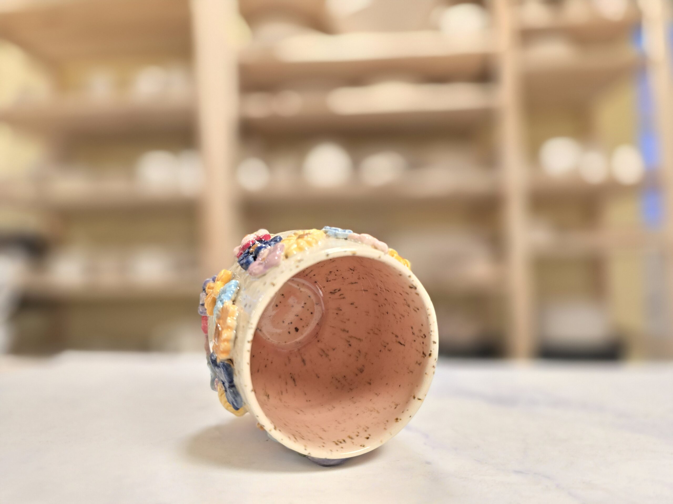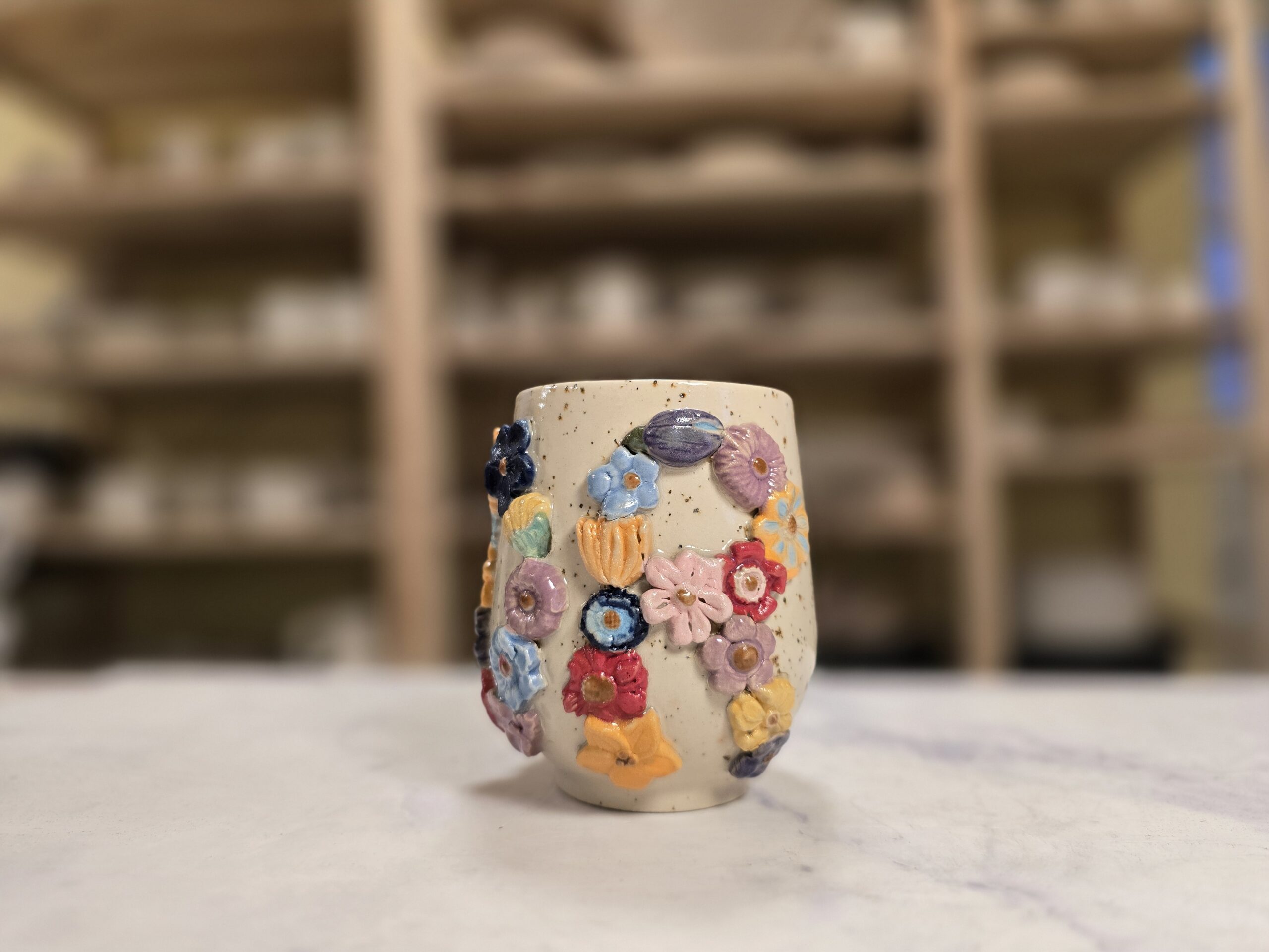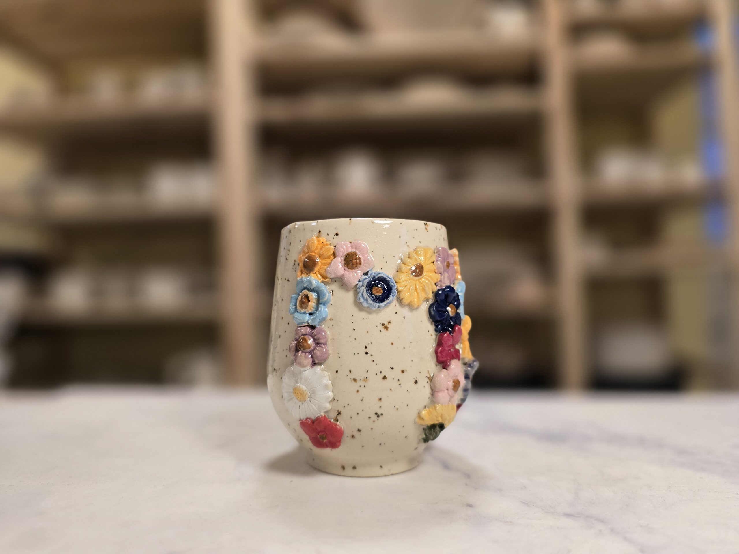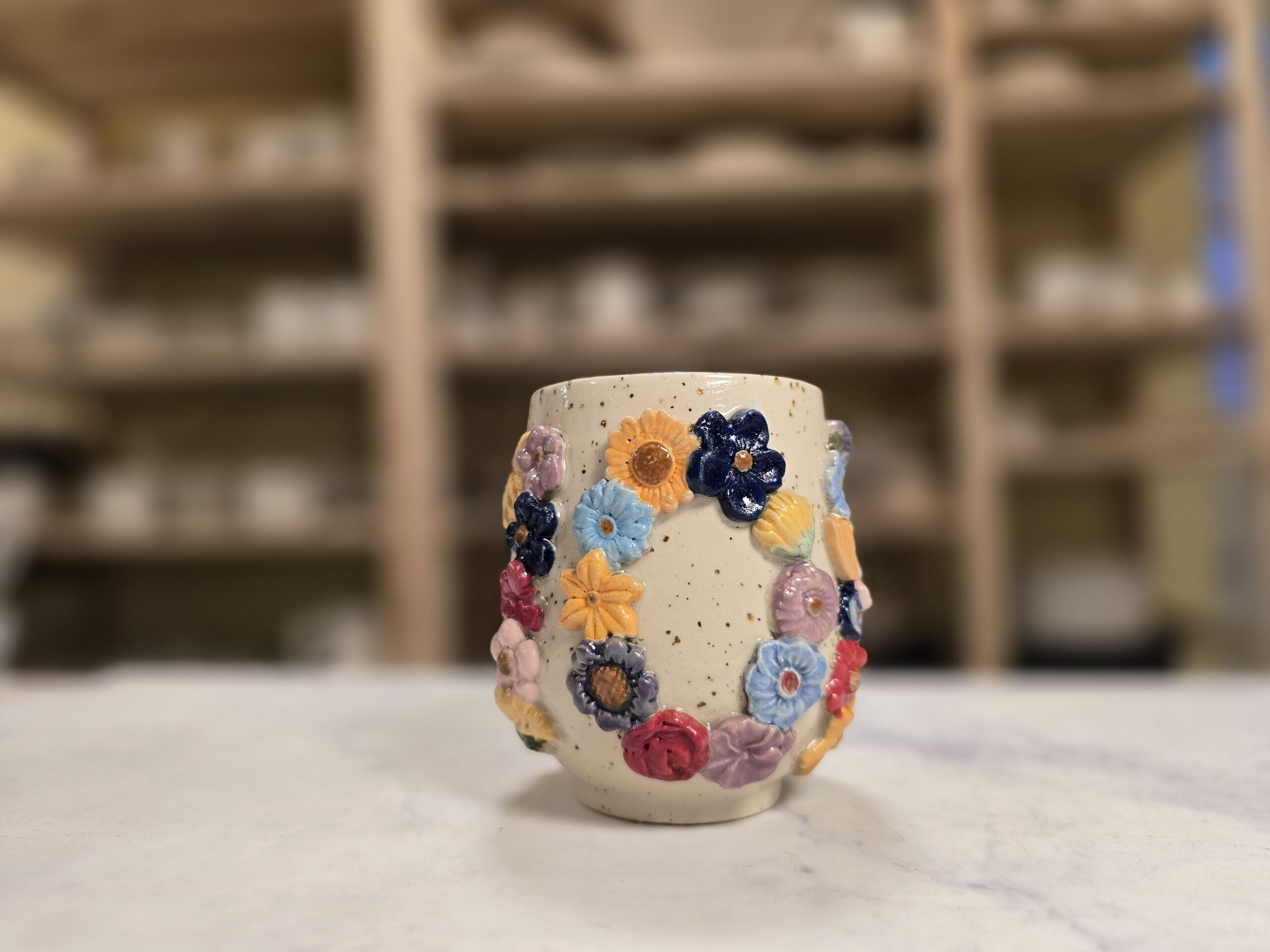 Robust, håndlavet krus i stentøj med et rumfang på 3,5 dl. Ydersiden er dekoreret med et bredt, tæt mønster af små, glaserede blomster i et bredt spektrum af farver, som skaber et livligt, farverigt udtryk. Overfladen har en varm, spækket lerbase, mens indersiden er glaseret (neutral tone) for nem rengøring. Kruset har en behagelig hank, som gør det velegnet til både hverdag og gavegivning. Hver kop er unik – små variationer i form, farve og glasur kan forekomme.