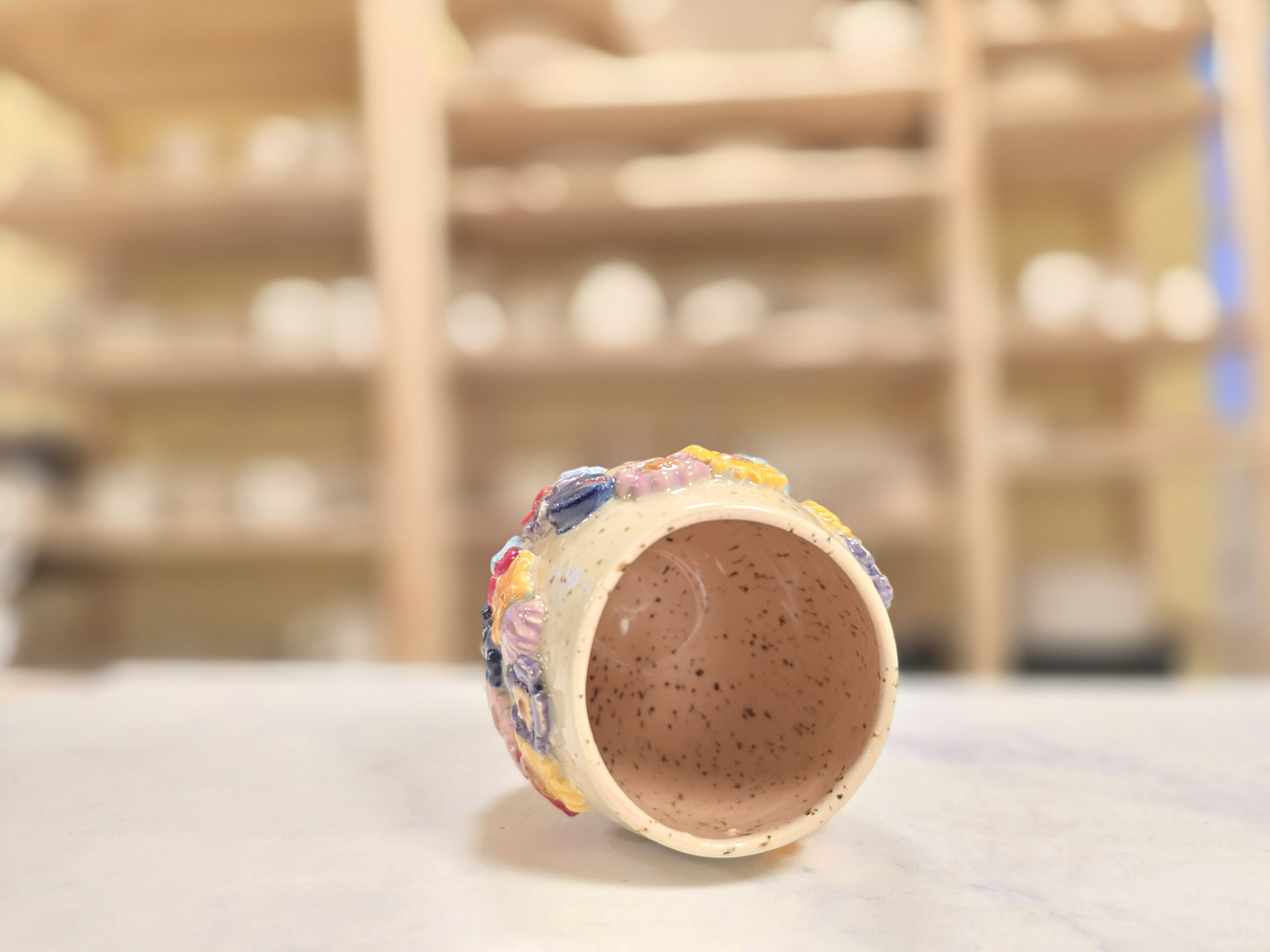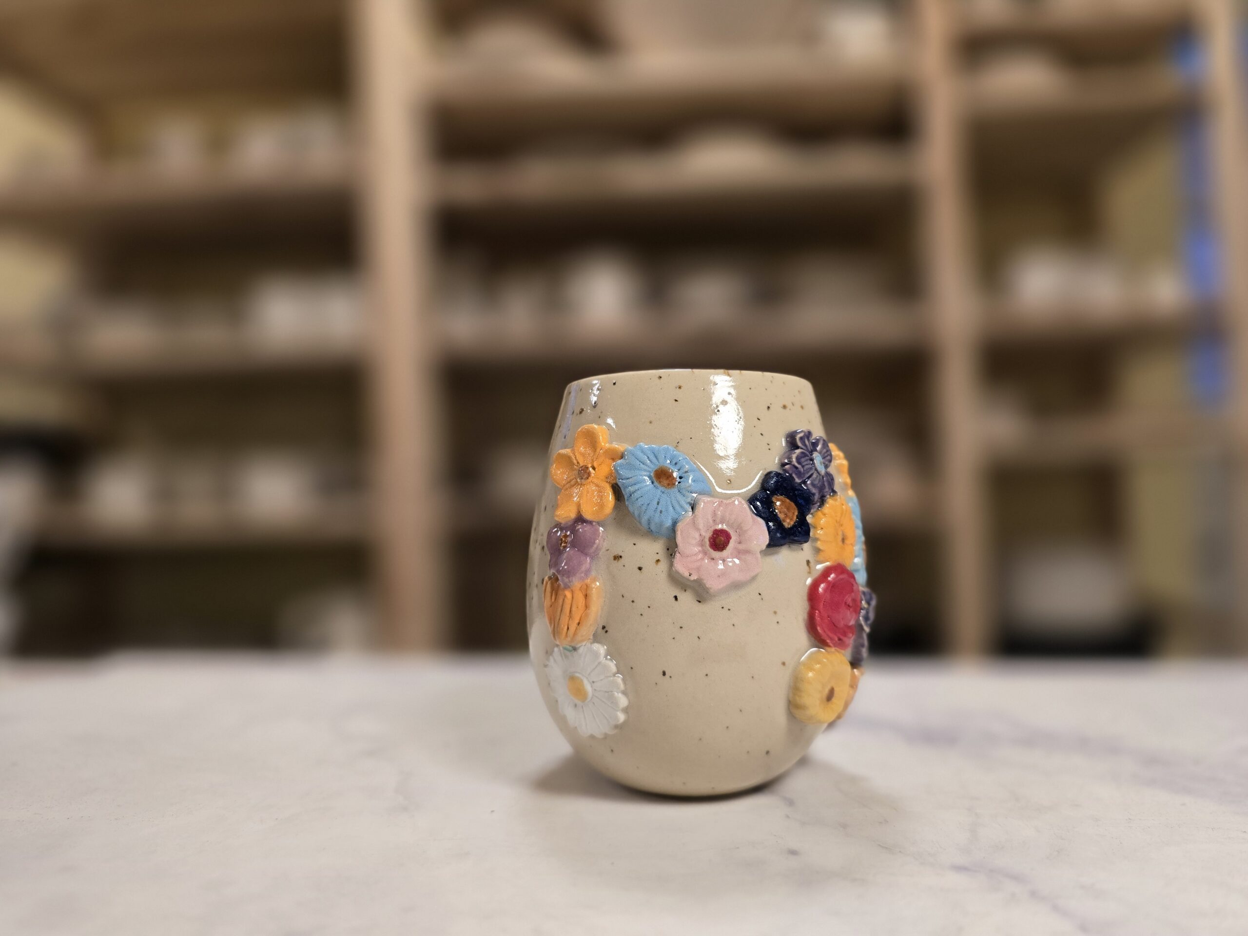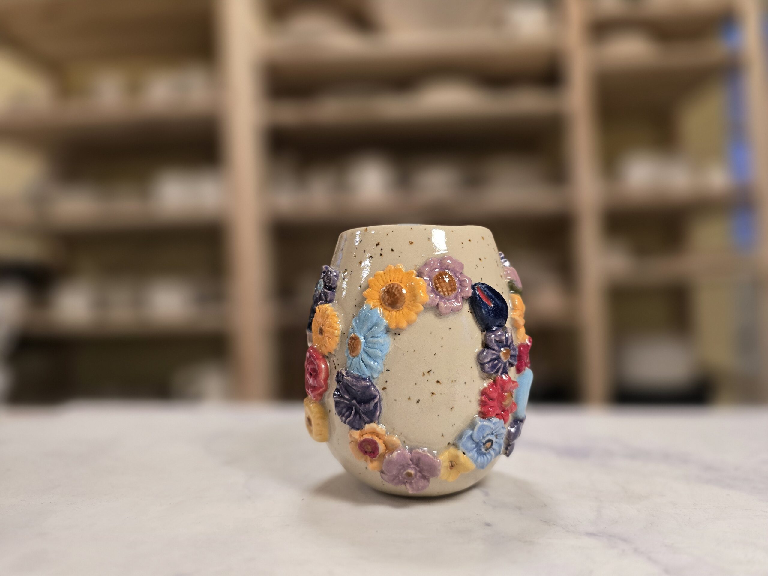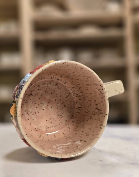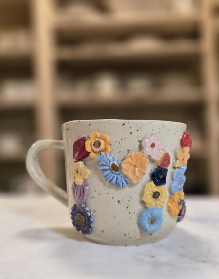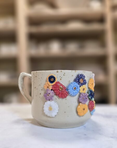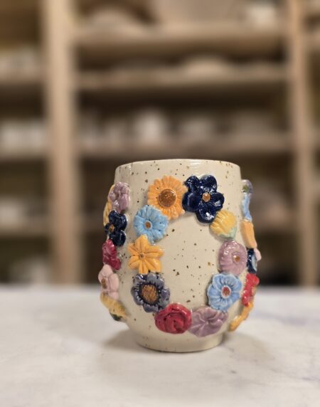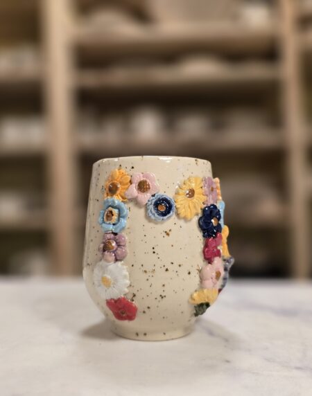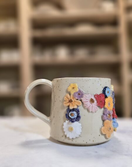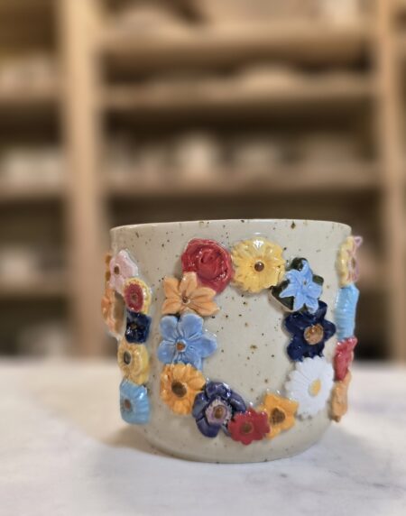 Robust, håndlavet krus i stentøj med et rumfang på 3,5 dl. Ydersiden er dekoreret med et bredt, tæt mønster af små, glaserede blomster i et bredt spektrum af farver, som skaber et livligt, farverigt udtryk. Overfladen har en varm, spækket lerbase, mens indersiden er glaseret (neutral tone) for nem rengøring. Kruset har en behagelig hank, som gør det velegnet til både hverdag og gavegivning. Hver kop er unik – små variationer i form, farve og glasur kan forekomme.