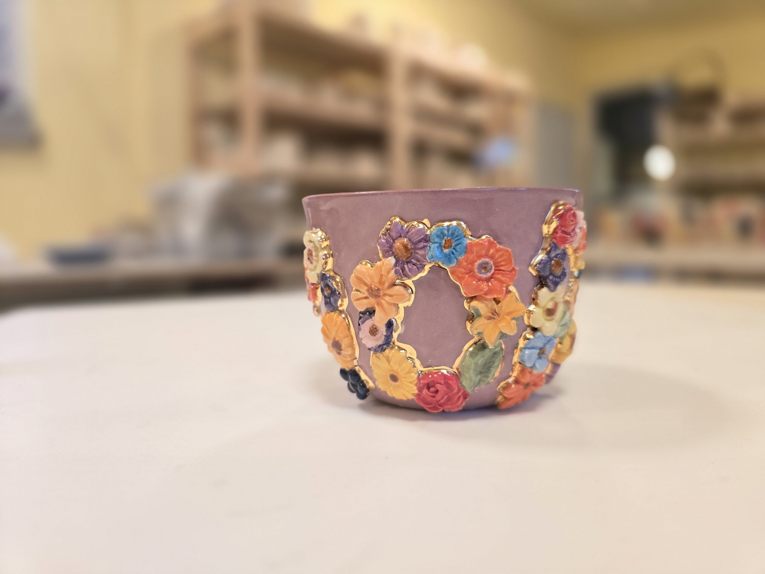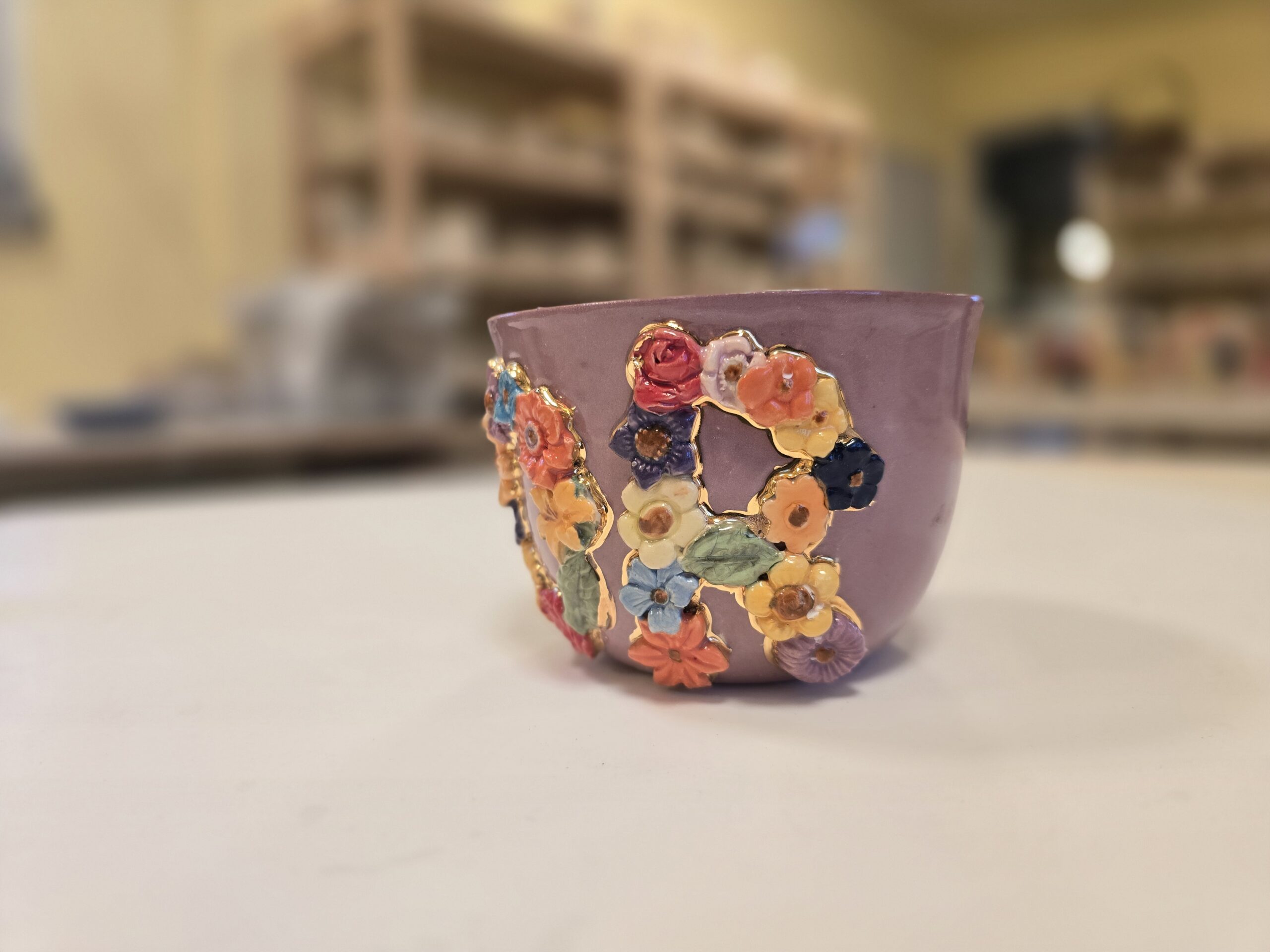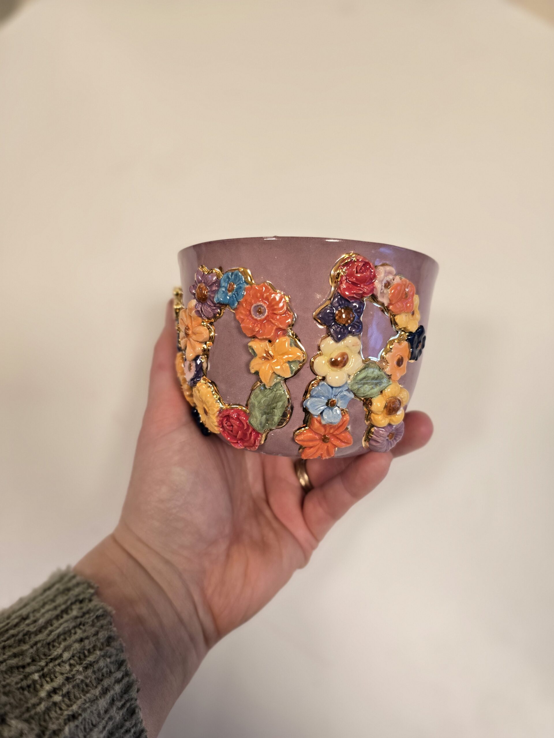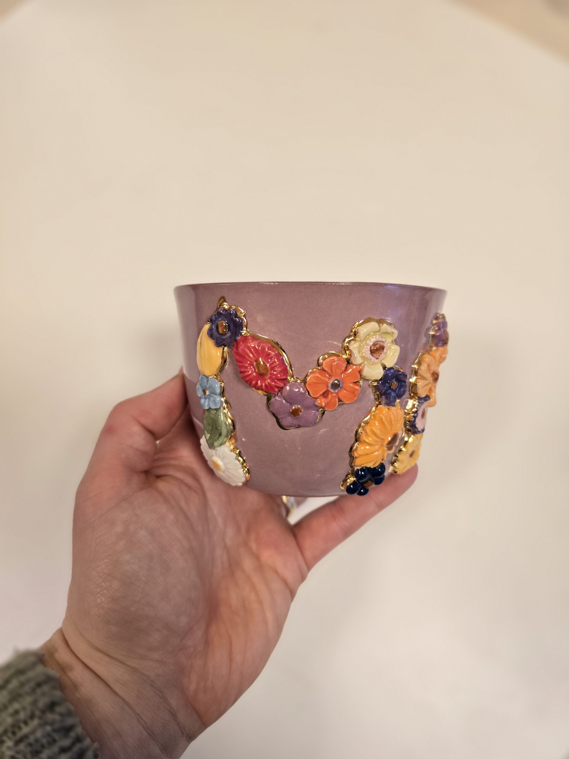 Forsiden prydes af bogstaverne MOR, formet af små håndmodellerede blomster i et farverigt blomsterrelief. Hver blomst er nænsomt indrammet med ægte guld, som påføres i en tredje brænding og giver koppen et eksklusivt og kunstnerisk udtryk.
