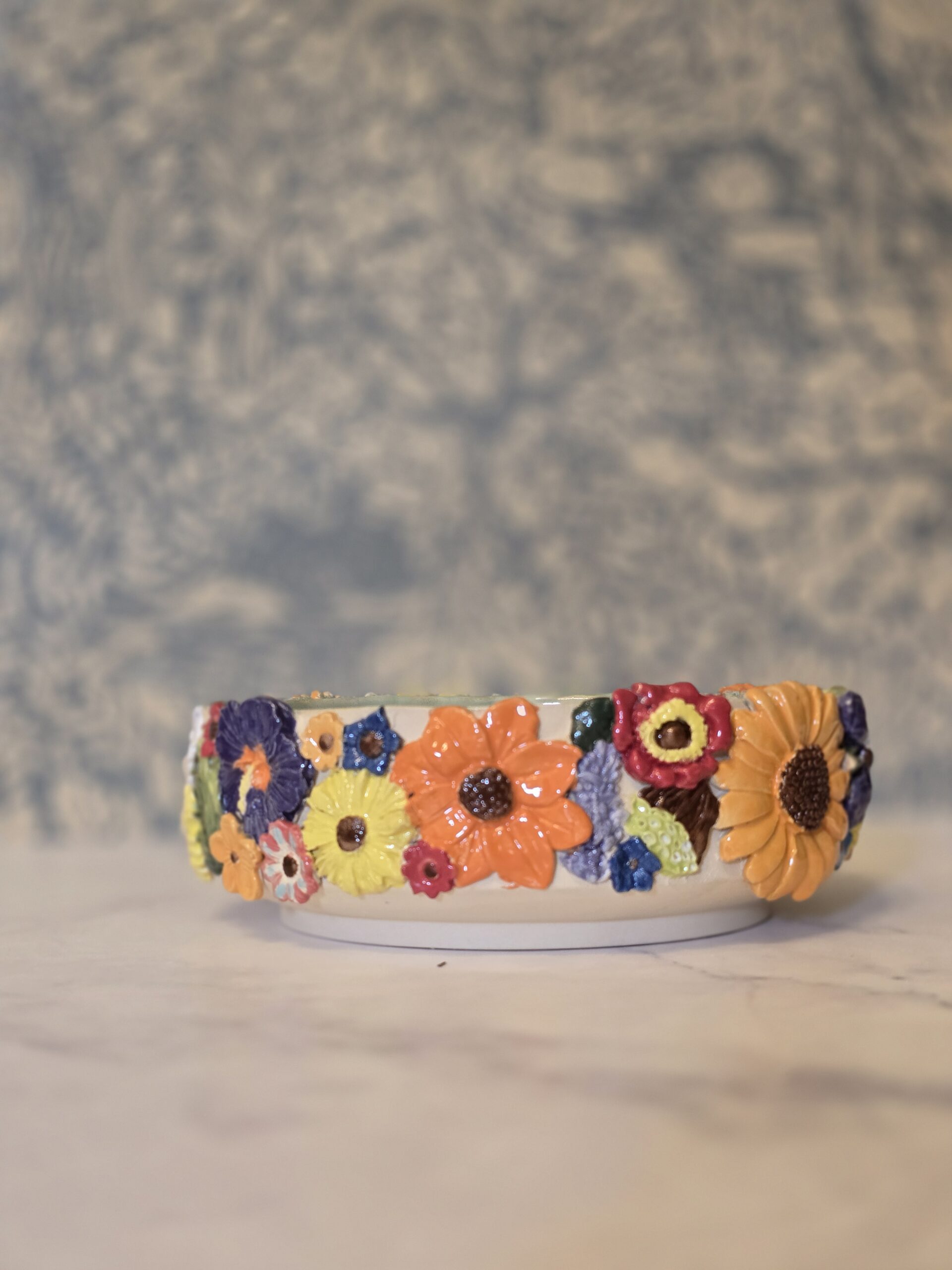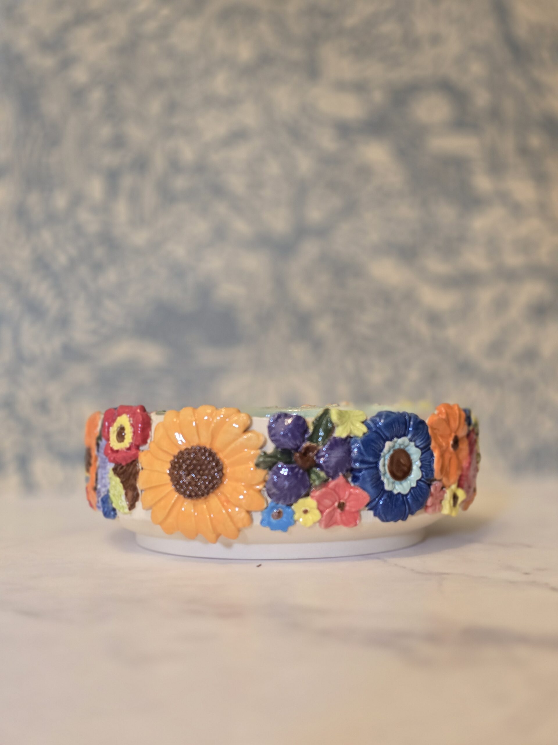 ilføj et livligt element til din indretning med denne charmerende skål, der måler 7 cm i højden og 18 cm i diameter. Udsmykket med farverige blomster og i en dejlig skovfarve, er denne skål perfekt til servering af snacks, frugter eller som en dekorativ genstand.