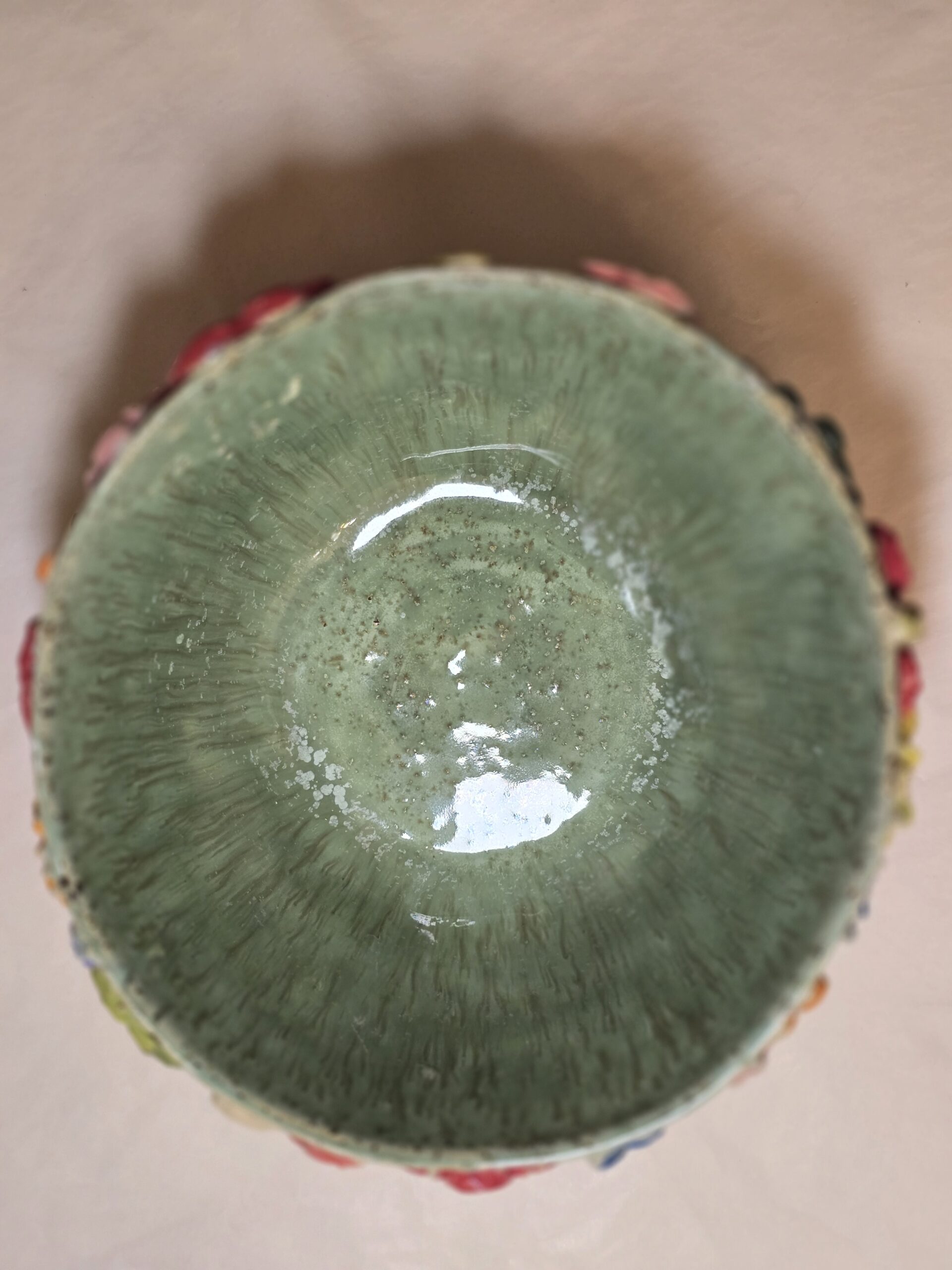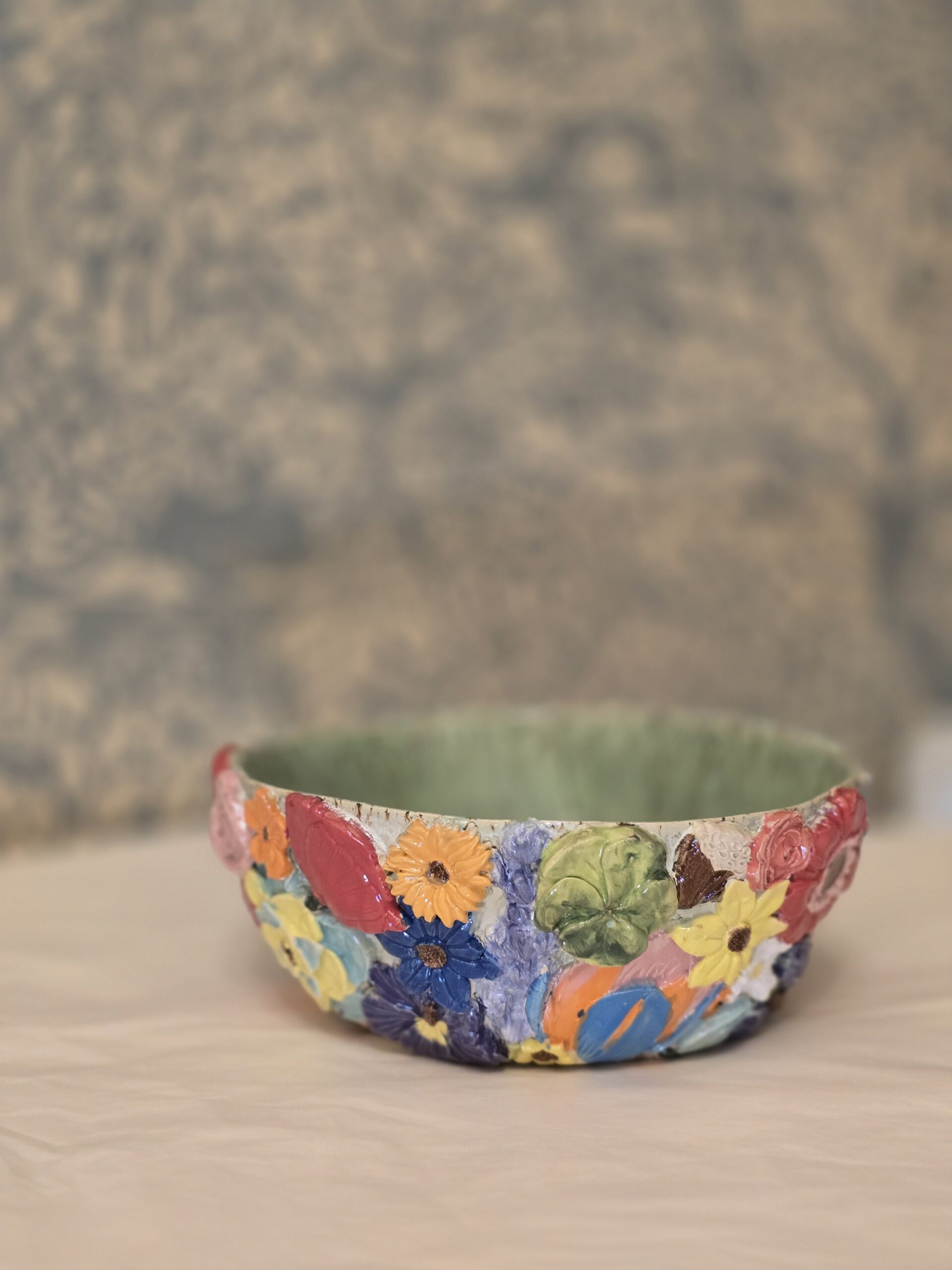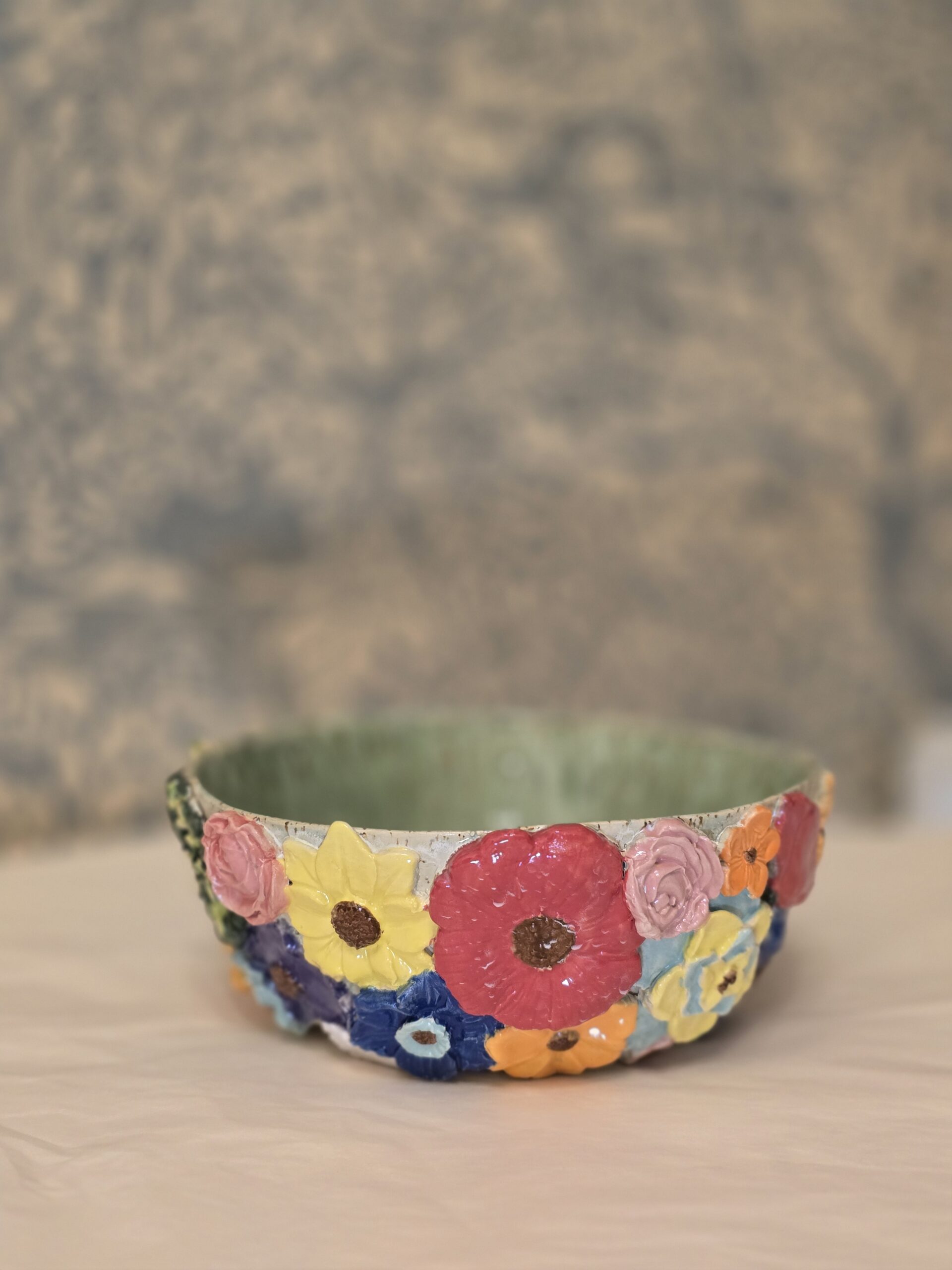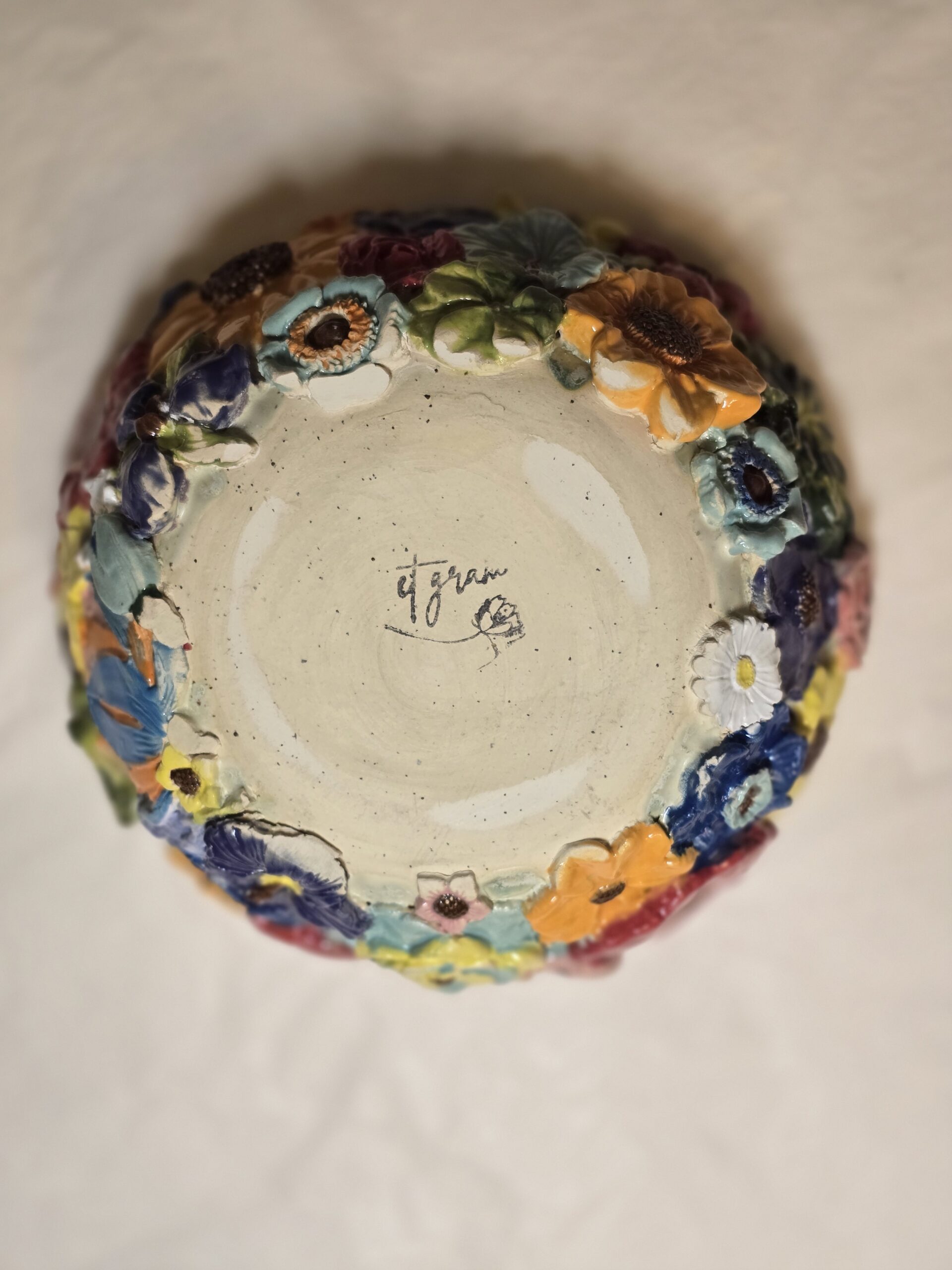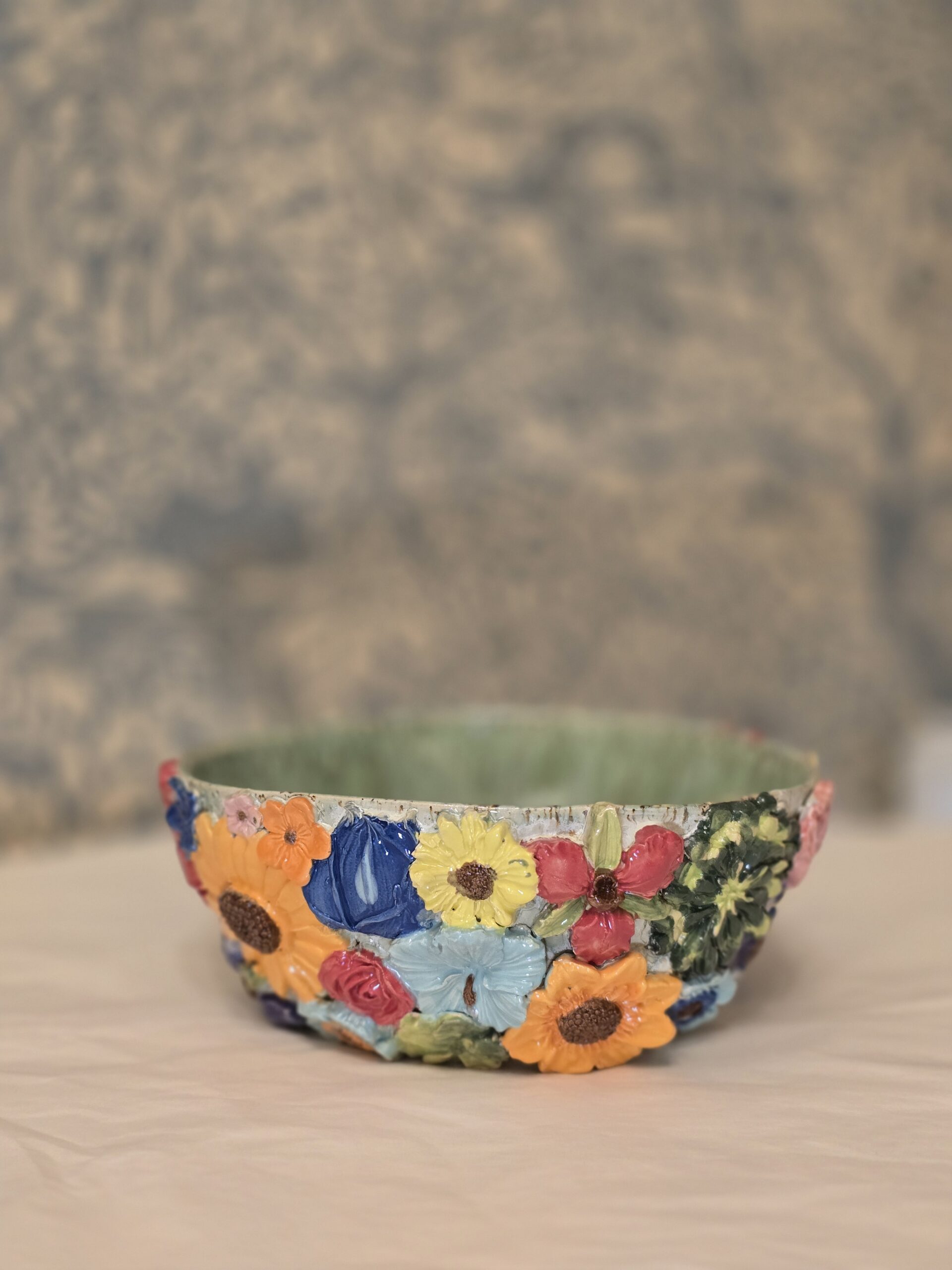 Oplev denne charmerende skål, der har en diameter på 19 cm og en højde på ca. 9 cm. Med sit farverige blomsterdesign og lavapletter er skålen perfekt til servering af snacks, salater eller som en dekorativ genstand på bordet.