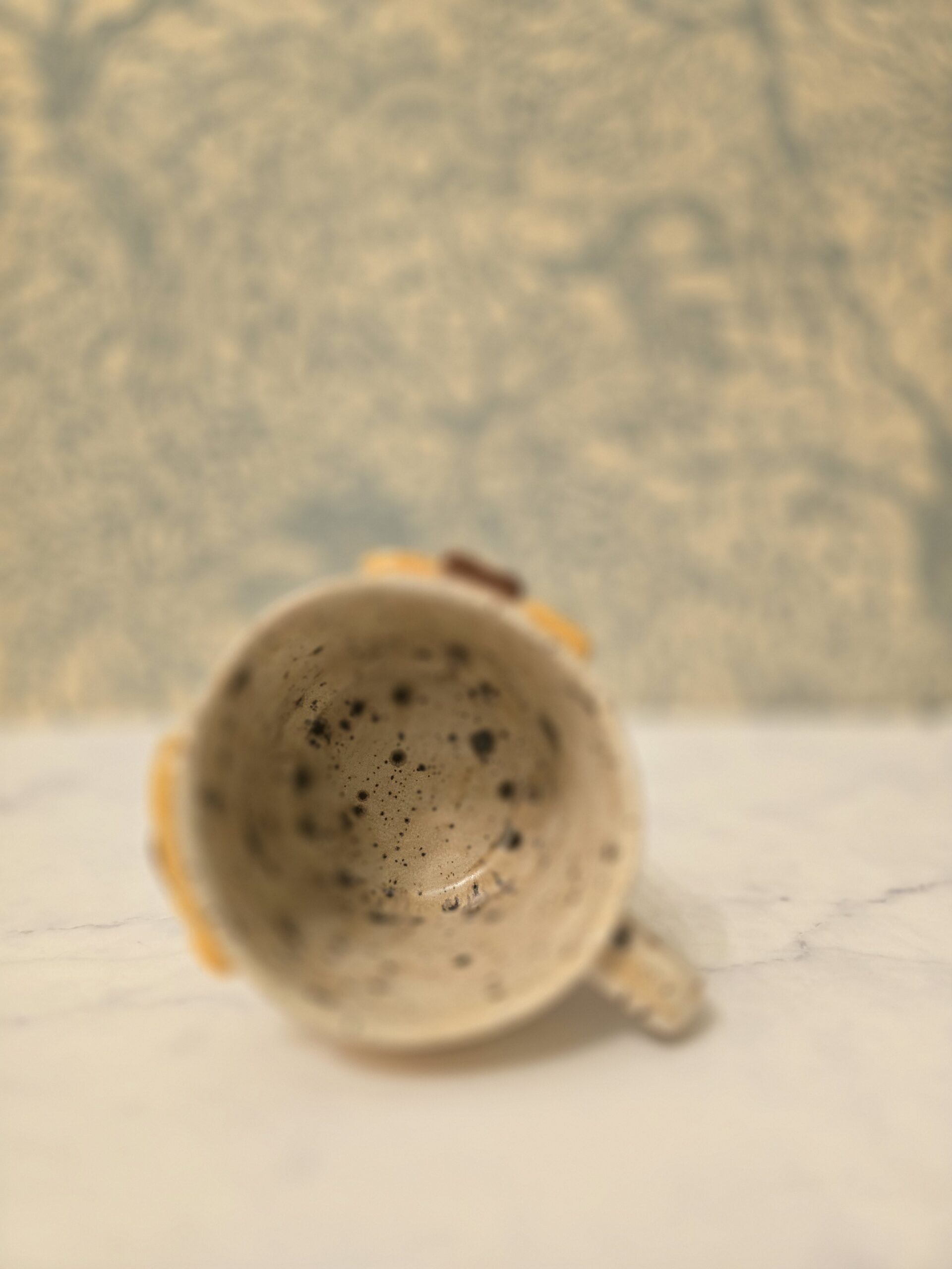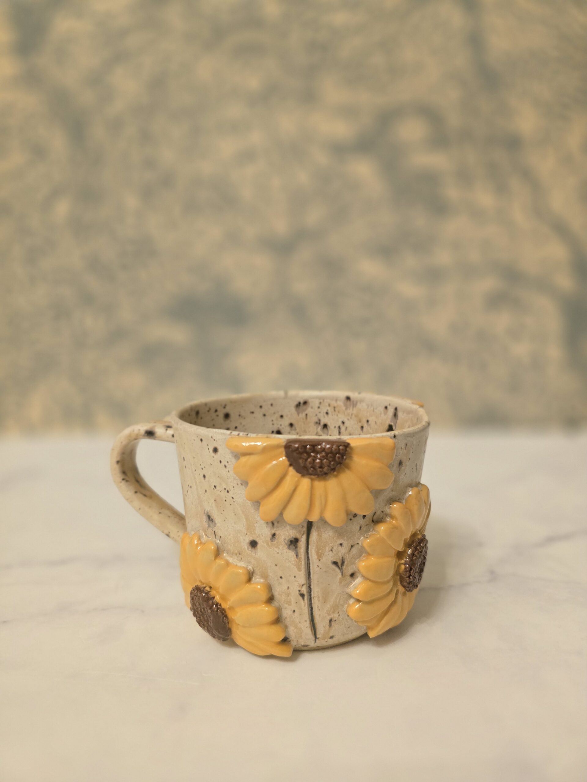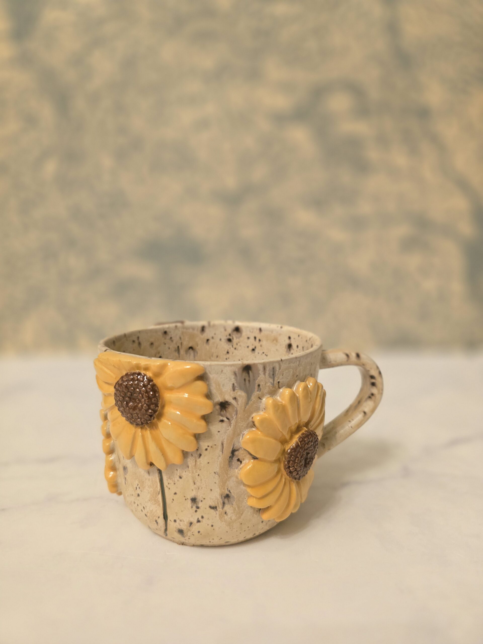 Denne håndlavede stentøjskop rummer 4 dl og er dekoreret med tredimensionelle solsikker i dyb gul glasur, der giver et solrigt og taktilt udtryk på en varm, specklet lerbase. Koppen er robust i materiale og design, perfekt til daglig brug eller som en glad gave. Hver kop har små variationer i form og glasur, hvilket gør hvert eksemplar unikt.