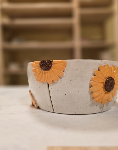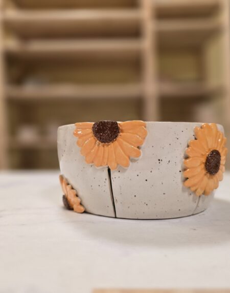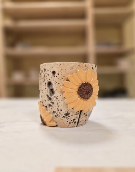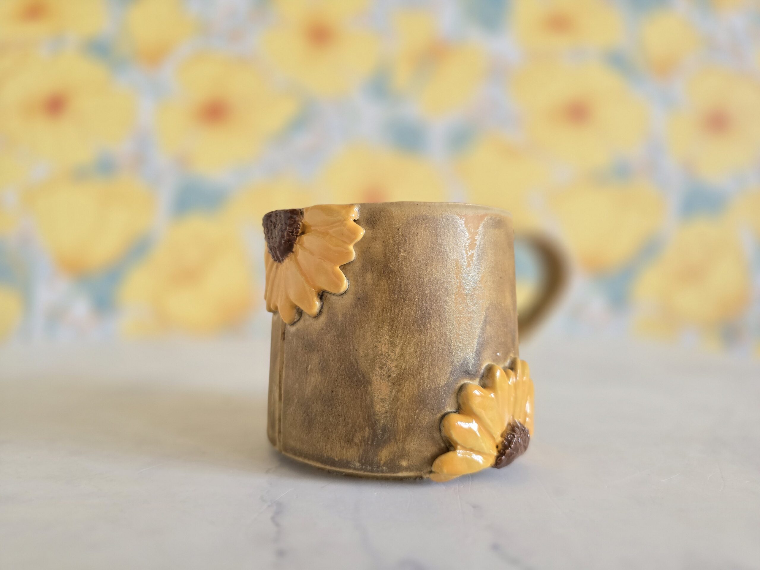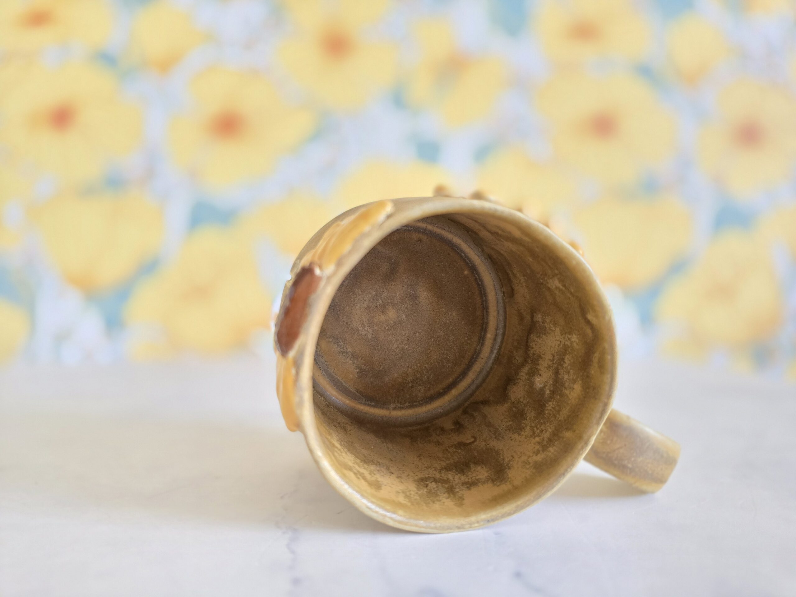 Koppen er dekoreret med håndmodellerede solsikker i relief, som giver struktur og liv hele vejen rundt. Den varme, brune glasur skaber dybde og et naturligt, jordnært udtryk, der fremhæver blomsterne smukt.