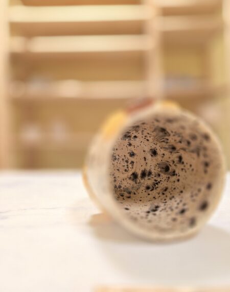 Denne specifikke kop er sat lidt ned i pris, da glasuren ligger en smule ujævnt enkelte steder. Det påvirker ikke funktionaliteten – koppen er fuldt anvendelig – men giver et mere råt og levende udtryk.